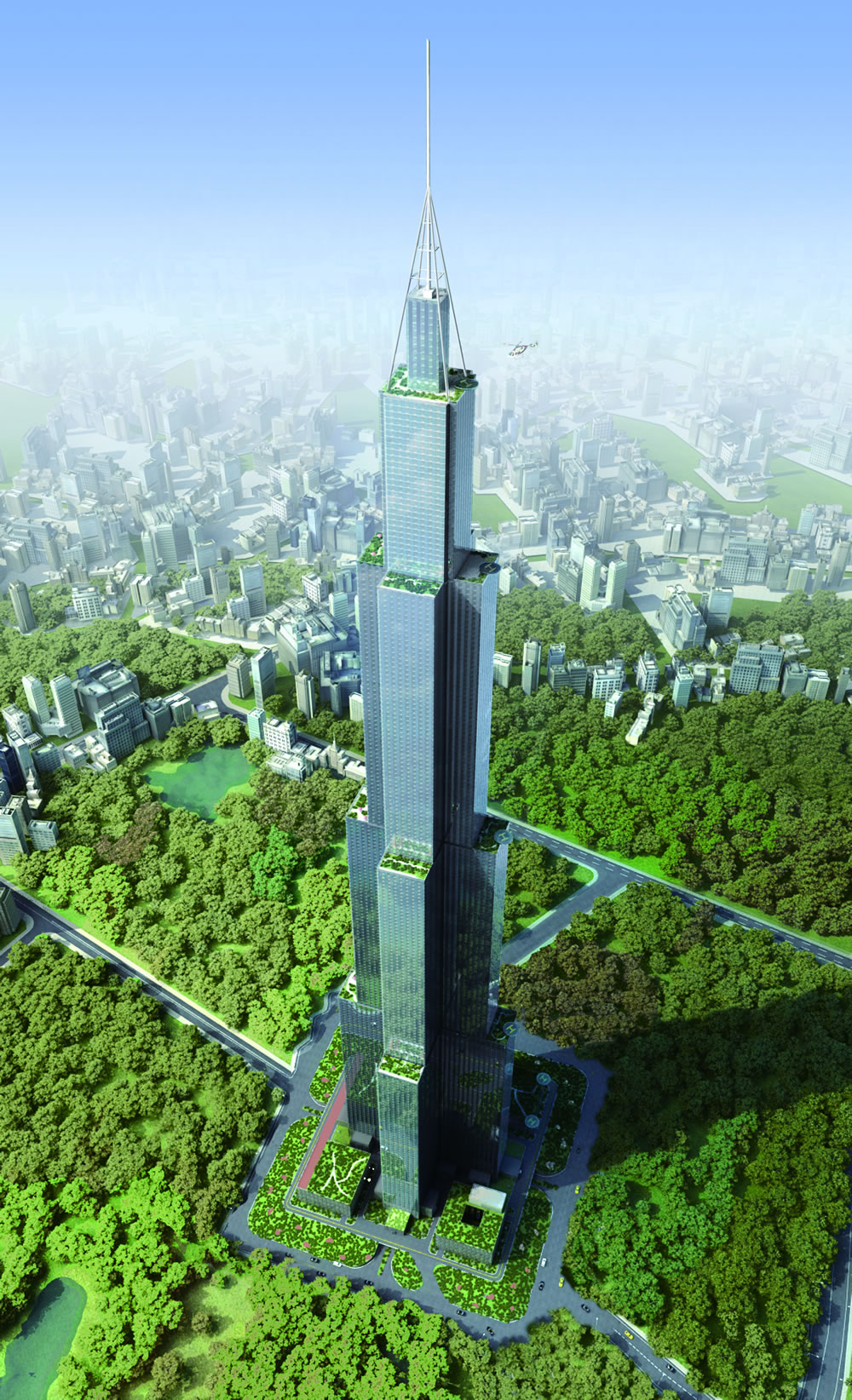 While many will no doubt question the claim based on the amount of energy and materials required for such a structure, Broad claims Sky City will be green. The firm lists a swarth of features to back up this claim, including a design it says is "five times more energy efficient than conventional buildings". They also mention quadruple-glazing, heat recovery ventilation, excellent indoor air quality, electricity-generating elevators and "the highest efficient of land use" as key features of the project.