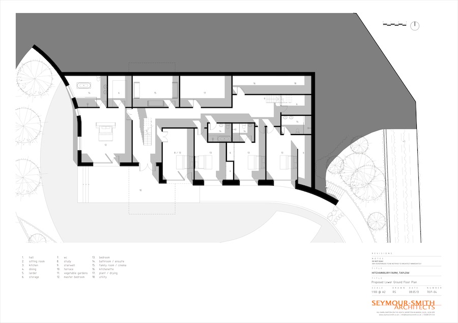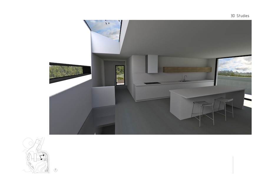 We came up with an upside-down layout for the house maximising the views to the south from the ‘daytime’ spaces (including kitchen, dining, sitting room and a study), and semi-submerging the ‘night-time’ spaces (bedrooms, cinema room, bathrooms) of the lower ground floor into the earth to minimise the visual impact of the house as a whole