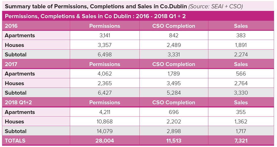The Central Statistics O�ffice (CSO) publishes an array of detailed information on new housing including planning permission data. Since 2016 in Co Dublin, 16,590 new estate homes and 11,414 apartments have been granted planning permission, a total of 28,004 units. Levels are increasing, leading many to assume that “activity in the construction sector is clearly now ramping up aggressively. Permissions are a valid but not reliable indicator of activity. For various reasons up to 40% of schemes never get built, the so-called ‘permissions gap’.  Completions and sales are accurate supply and demand metrics.