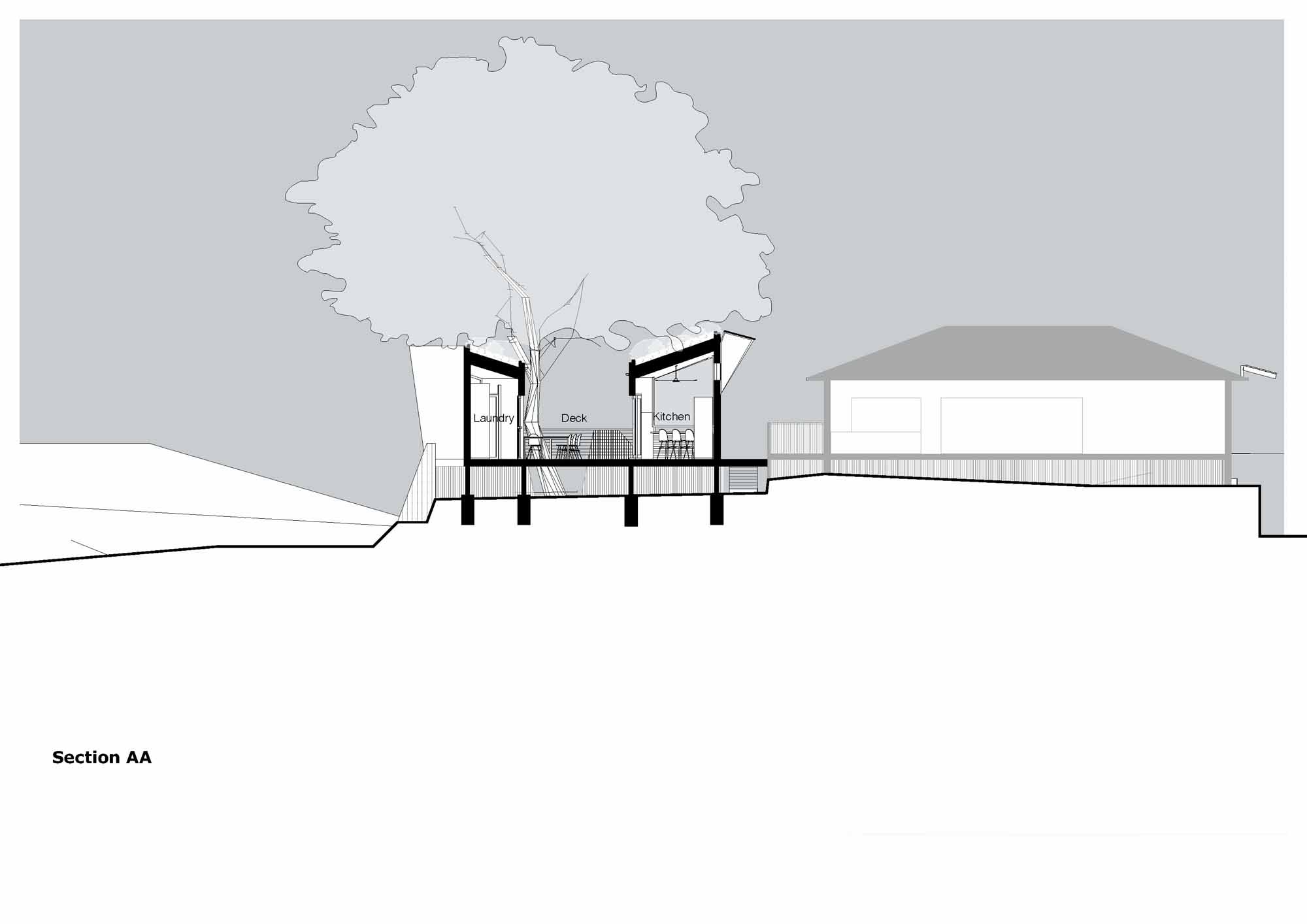 The more private southern wing contains the bedroom, laundry and bathroom, ensuring the total volume of the building is only as big as it needs to be to protect the existing pepper tree. The floating deck between the two wings has been carefully scribed around the pepper tree, providing a meditative retreat immersed in the tree canopy.