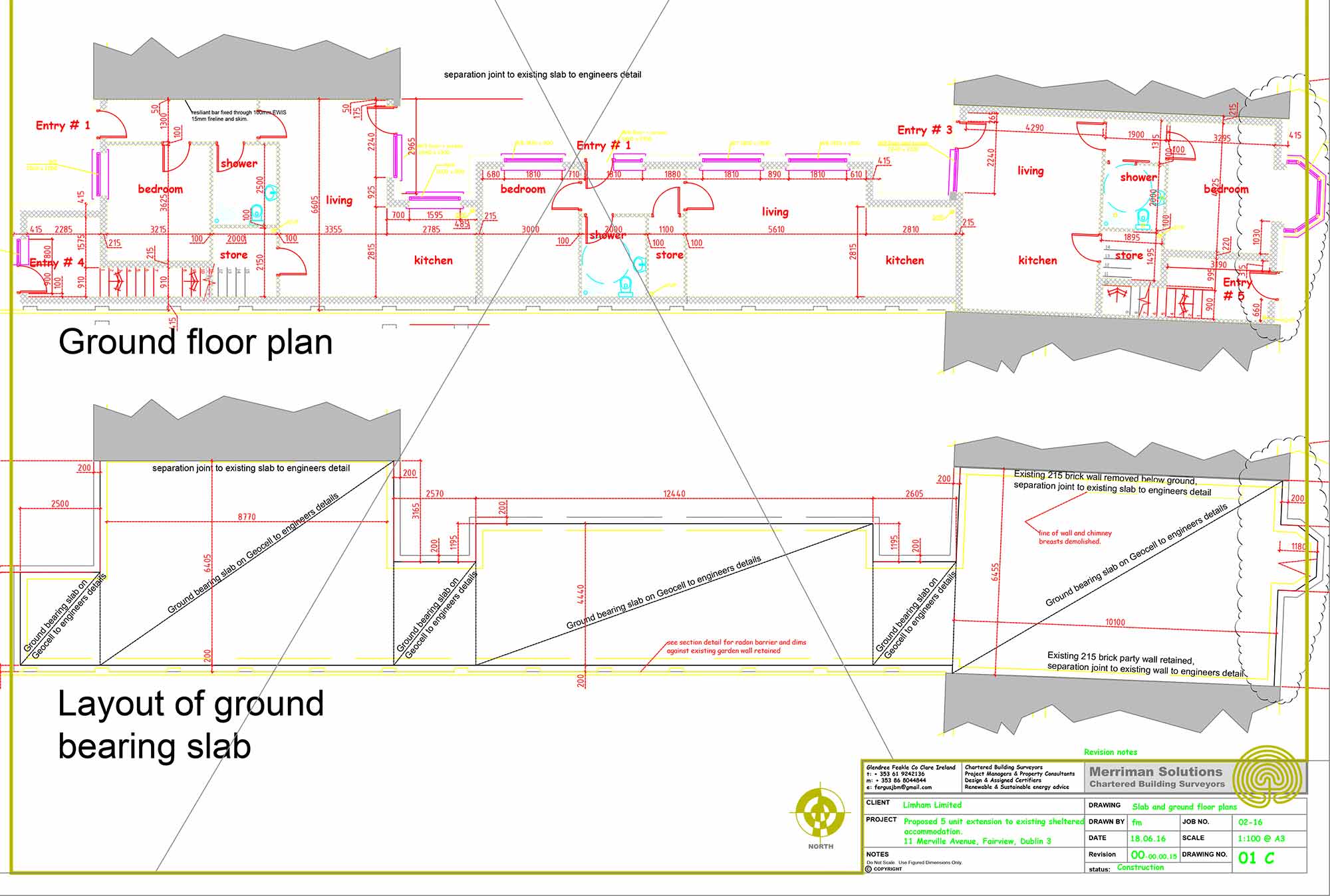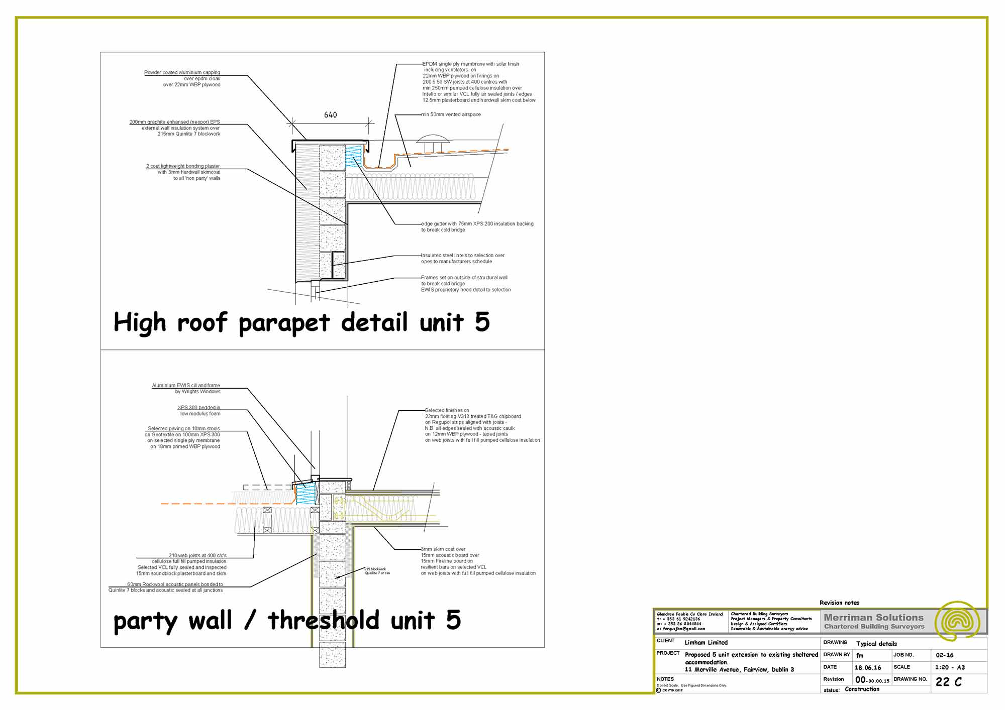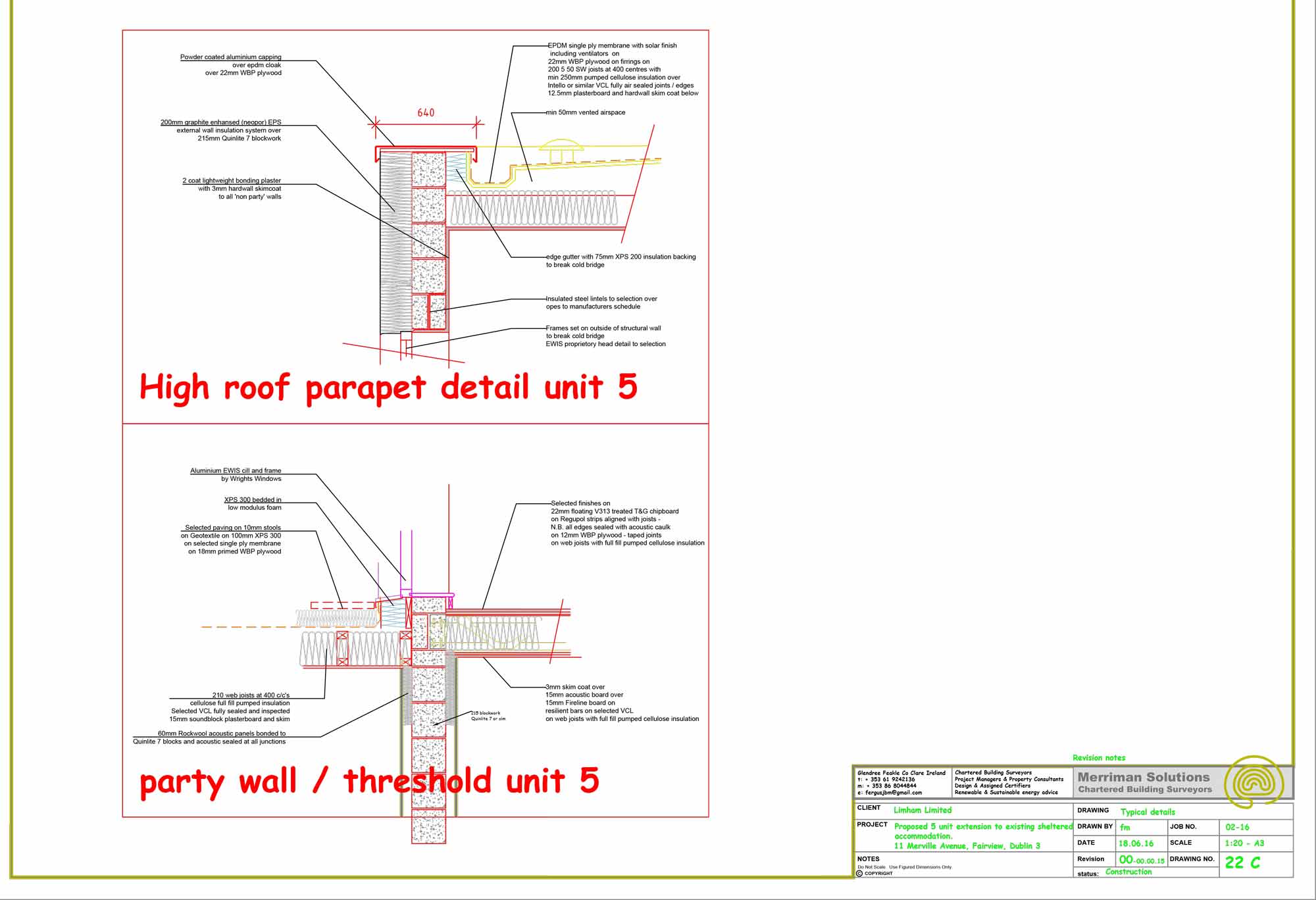 Walls: Kabe acrylic render system, followed inside by 200mm Xtratherm platinum EPS 100 insulation, 200mm Quinn Lite blocks (rendered internally for airtightness with taping at junction), battens & Gyproc plasterboard. Rockliner sound insulation used on compartment walls between apartments. U-value: 0.11 W/m2K