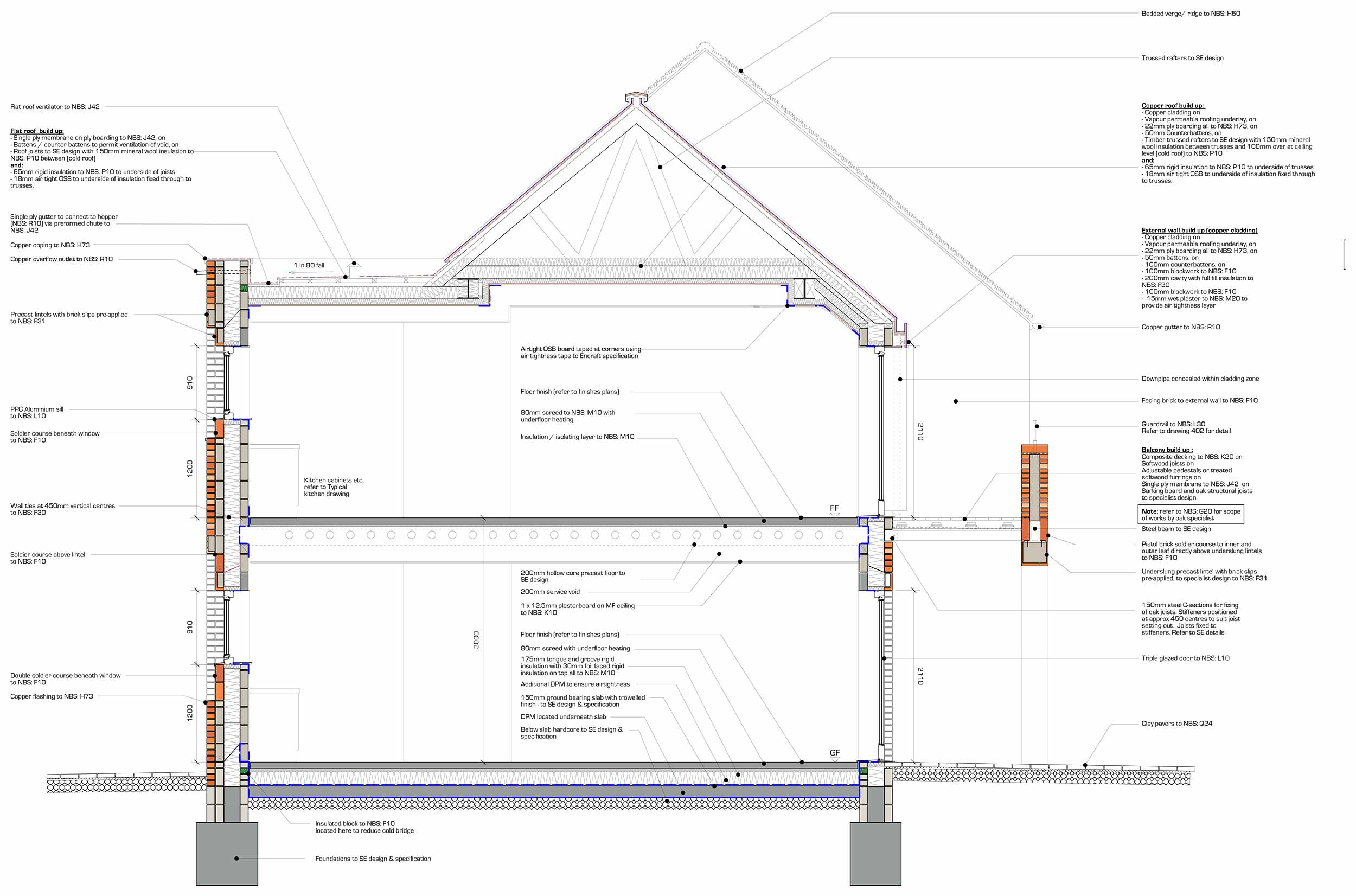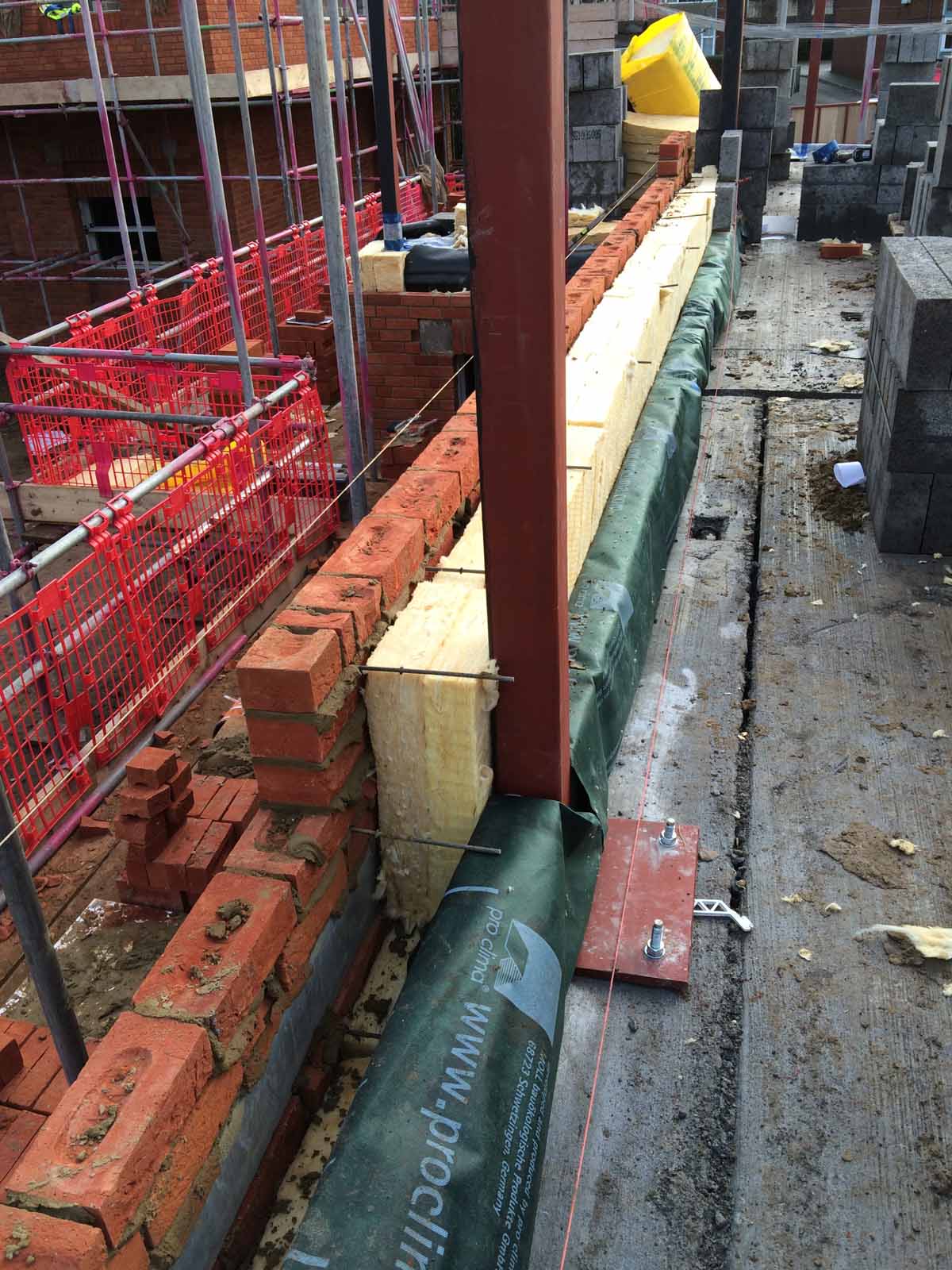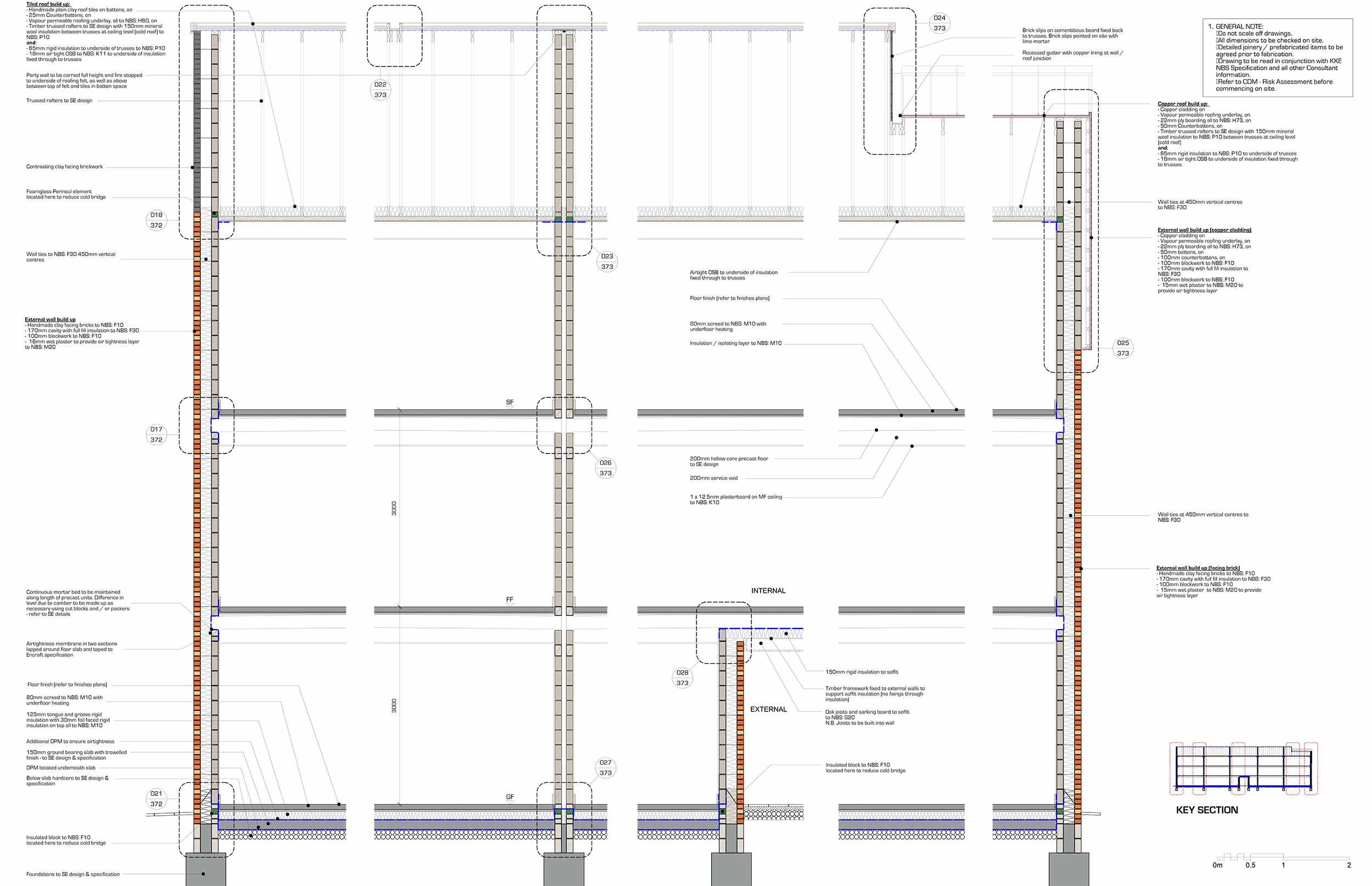 Wall build-up features brick outer leaf, followed inside by Isover mineral wool & Ancon TeploTie thermal wall ties in wall cavity, and Hemelite block internally