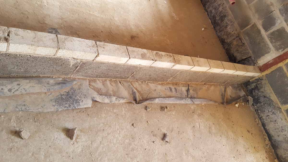 Areas of the blockwork wall above the ceiling void were not rendered (the render intended to be the airtightness layer here), and airtightness membranes behind internal partition walls were omitted.