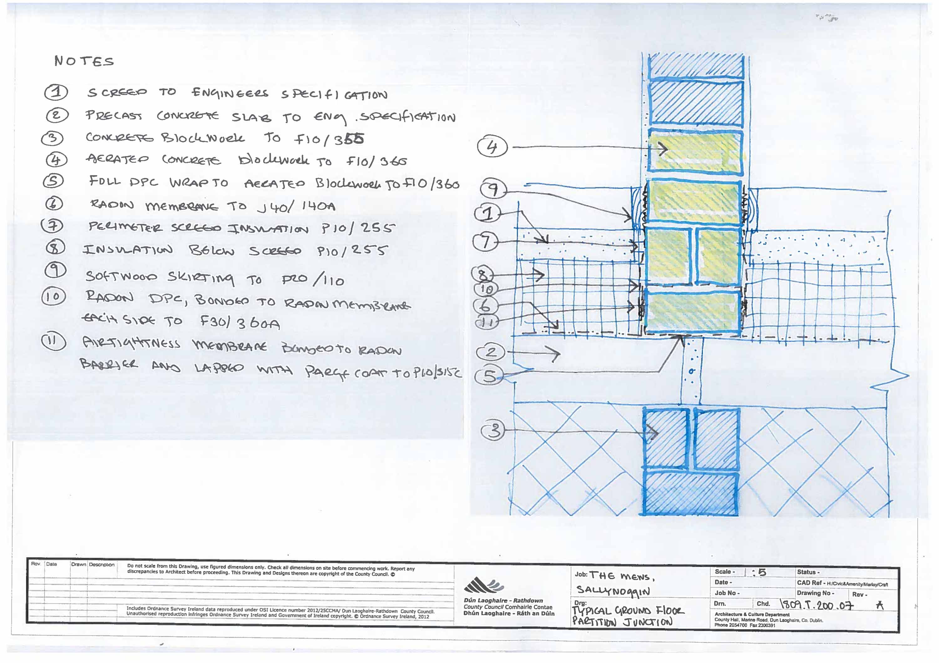 Ground floor: Screed on Xtratherm XT/UF rigid PIR insulation, on radon membrane, on precast concrete slab. U-value: 0.12 W/m2K. Strip foundation to perimeter of building.