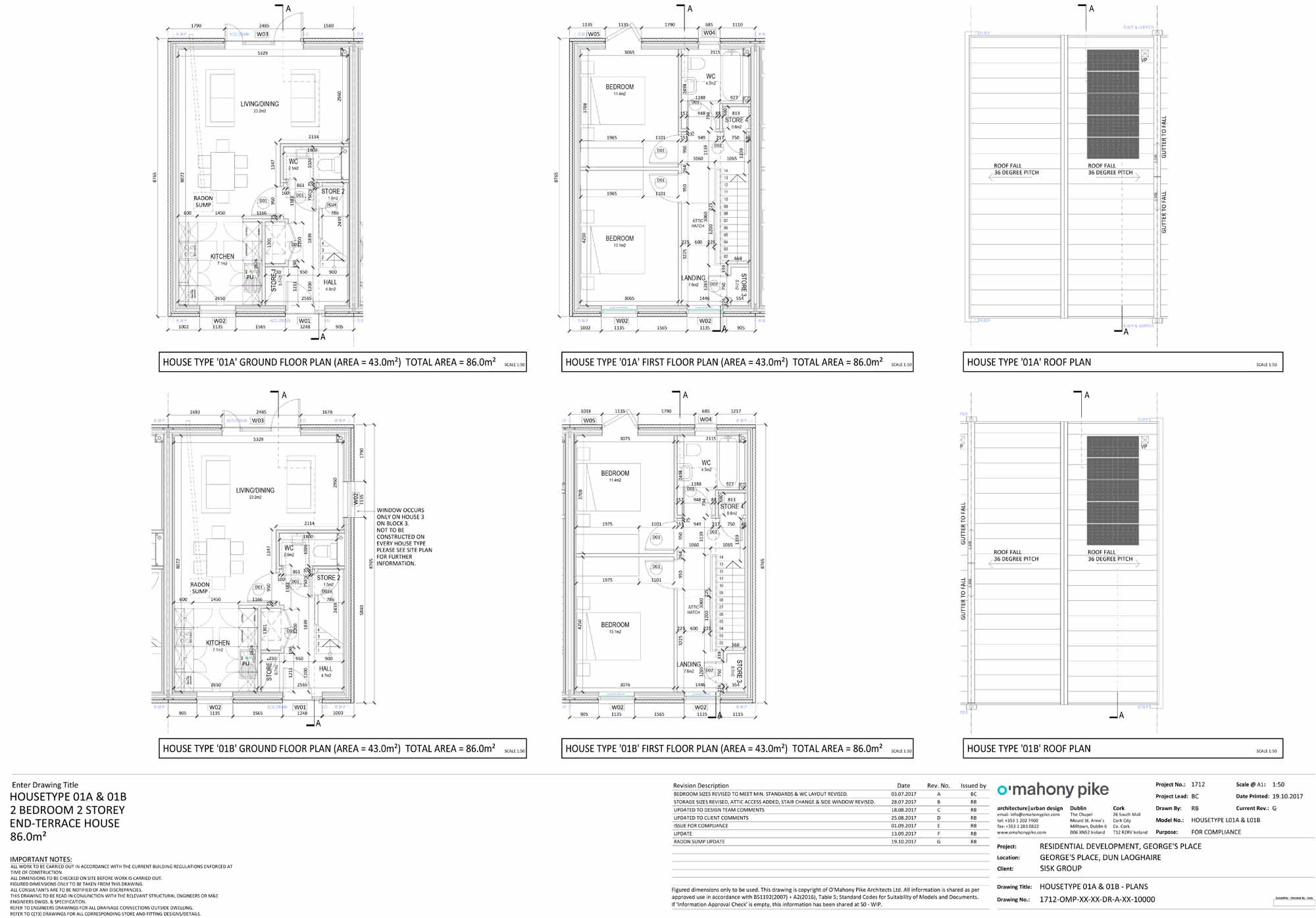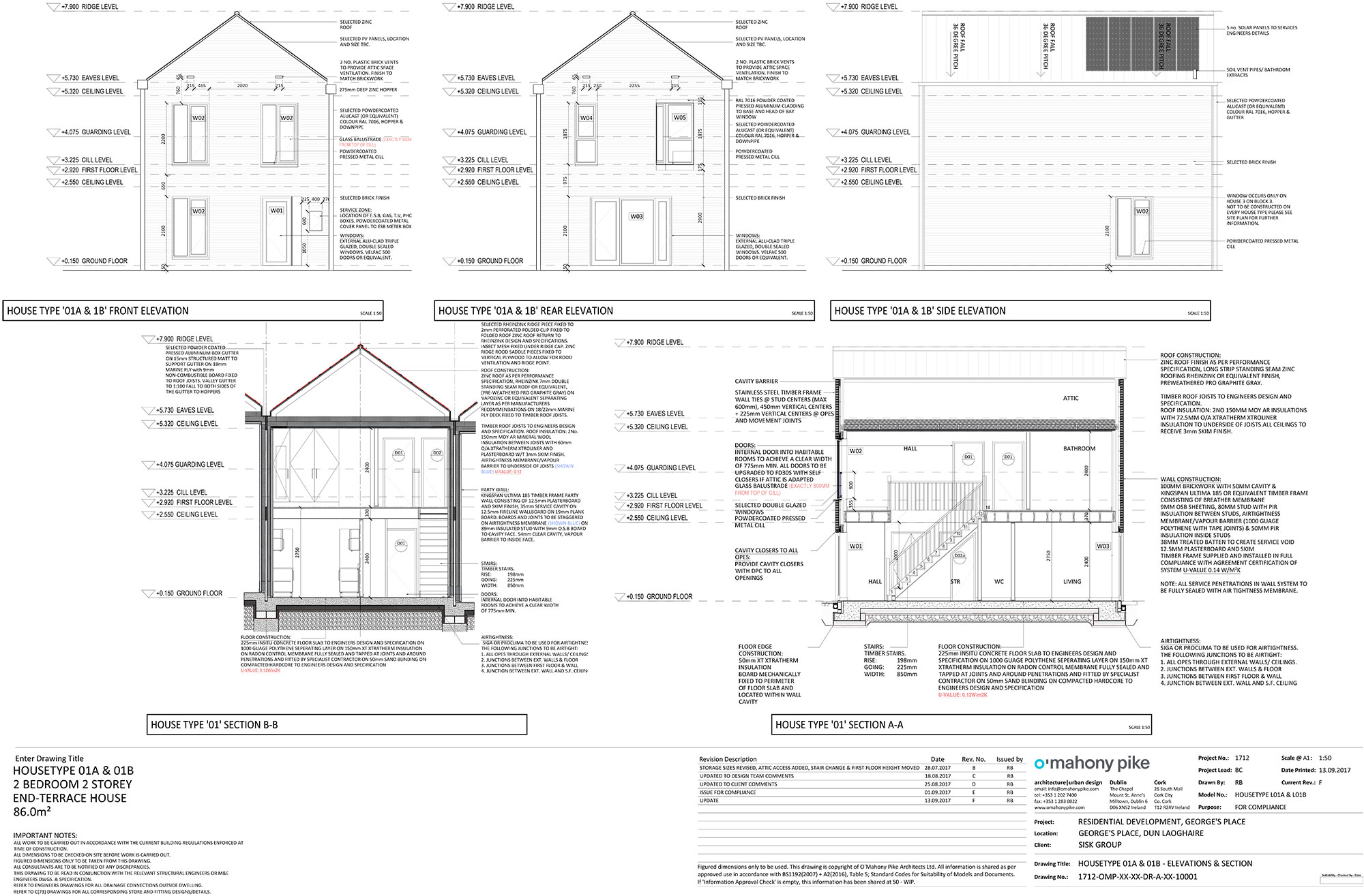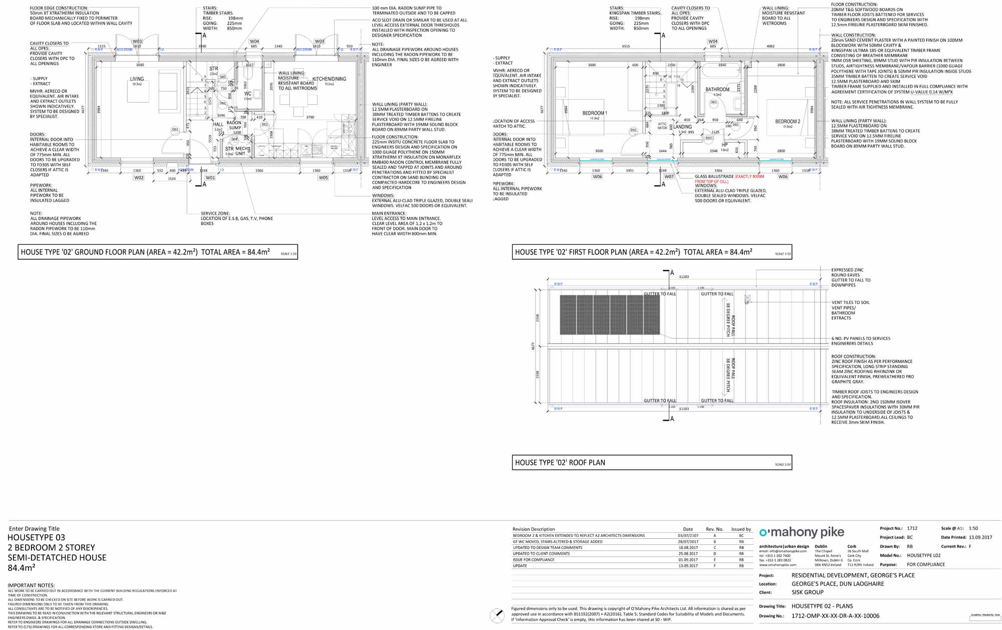 Walls: Outer leaf – ten units with Ivanhoe Cream Dark End brick, two units with 20mm Kilsaran GP Render externally followed inside by 100mm blockwork external leaf – 50mm cavity, Kingspan Ultima 185 timber frame consisting of breather membrane, 9mm OSB, 89mm studs with PIR insulation, airtightness/vapour control membrane, 50mm PIR insulation, 35mm timber battens to create service cavity, 12.5mm plasterboard and skim finish. U-value: 0.12 W/m2K