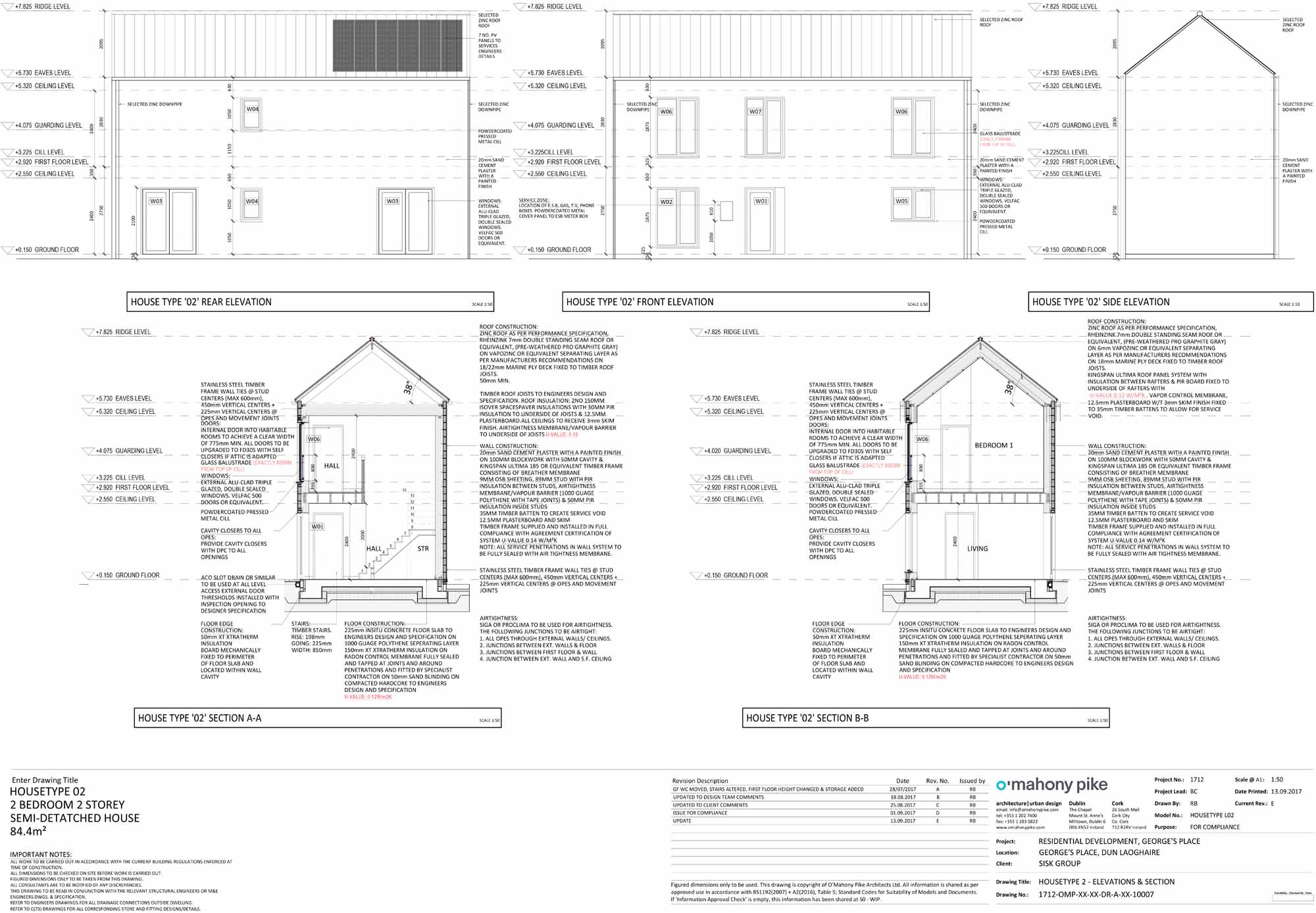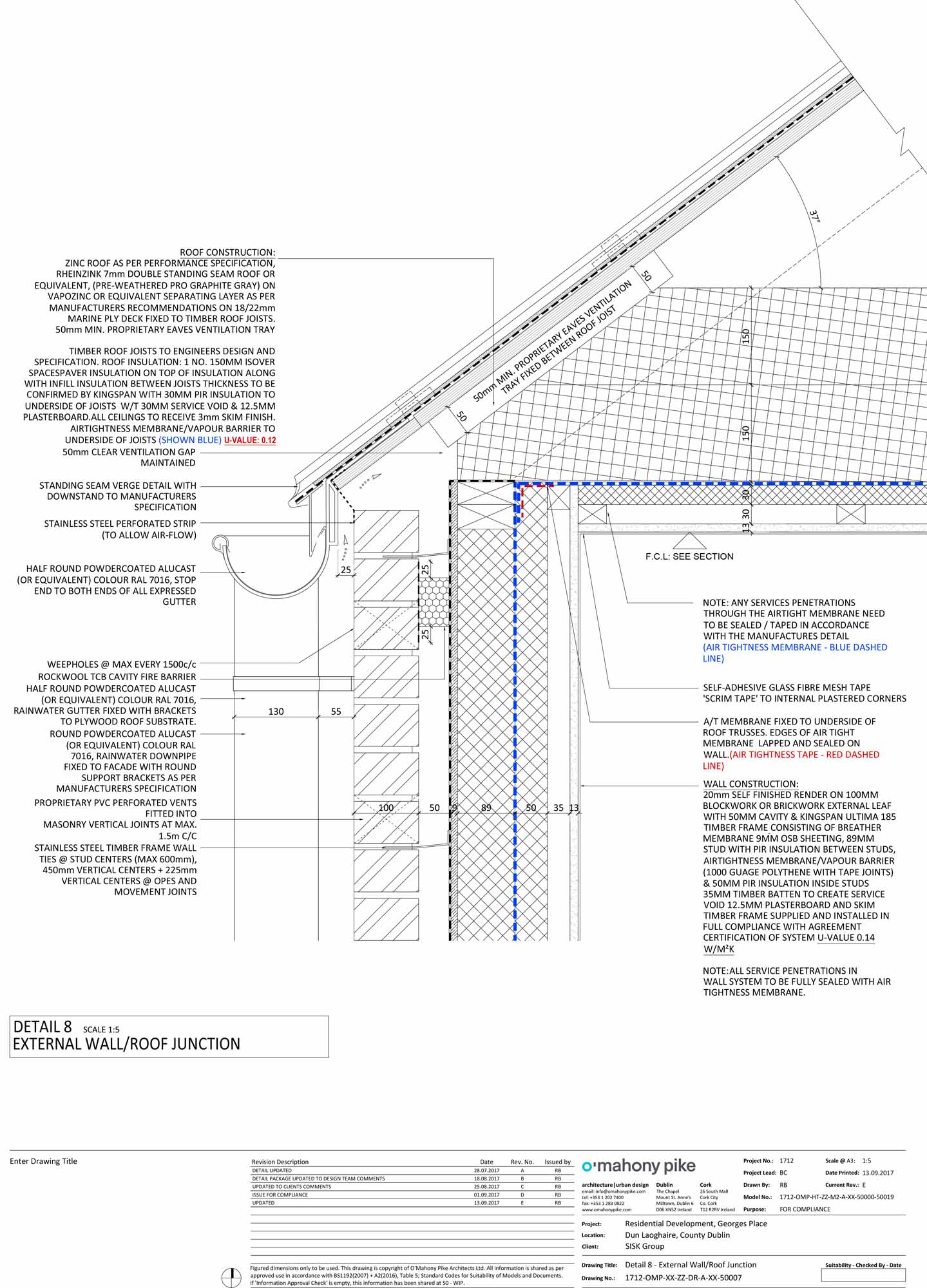 Roof: Zinc roof externally, followed beneath by 7mm double standing roof seam, on vapour-permeable separating layer/ underlay, on 18/22mm marine ply deck fixed to timber roof joists. Min 50mm proprietary eaves ventilation try. Roof insulated at ceiling level with 150mm Knauf Earthwool insulation above and between joists, followed beneath by airtightness/vapour control membrane, 30mm Kingspan PIR insulation, 30mm service void and 12.5mm plasterboard/skim finish to all ceilings. U-value: 0.12 W/m2K