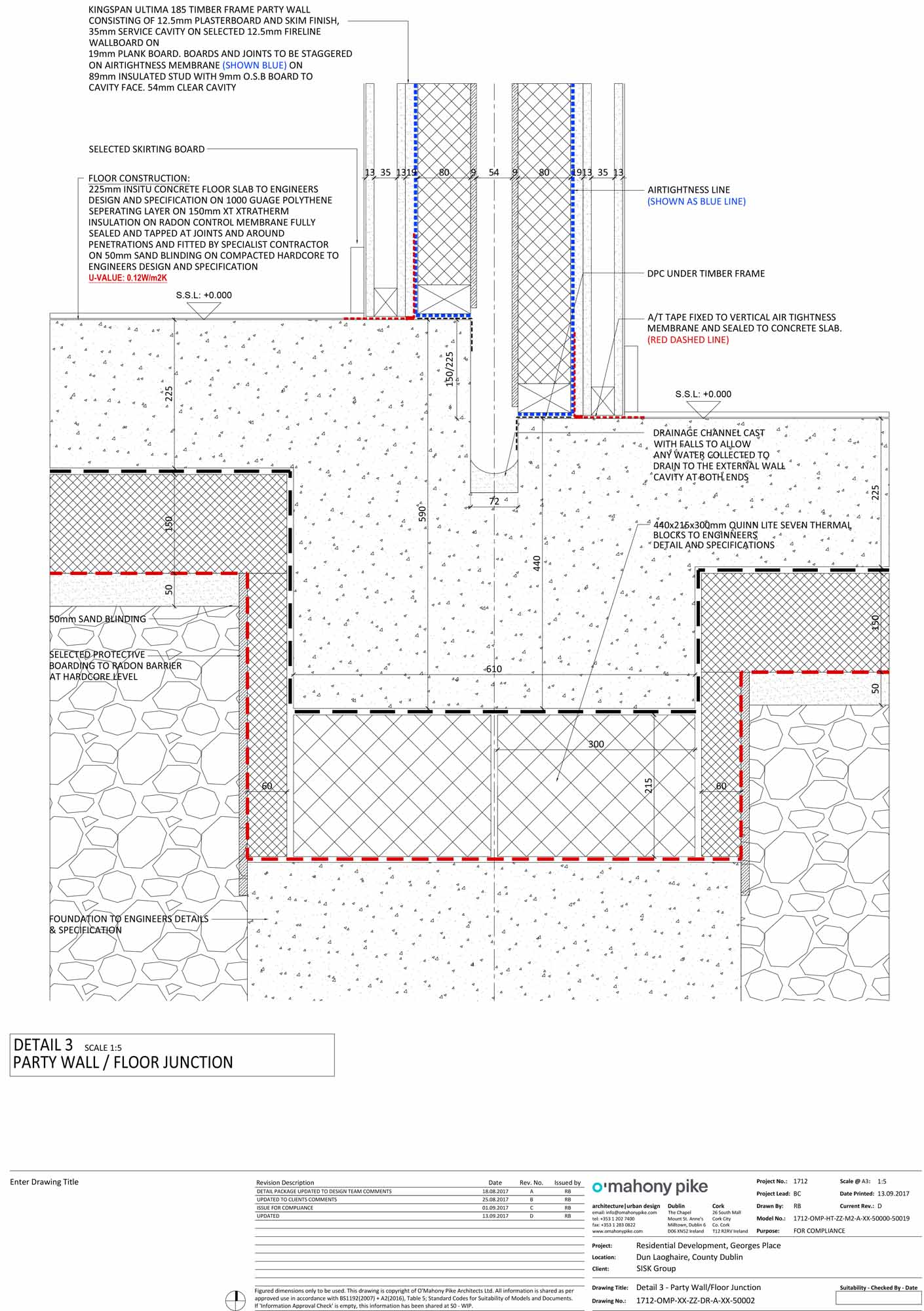 Thermal bridging: Kingspan Ultima wall system designed to minimise thermal bridging. Two courses of Quinn Lite AAC blocks used in subfloors at perimeters and party walls. Y-values of between 0.0119 and 0.0307.