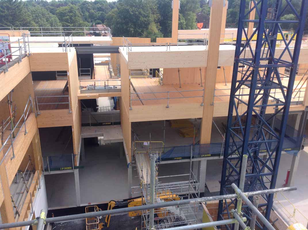 Green materials: KLH PEFC-certified cross laminated timber, Douglas Fir cladding all from FSC certified sources, concrete with 60 per cent GGBS content, long-life copper cladding with recycled content, cellulose insulation from recycled newspaper, green roof system, magnesium oxide boards, Tarkett DESSO loose lay carpet tiles, OSMO Polyx Oil.