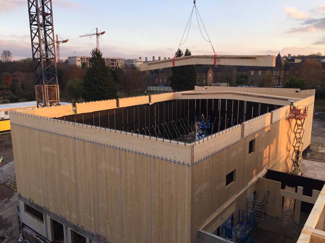 A concrete ground floor was needed because the level of the site changes from one end of the building to the other by a height of one storey. The concrete ground floor serves partly as a retaining wall, and together with the first-floor slab it provides a platform on which to construct the cross laminated timber (CLT) structure above.