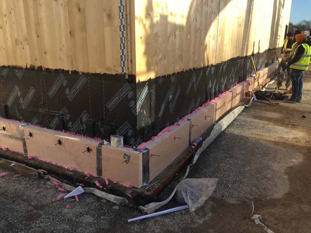 Low thermal conductivity Ancon TeploTies visible here protruding through foam insulation before installation of brick cladding