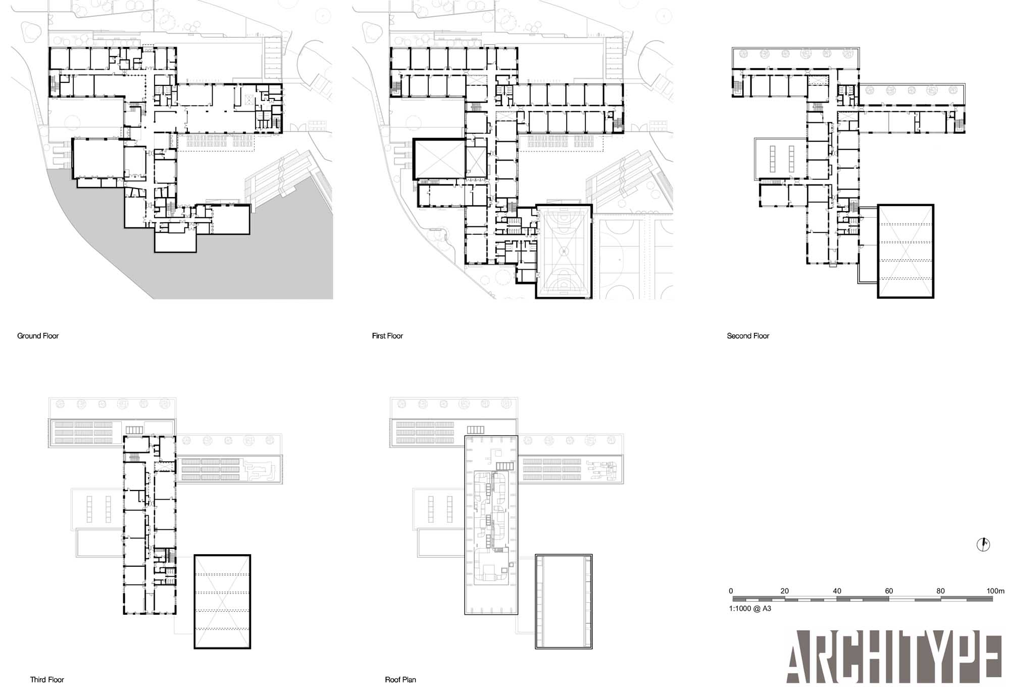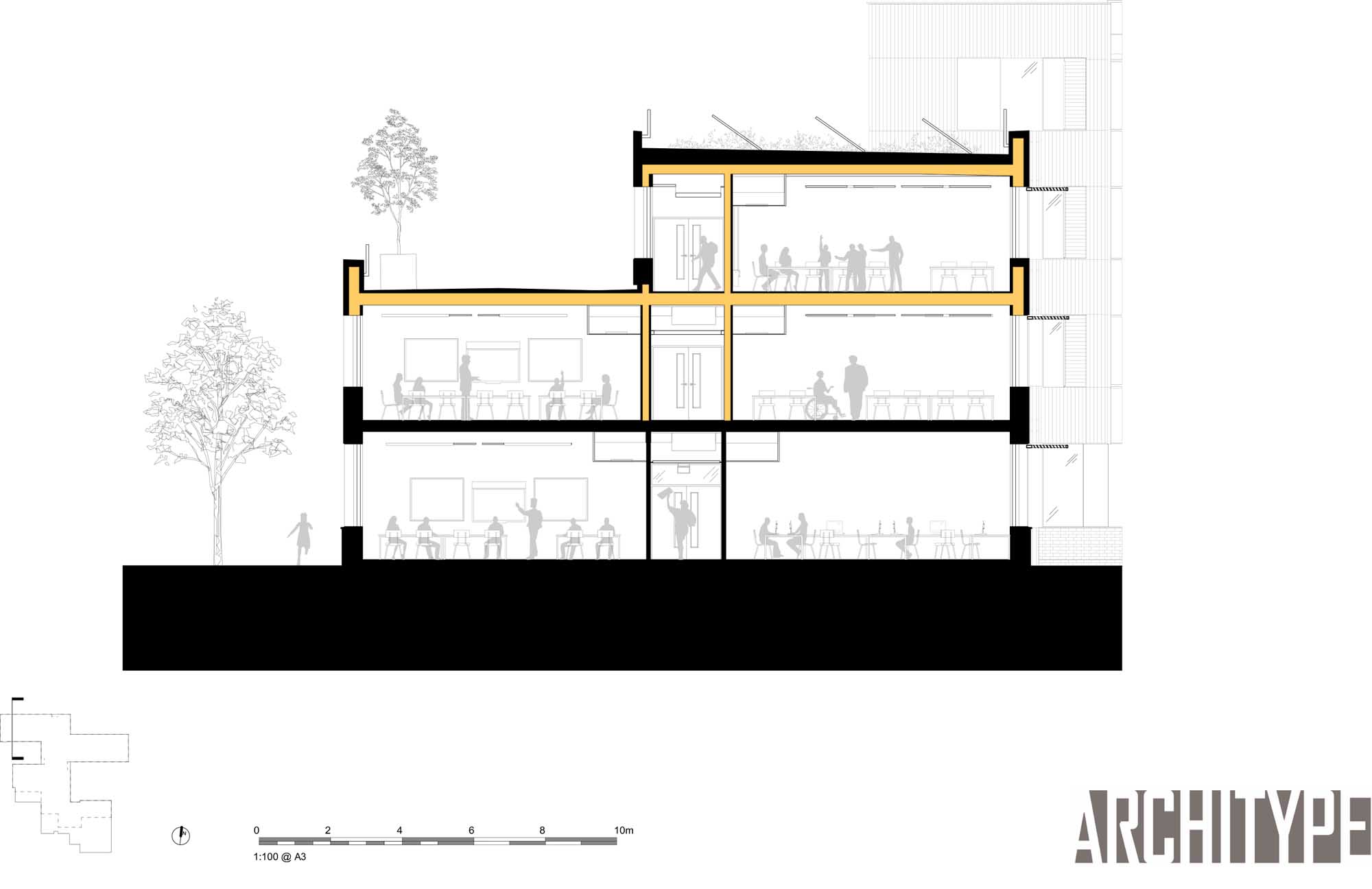 But there were concerns about the impact of an imposing four-storey building on adjacent low-rise homes and the Architype team was asked to redesign some elements. “We had to accept the east-west classroom arrangements needed some adjustments as they created overshadowing of school courtyards and residential housing,” said Dimbleby.