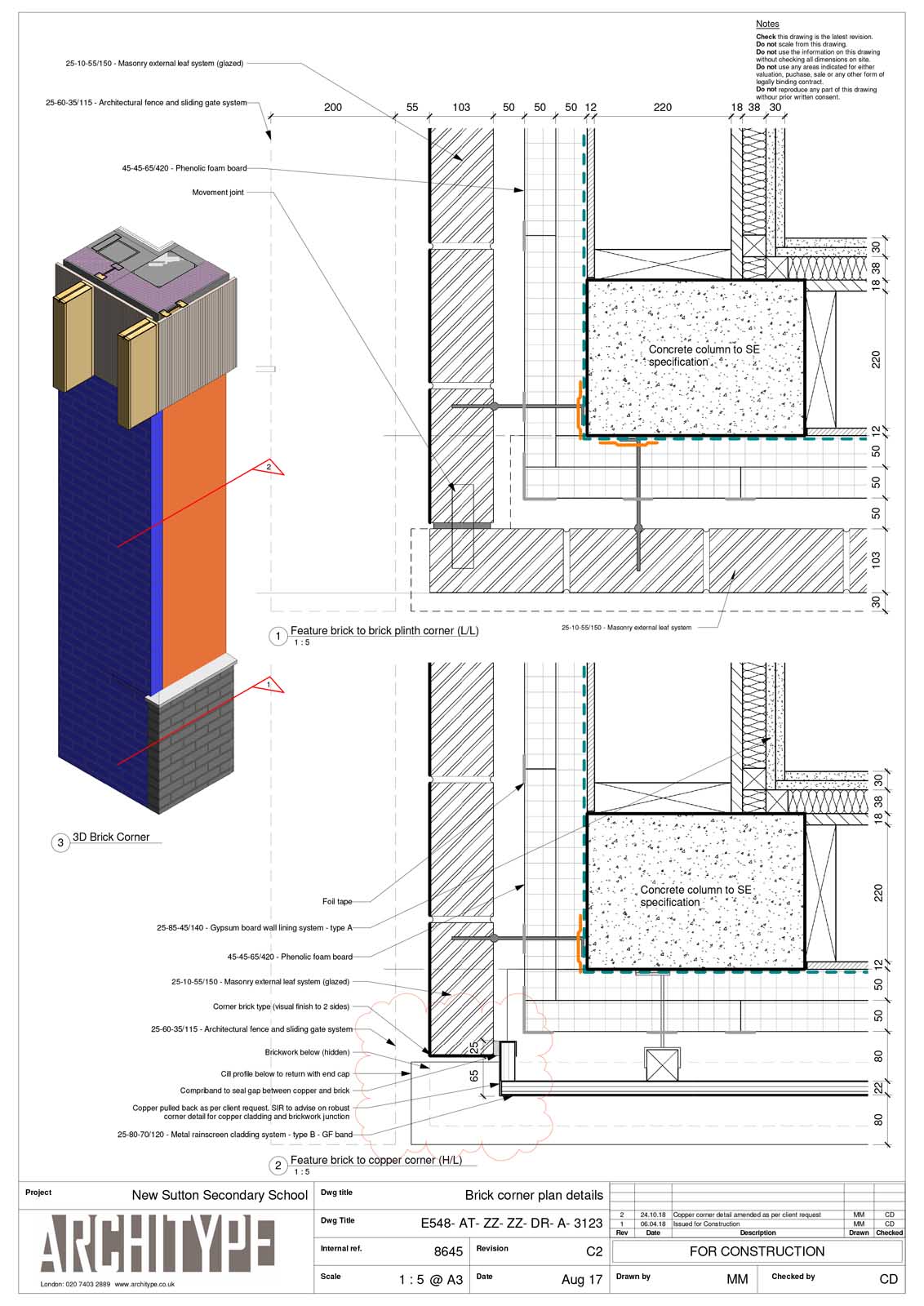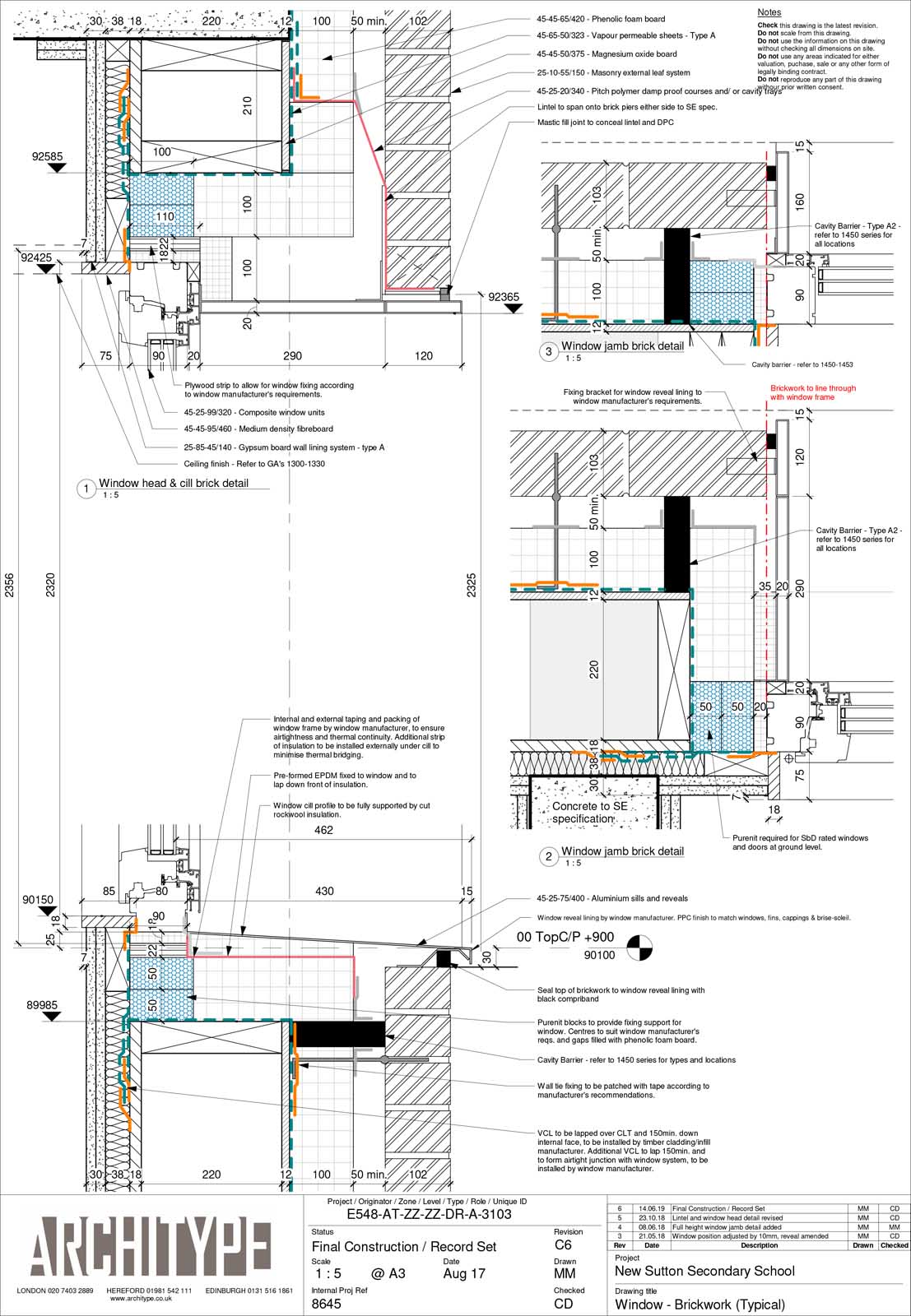 Thermal bridging: Bespoke details developed to avoid thermal bridges across the external envelope based upon Architype’s experience of delivering passive schools. Where not possible to omit, thermal bridge calculations were done using Psi-Therm & Psi-Therm 3D, e.g. chi-value calculation was done for metal fi xings required for large vertical fins. Thermal bridge & temperature checks done for window details & critical ground details.