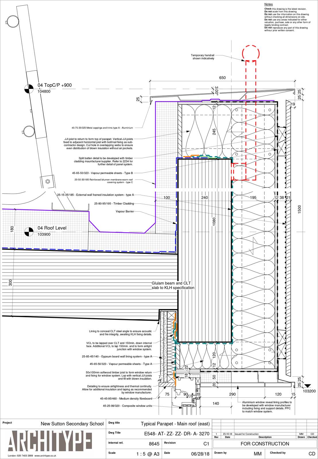 Roof: Soprema reinforced bitumen membrane warm roof covering system (front wings have green roof) with tapered (PIR) & 180 mm uniform (EPS) insulation roof boards underneath, followed below by vapour control layer on 300 mm cross laminated timber exposed structural deck. U-value: 0.11 W/m2K (average tapered & uniform insulation).