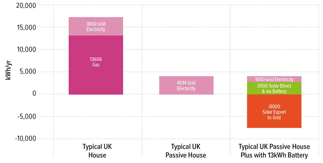 2. Potential 75 per cent reduction of annual electricity demand from the national electricity grid of an all-electric passive house plus with battery, compared to an all-electric classic passive house (and up to 94 per cent reduction in annual metered energy demand from gas and electricity when compared to a typical UK home, as derived from ECUK data). Potential to produce approximately ten times as much renewable energy in a year as the building imports from the grid, and the potential to export over twice as much renewable electricity to the national grid or a local microgrid in a year, compared to its own use. This performance has not been achieved at Lark Rise due to unusual user occupancy, but performance so far at The Brambles does support the results shown in the graph (figure 2).