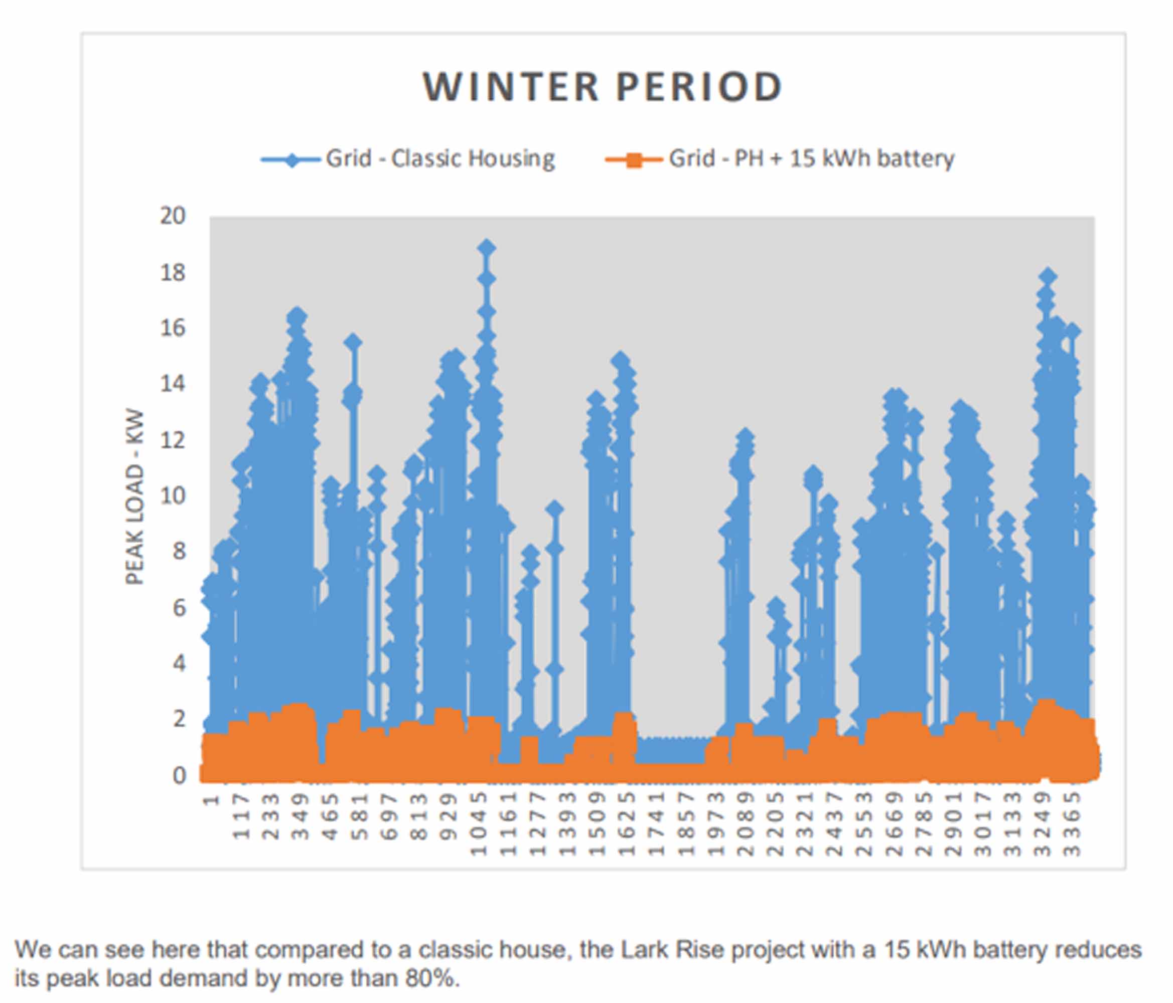 Figure 1 We can see here that compared to a classic house, the Lark Rise project with a 15kWh battery reduces its peak load demand by more than 80 per cent.