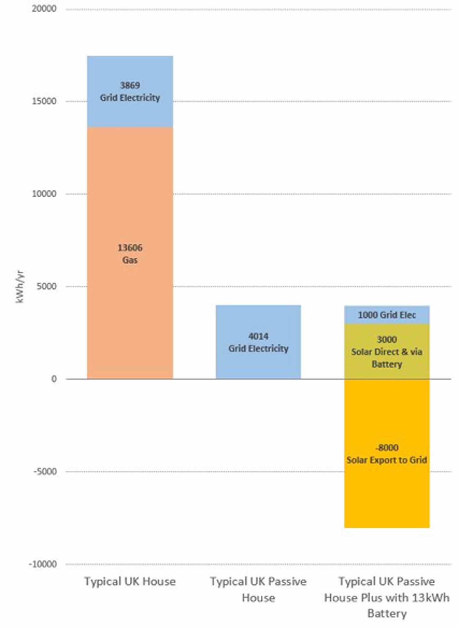 So, we either need the national grid to store renewable electricity for us, as a kind of public service, and then urgently supply it whenever our homes cry out for it, or else we can design our buildings to demand- shift. The fabric of a passive house enables demand shifting of heat, even in periods of prolonged cold weather, and domestic hot water thermal storage can also help (by increased storage capacity and increased tank temperature).