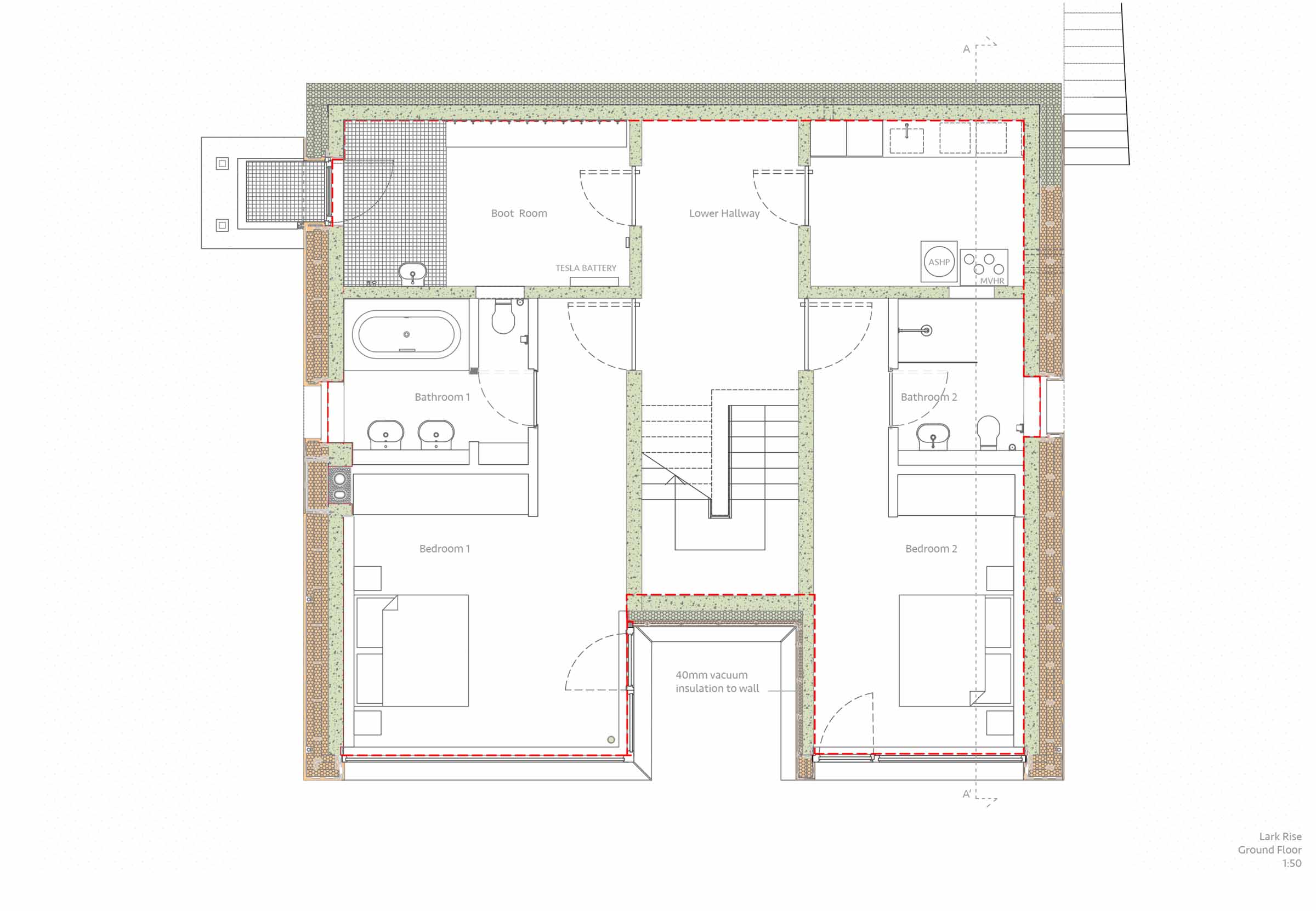 Green materials: All timber is untreated and sustainably sourced. All interior finishes are non-toxic and VOC-free.