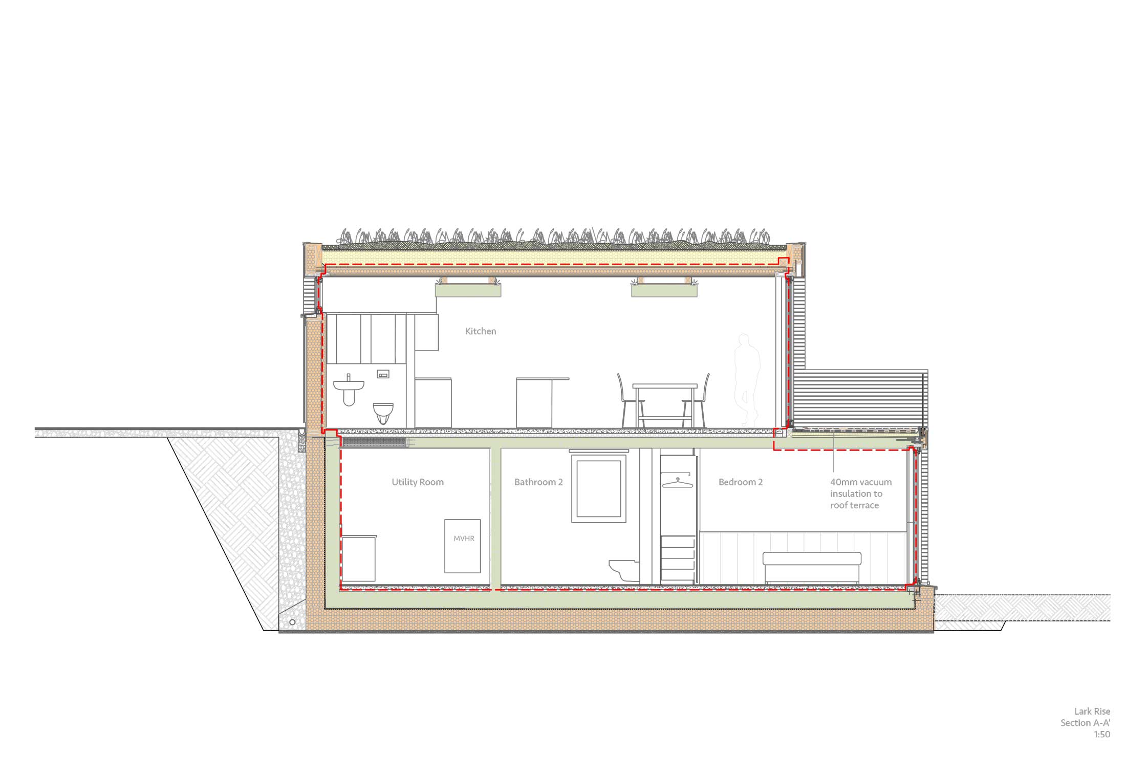 Lark Rise is a split-level dwelling in rural Buckinghamshire, designed by bere:architects and certified to the passive house plus standard. It is of timber frame construction resting on concrete ground floor walls, part of which serve as a retaining wall.
