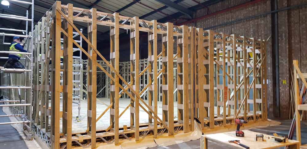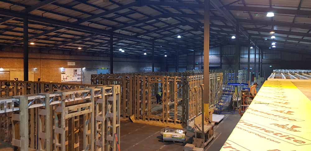 The Ferry Road timber frame under construction in the Beattie Passive factory