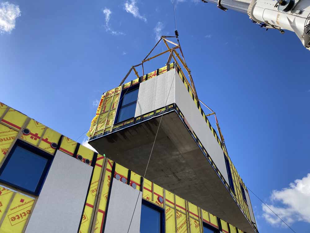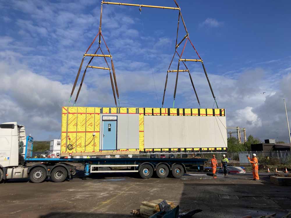 The modular build system arriving on site and being lifted into place