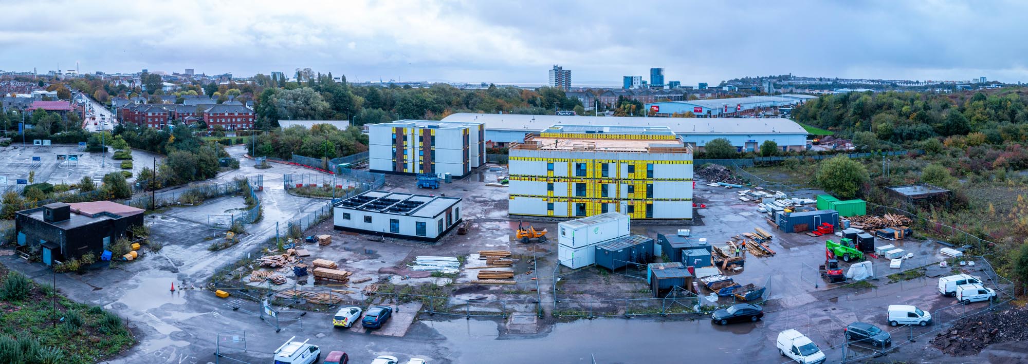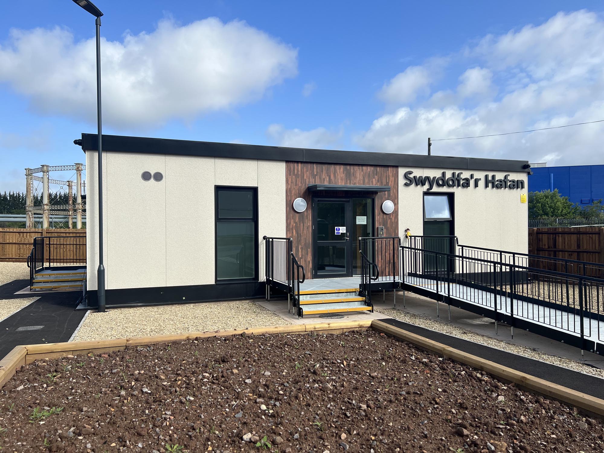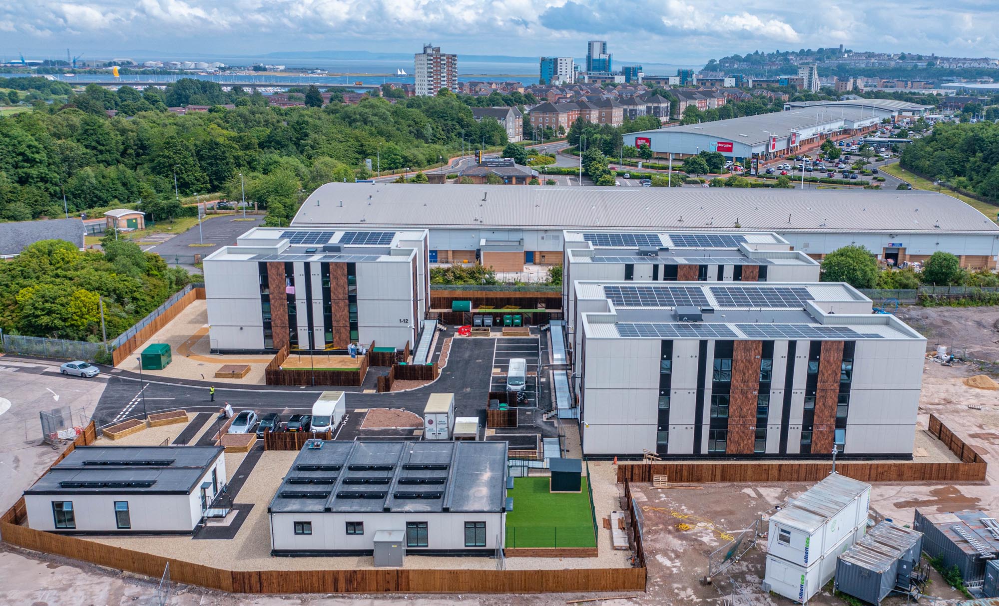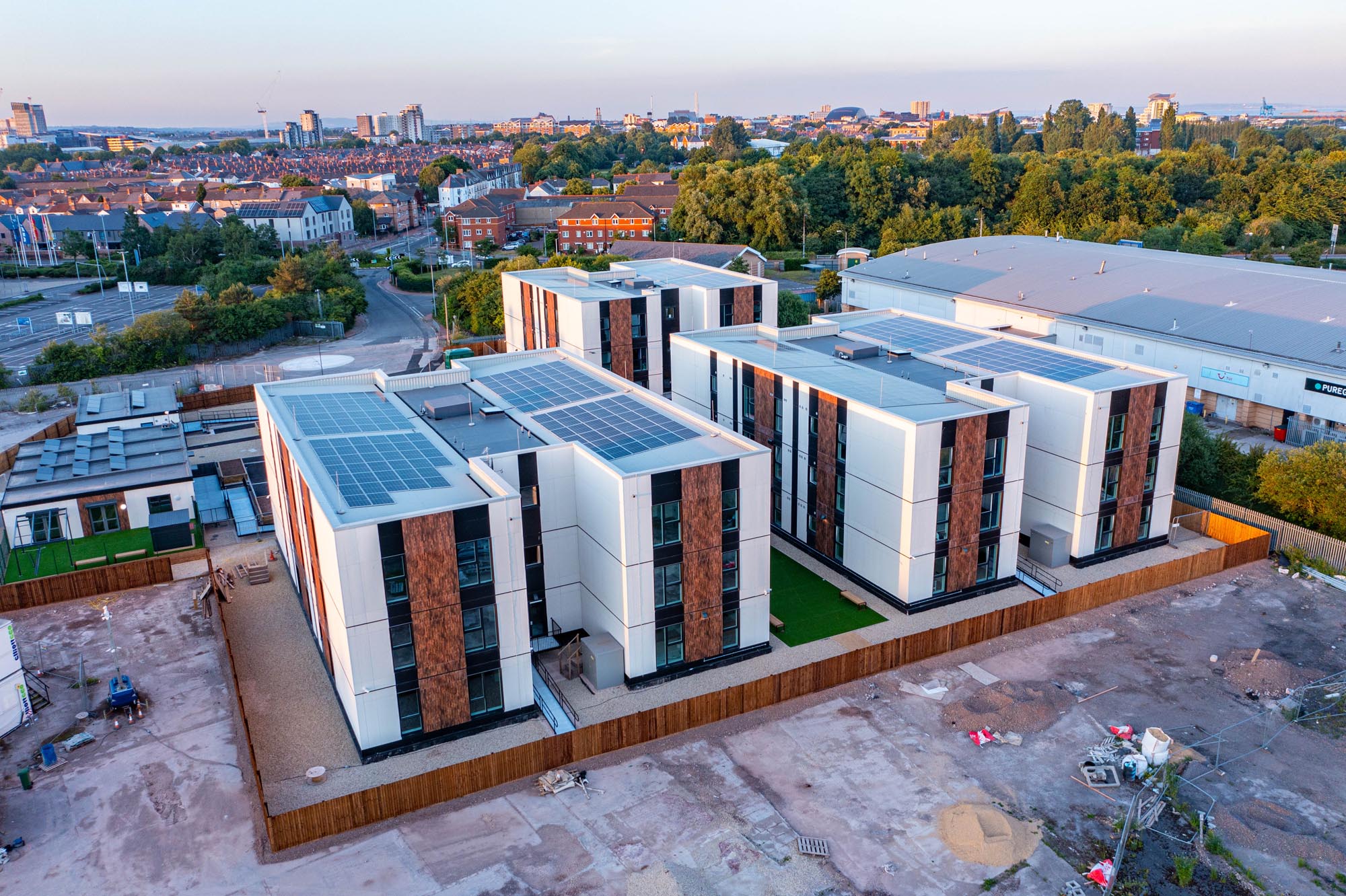 Hafan at Ferry Road, Cardiff is a modular volumetric development of forty-eight homes with two ancillary support and office blocks, commissioned by Cardiff Council in response to the urgent need for high quality, temporary housing for homeless families in Cardiff. Cardiff Council is providing full wraparound support services.