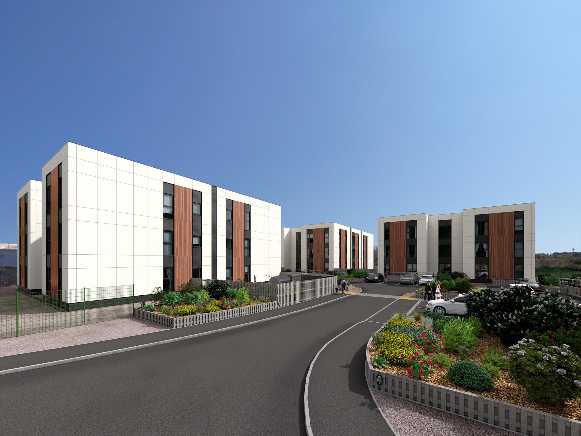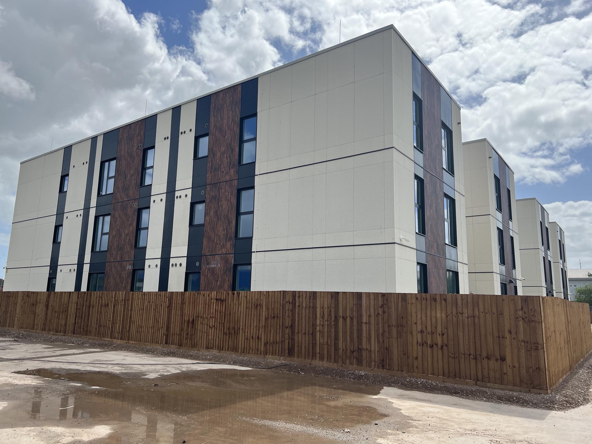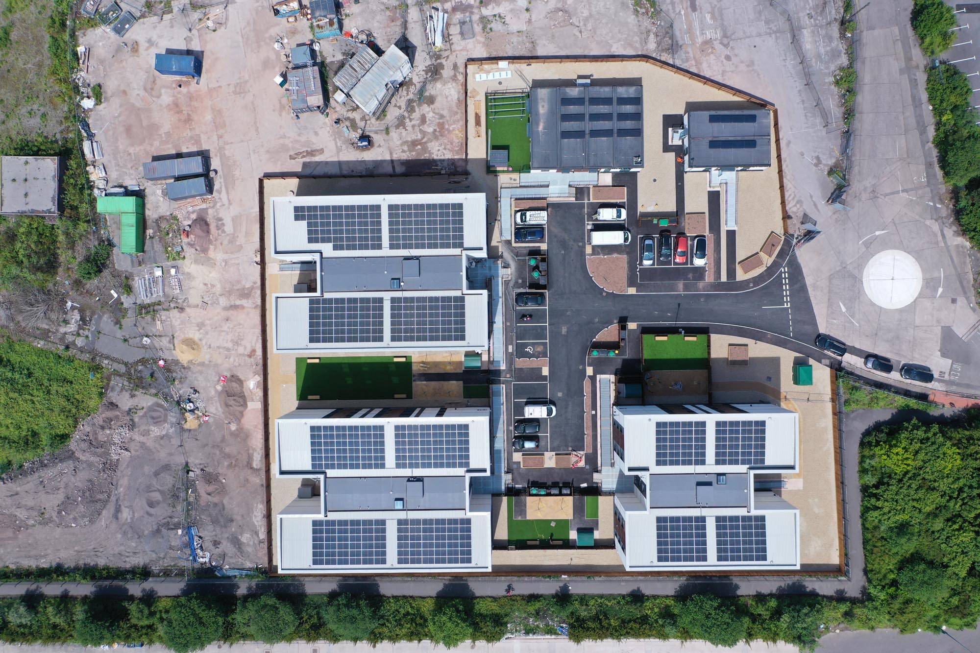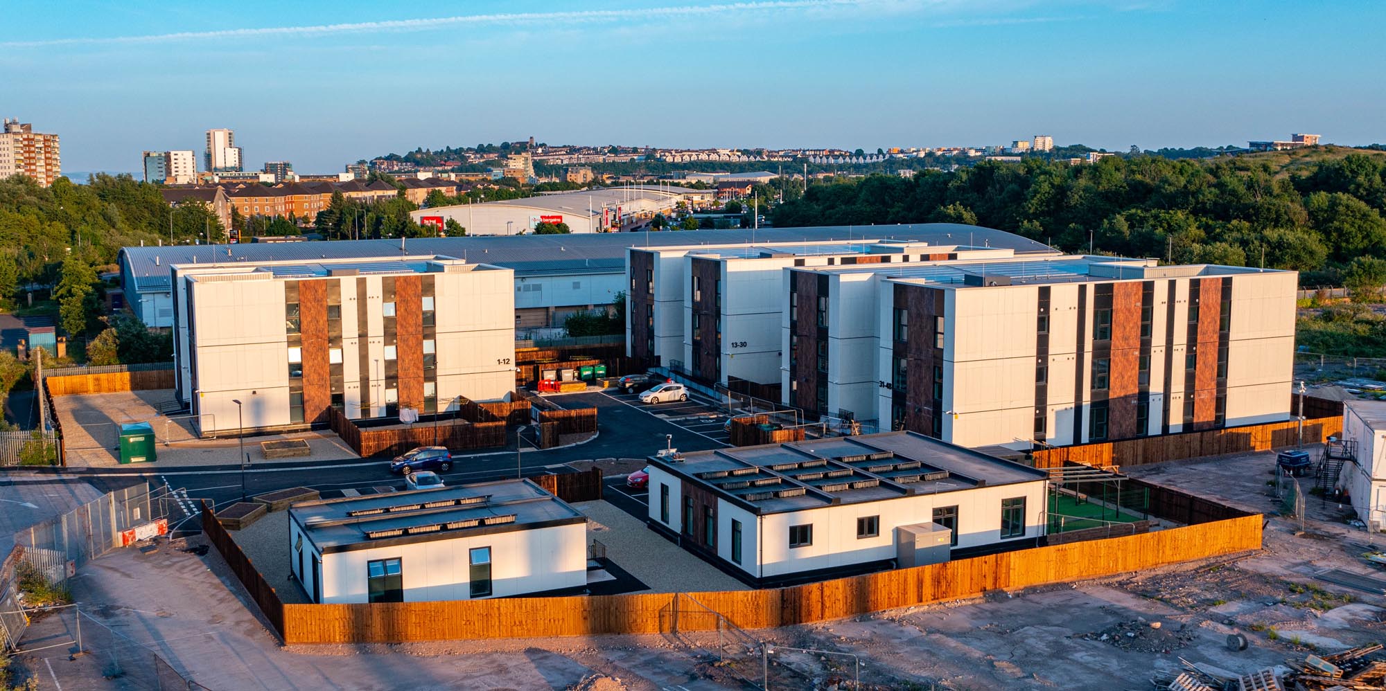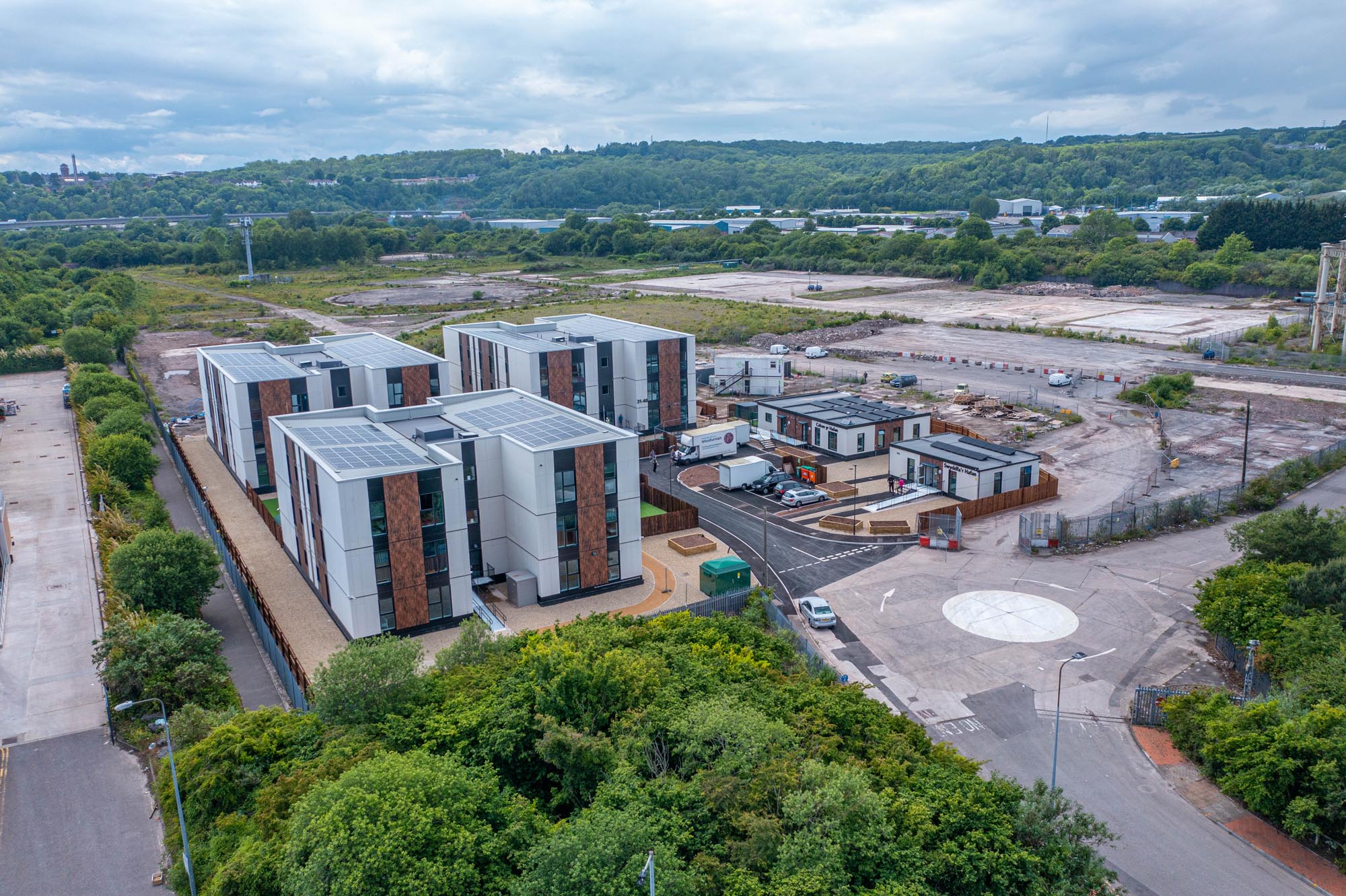 Building type: 48 volumetric modular one, two and three-bedroom apartments in three-storey blocks, plus two ancillary blocks housing an office block, training room, training kitchen, a 24/7 medical office and a crèche.