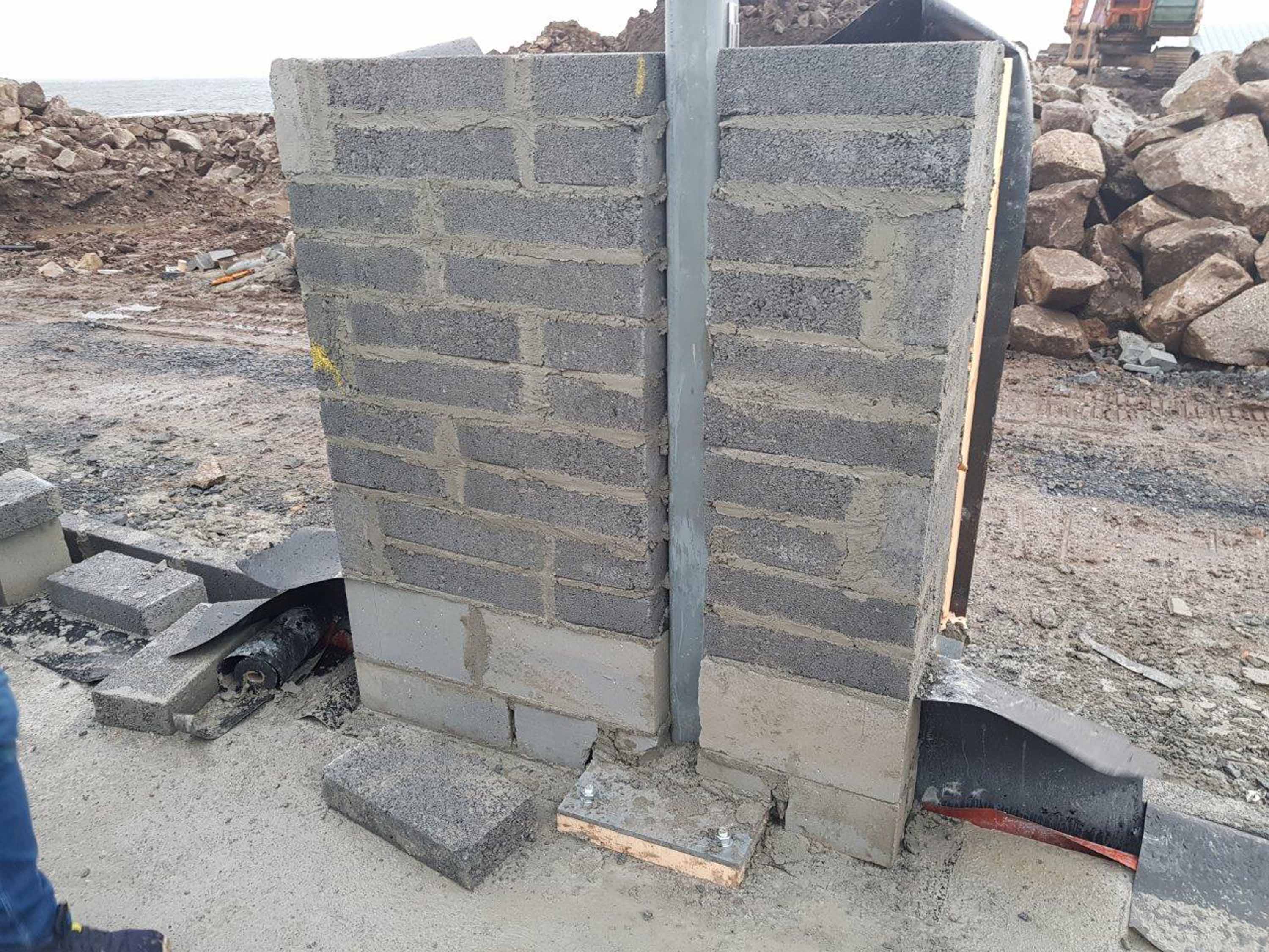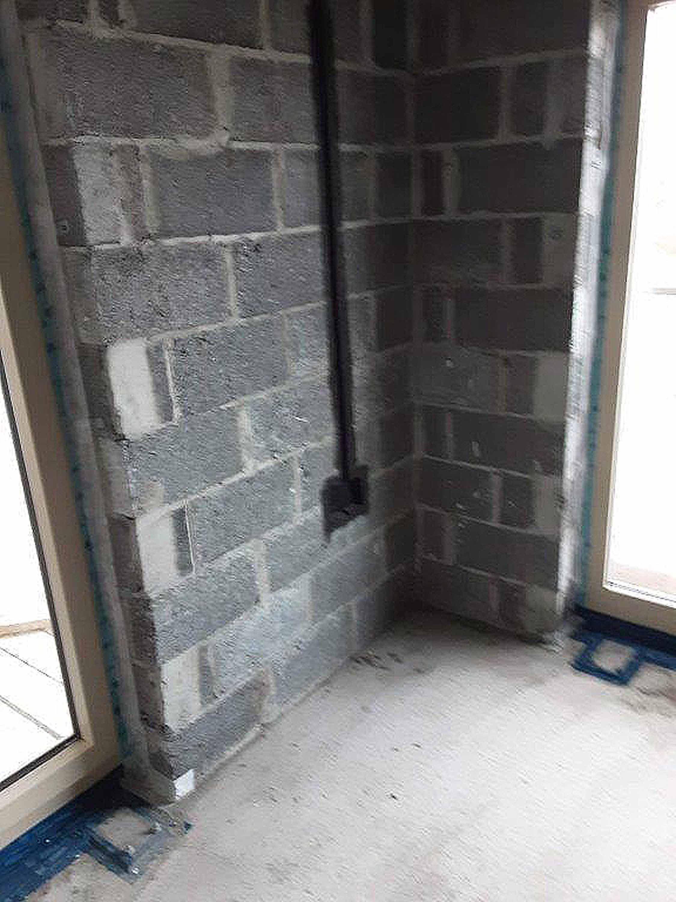 Walls: External sand / cement render, followed inside by 100 mm blockwork, 200 mm cavity pumped with EnviroBead Plus EPS Bead insulation (0.033 W/mK), 100 mm blockwork, internal plaster finish (airtight layer). U-value: 0.155 W/m2K (thermal bridges and from wall ties were calculated and included in the U-Value calculation).