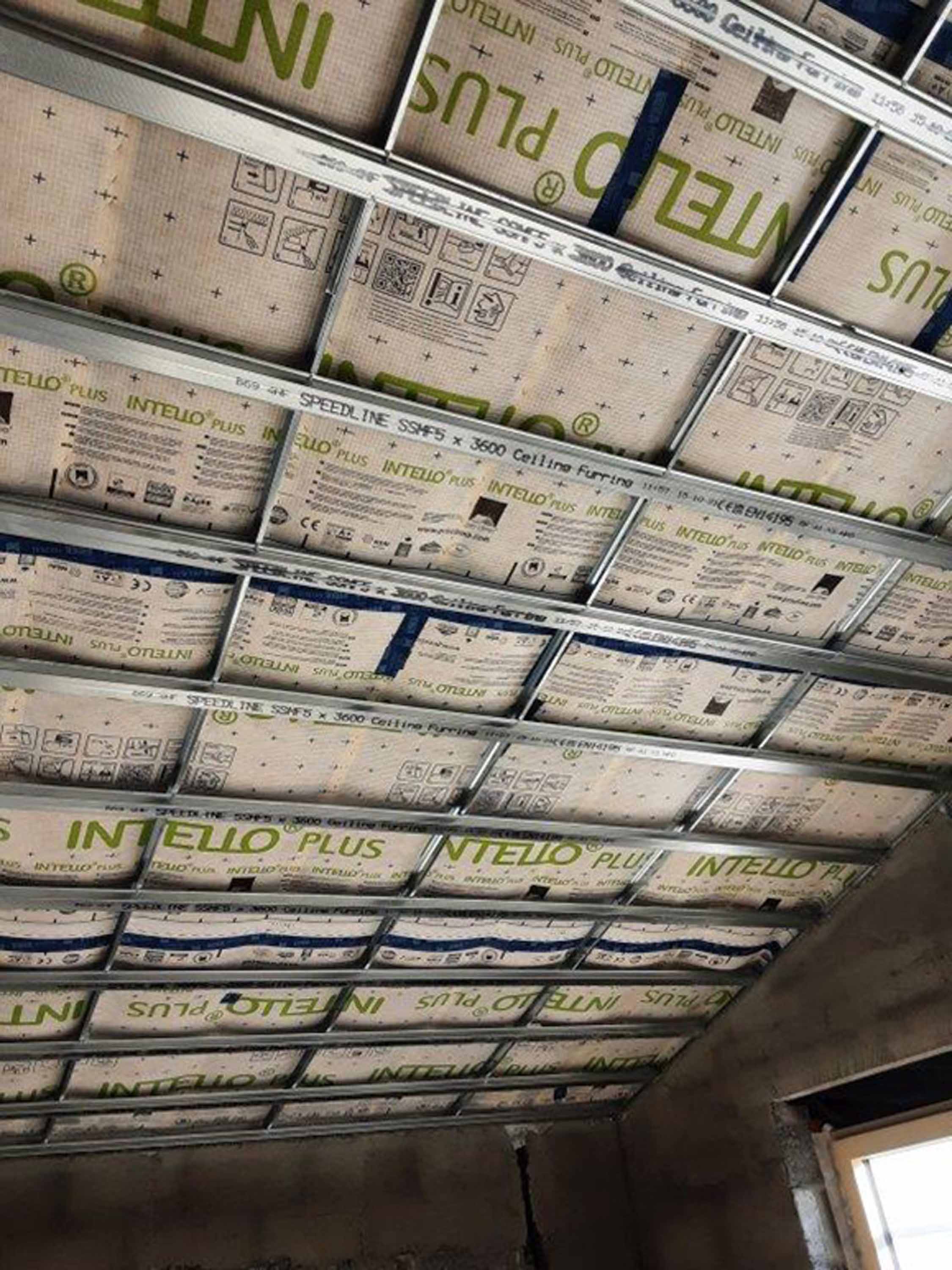 Intello airtightness & vapour control layer under a Speedline metal furring ceiling channel.