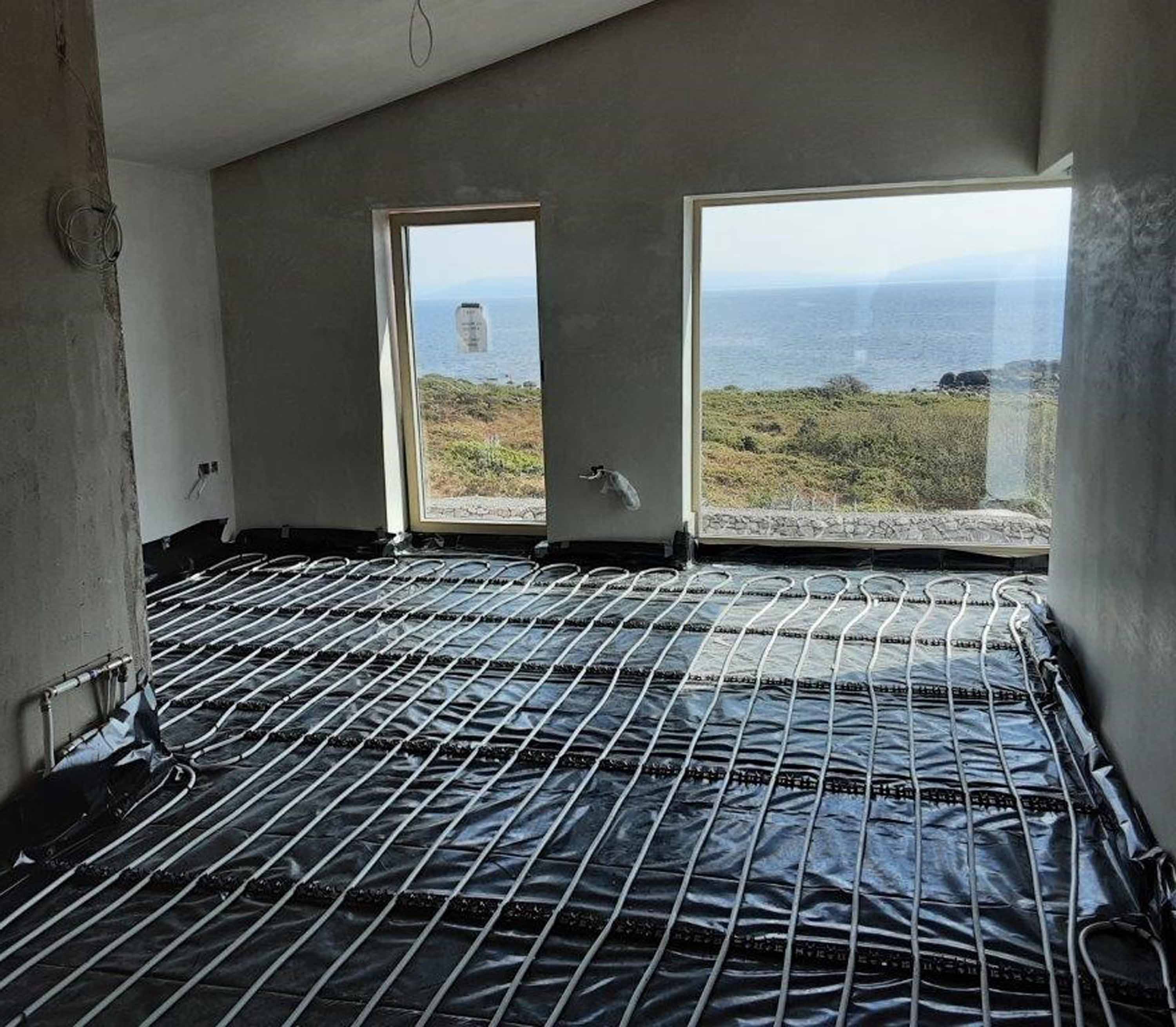Heating system: 8kW Samsung AE080RXYDEG EU air-to-water heat pump. SCOP 4.44. 230L stainless steel Duplex LDX 2101 Cyclone pre-insulated unvented pressurised hot water cylinder. Underfloor heating to ground and first floors.