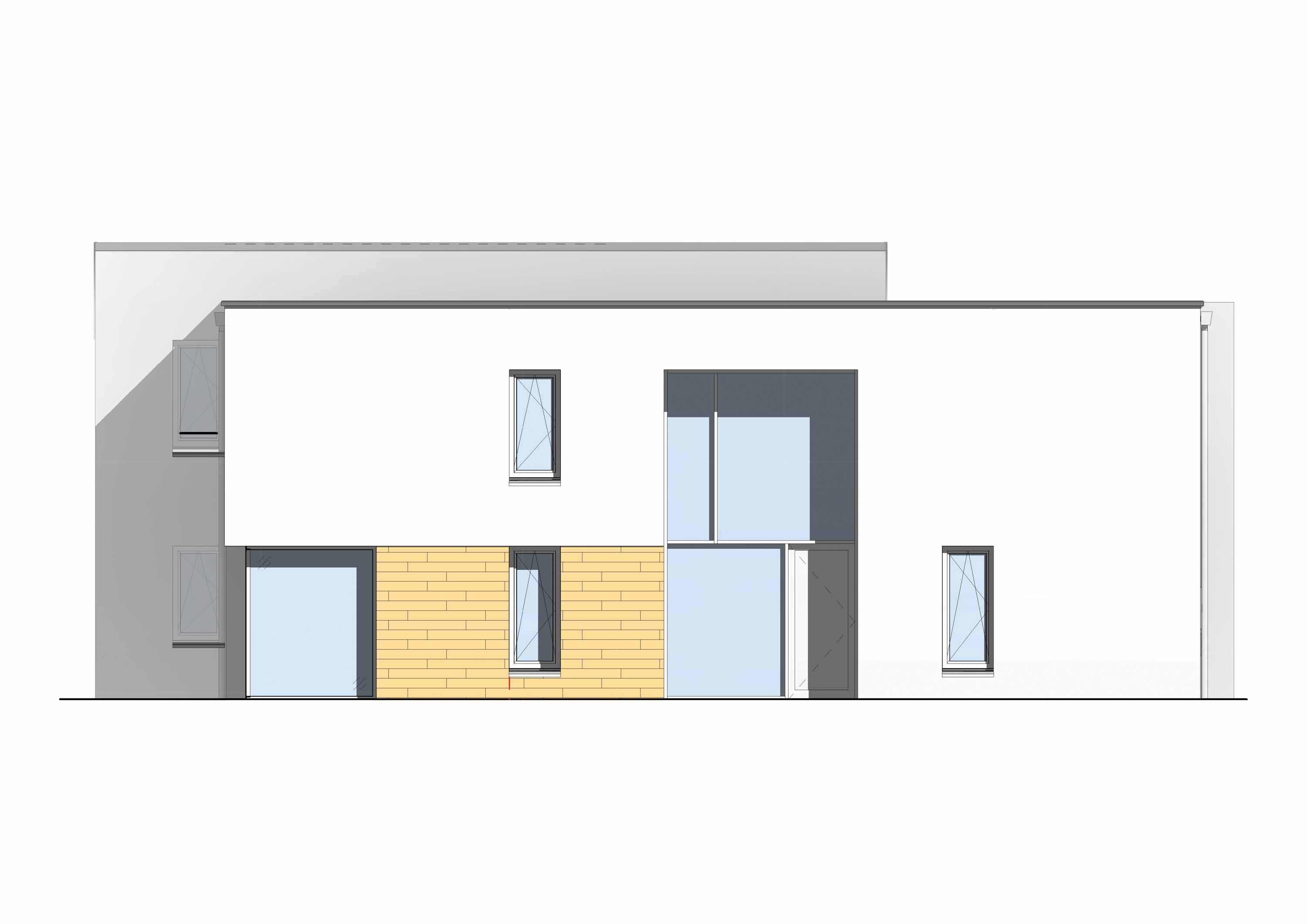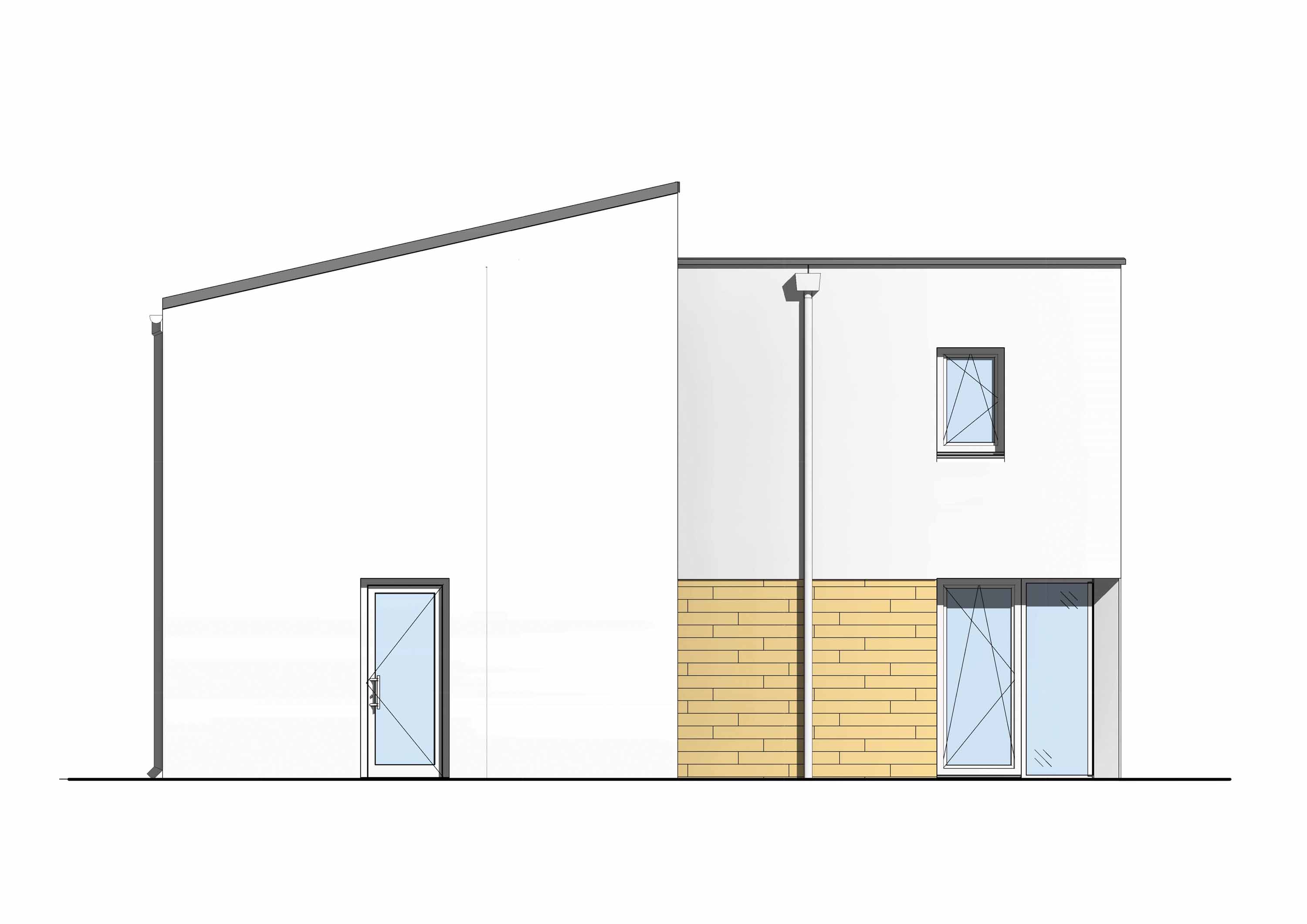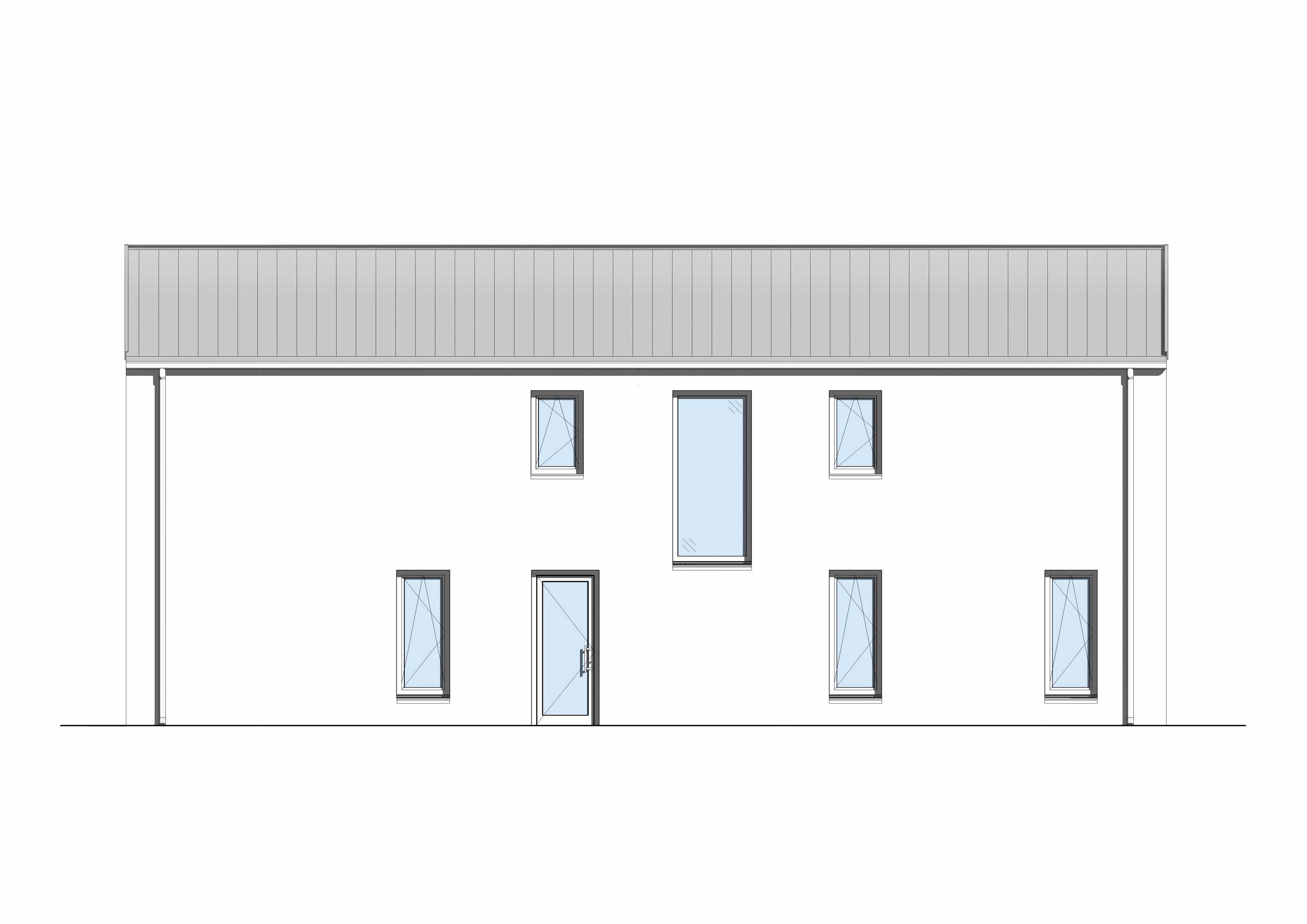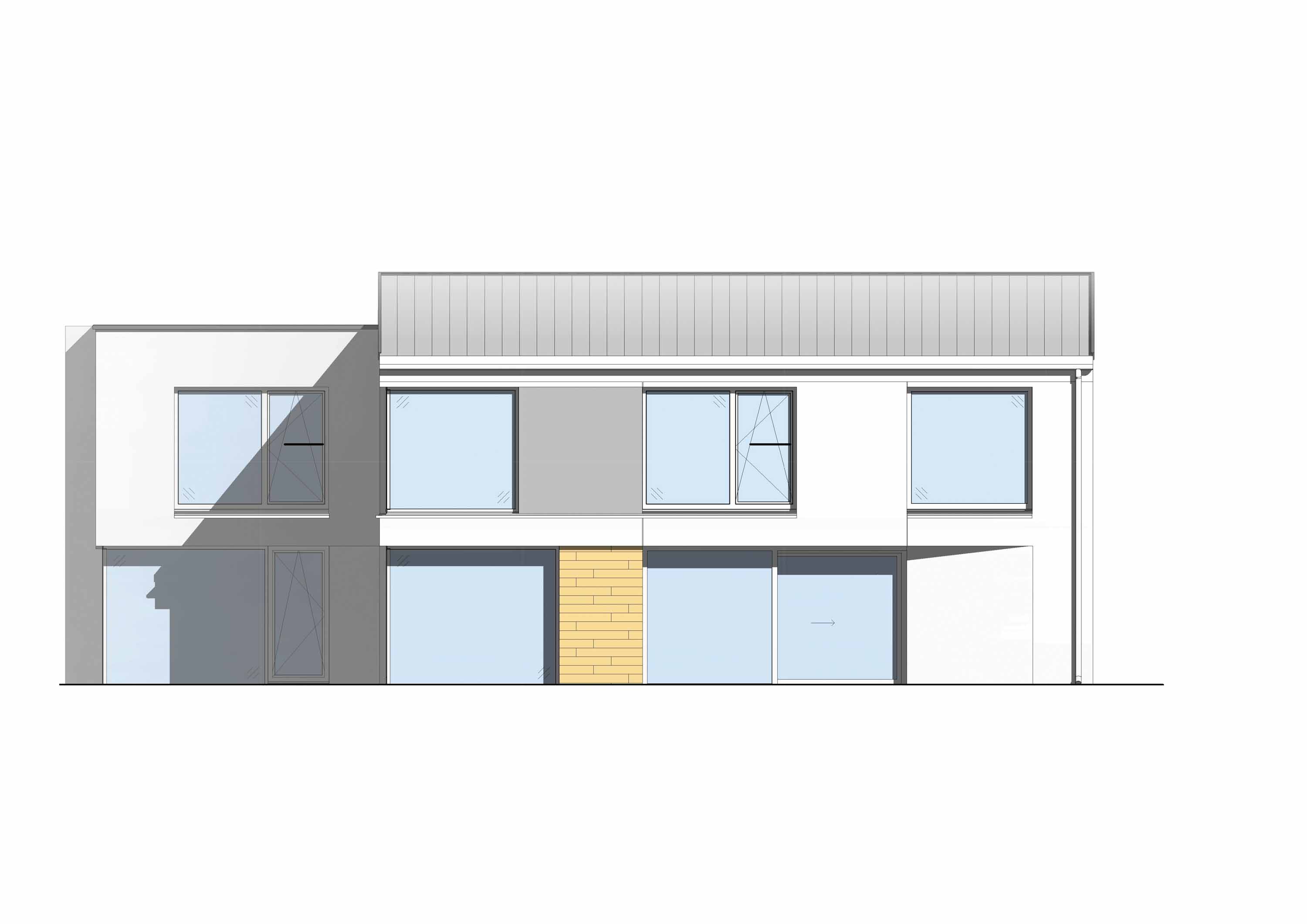Sloped roof (all houses): Mono-pitch zinc roof with VM Plus Zinc, followed underneath by 118 mm Warmdex (18 mm plywood with 100 mm PIR Insulation (0.020 W/mK), on plywood deck, on 220 mm joists with full fill Metac (0.034 W/mK). U-value: 0.093 W/m2K.