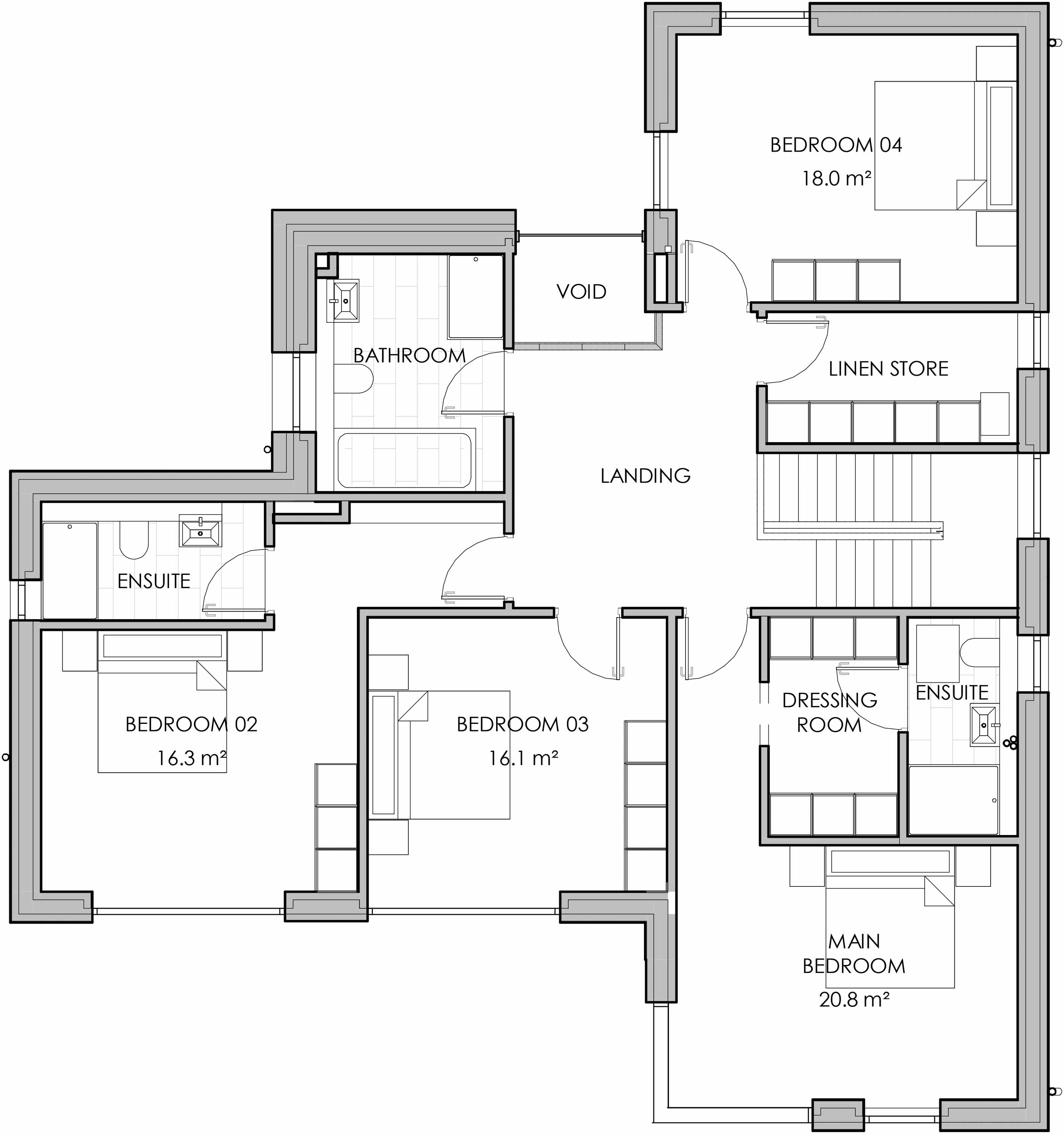 At treated floor areas of between 242 m2 and 245 m2, the houses are large and feature complex junctions. Yet a form factor of three reveals a relatively compact design, a factor which McElmeel explains, helps reduce embodied carbon by reducing material quantities used.