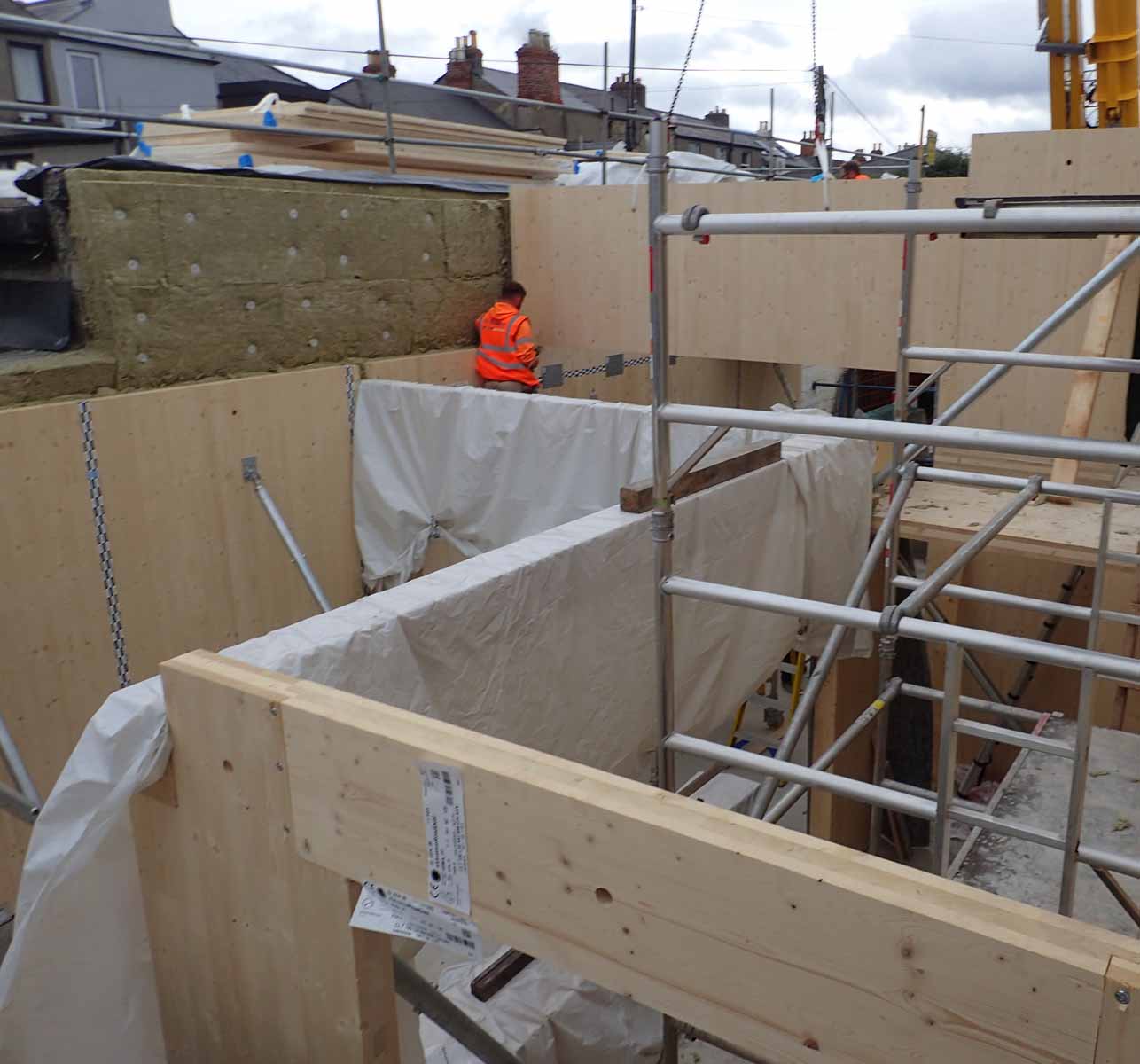 Rear of ground floor wall panels with taped internal junctions for airtightness