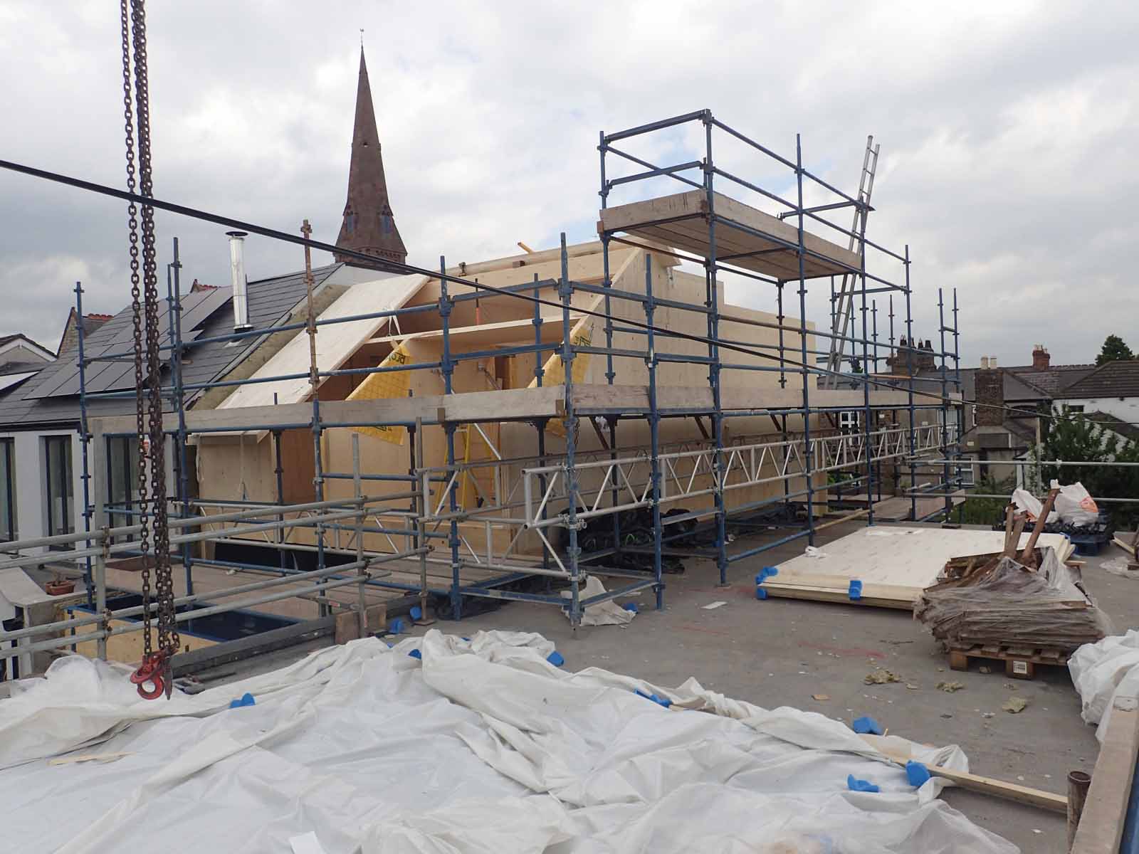 Rear terrace and roofs during installation of three-layer 240 mm wood-fibre insulation