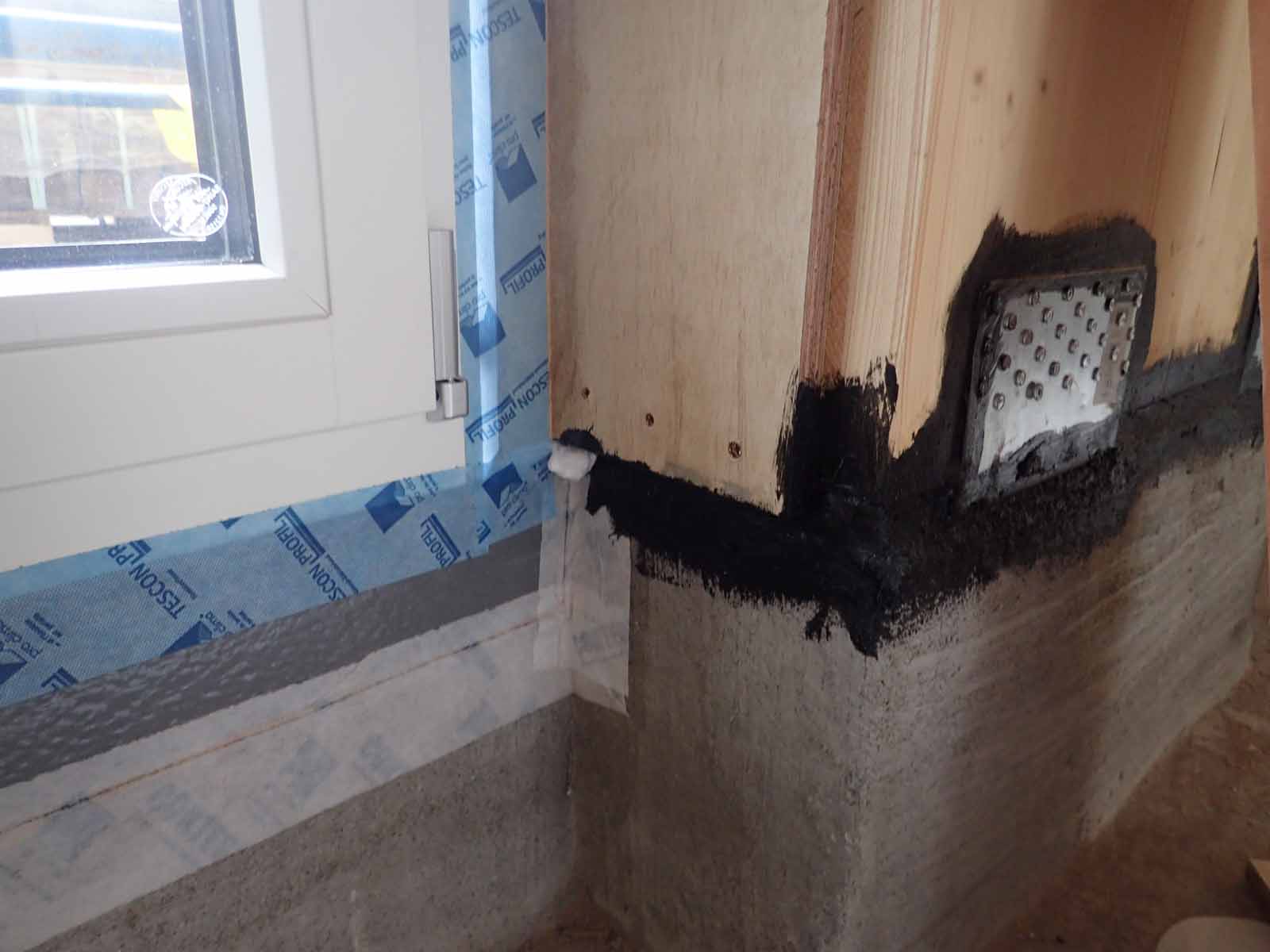 Detailed internal view of ground floor door and wall junctions with airtightness tape and brush-applied membrane