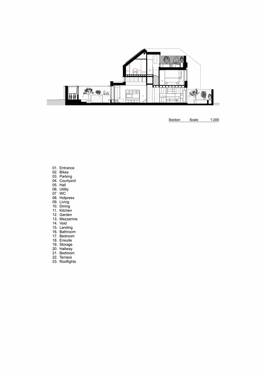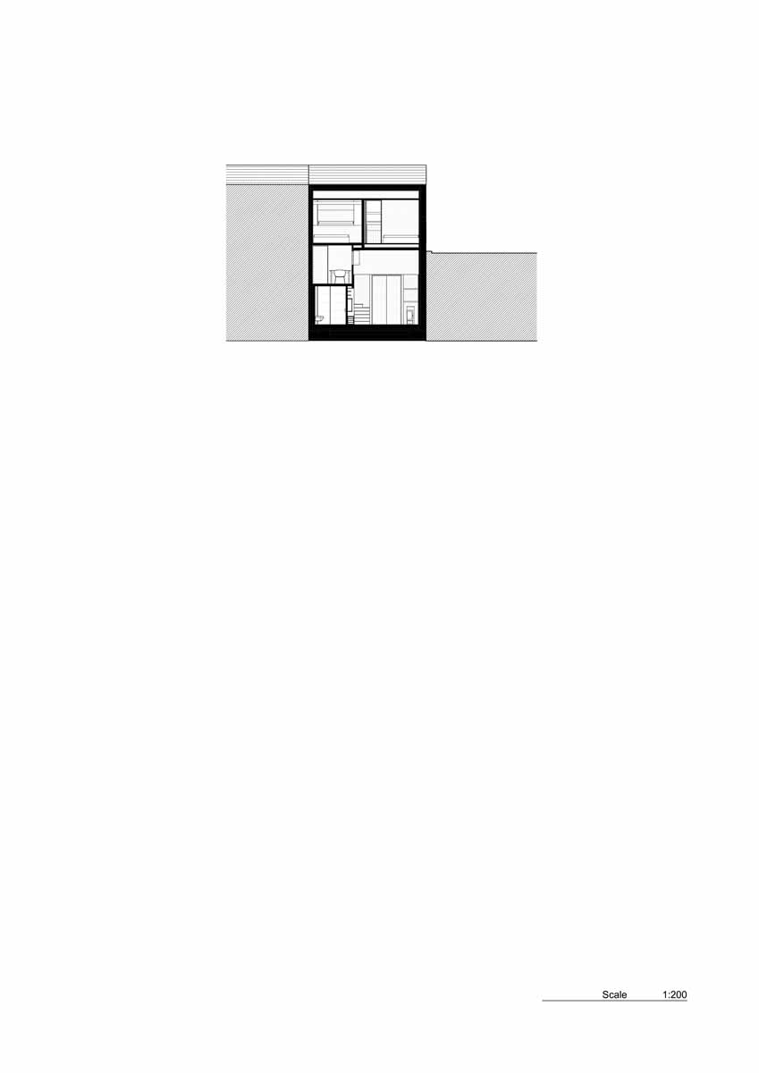 The first hint of difference that marks this 135 sqm dwelling from its terrace neighbours is the row of clerestory windows positioned directly above the shallow single-storey flatroofed extension at the front, which beams in sunlight into a south-facing double-height front room. A central stair connects four storeys with varying ceiling heights, rising first to a mezzanine at the front, through two levels of bedrooms and ending in the roof terrace to the rear.
