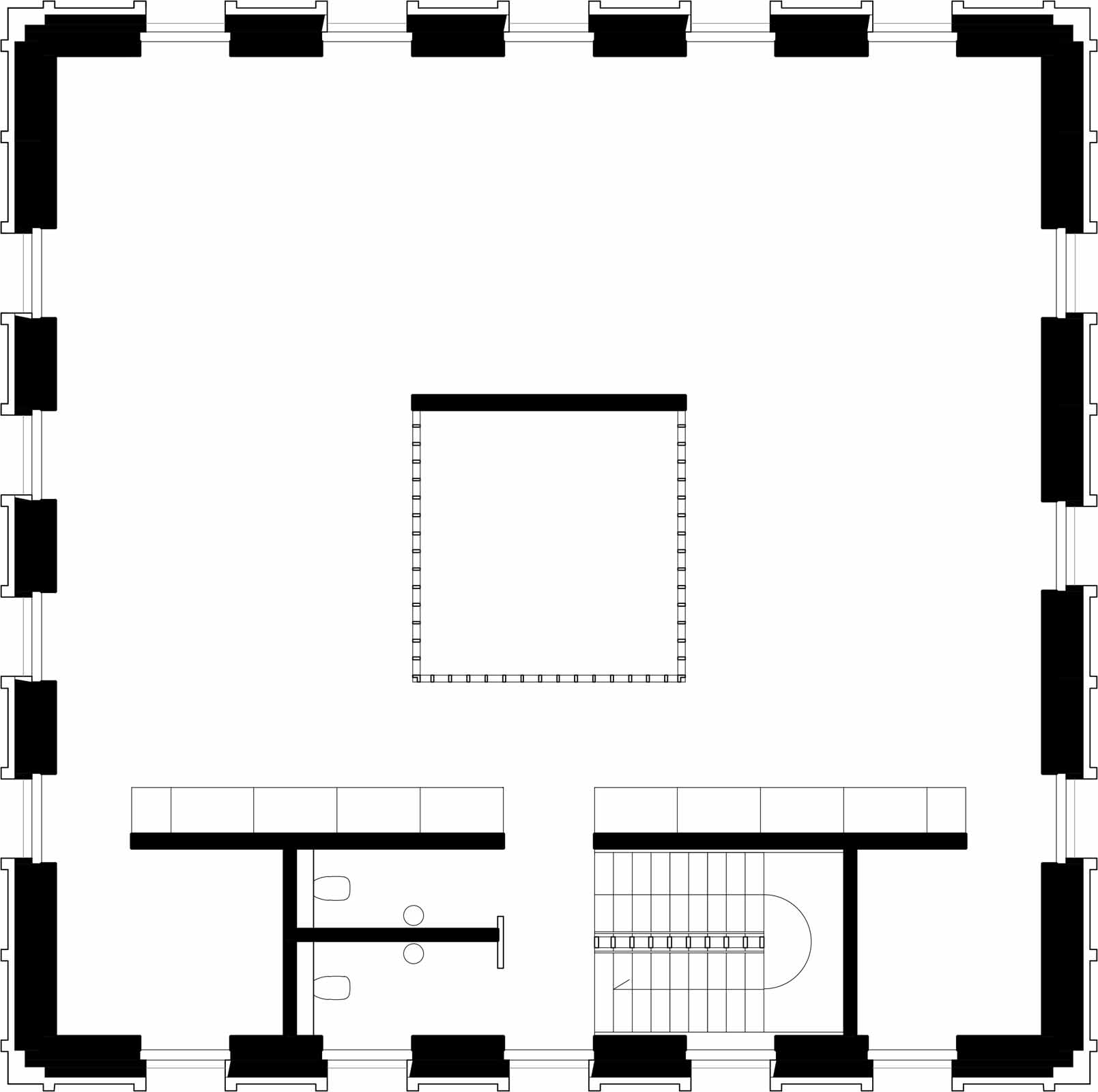 Inside, though, the building opens out into a light-filled and airy workspace that shows off its concrete structure. The offices neatly walk the tightrope between being too closed and too open plan, using timber fins and internal glazing to break up the spaces without making them cloistered.