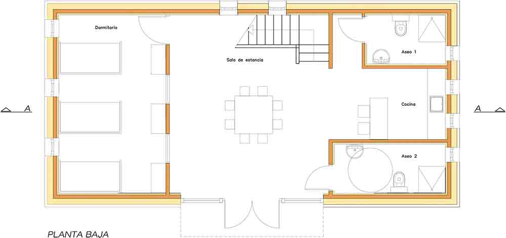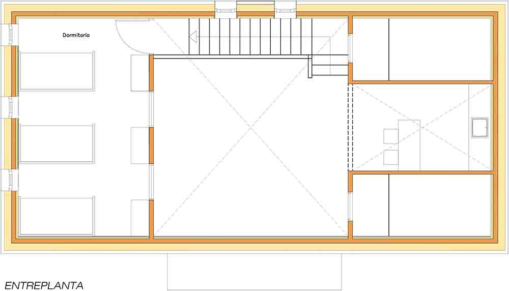 The finished hostel features two communal bedrooms, with six bunks each, plus a simple living and dining space, an adjoining kitchen, and two bathrooms.
