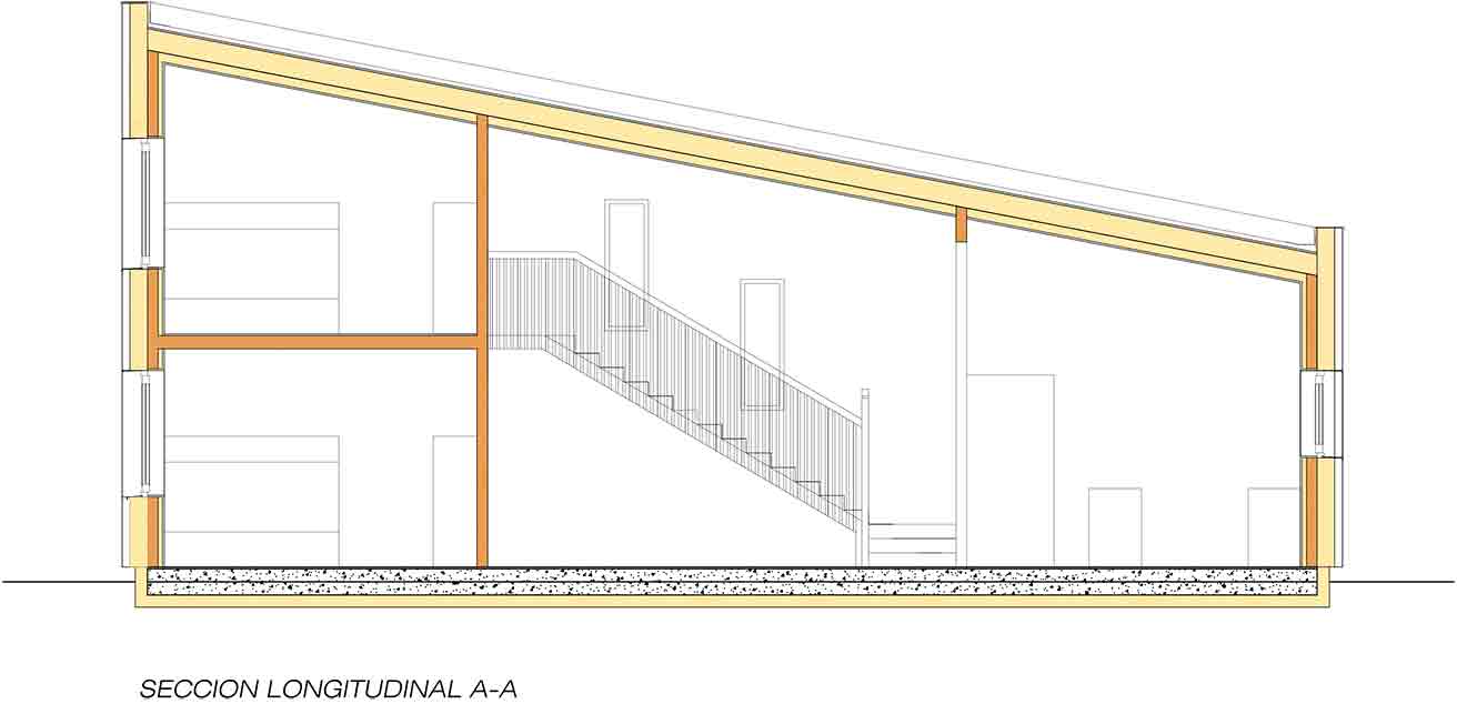 The size of the north-east elevation, meanwhile, was minimised to prevent heat loss to cold winds in the autumn and winter. Inside, the internal layer of OSB board was left exposed, creating a simple-yet-warm detail that eliminated the need for extra wall finishes.