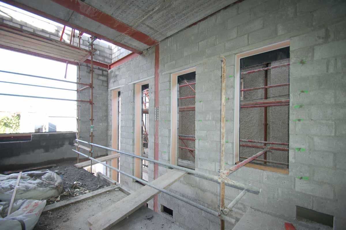 The principle walls of the new building feature two leafs of 100mm blockwork, with a 250mm cavity insulated with bonded polystyrene bead, and Gyproc Airtite plaster internally. Cavities were also created by constructing single leaf blockwork walls 250mm from the party walls, and again insulating with bonded bead. In all cases, Ancon Teplo thermal bridge free walls ties were used to bridge the cavities