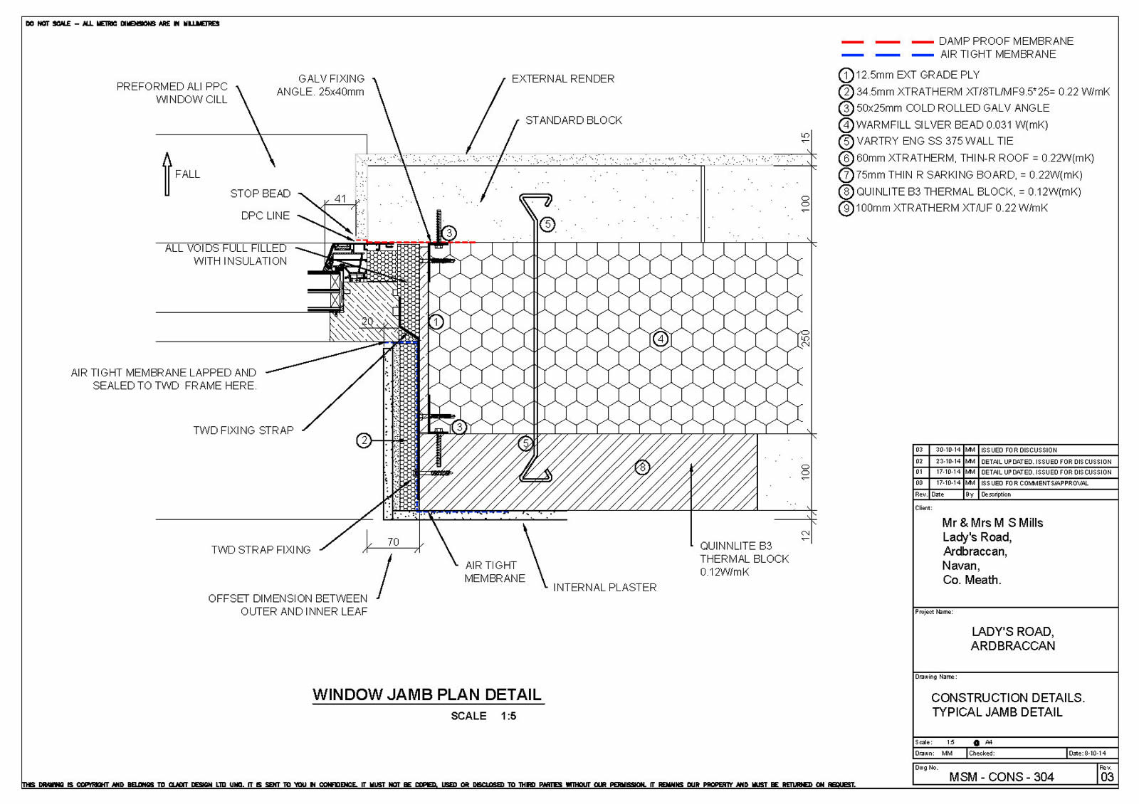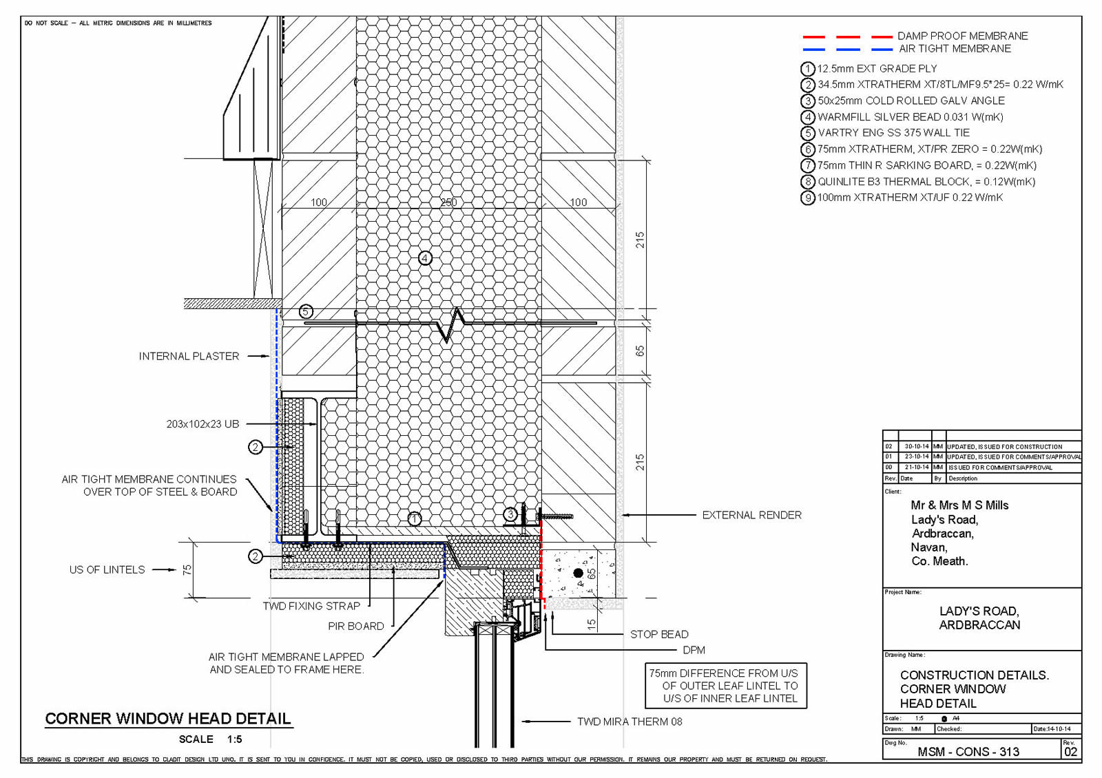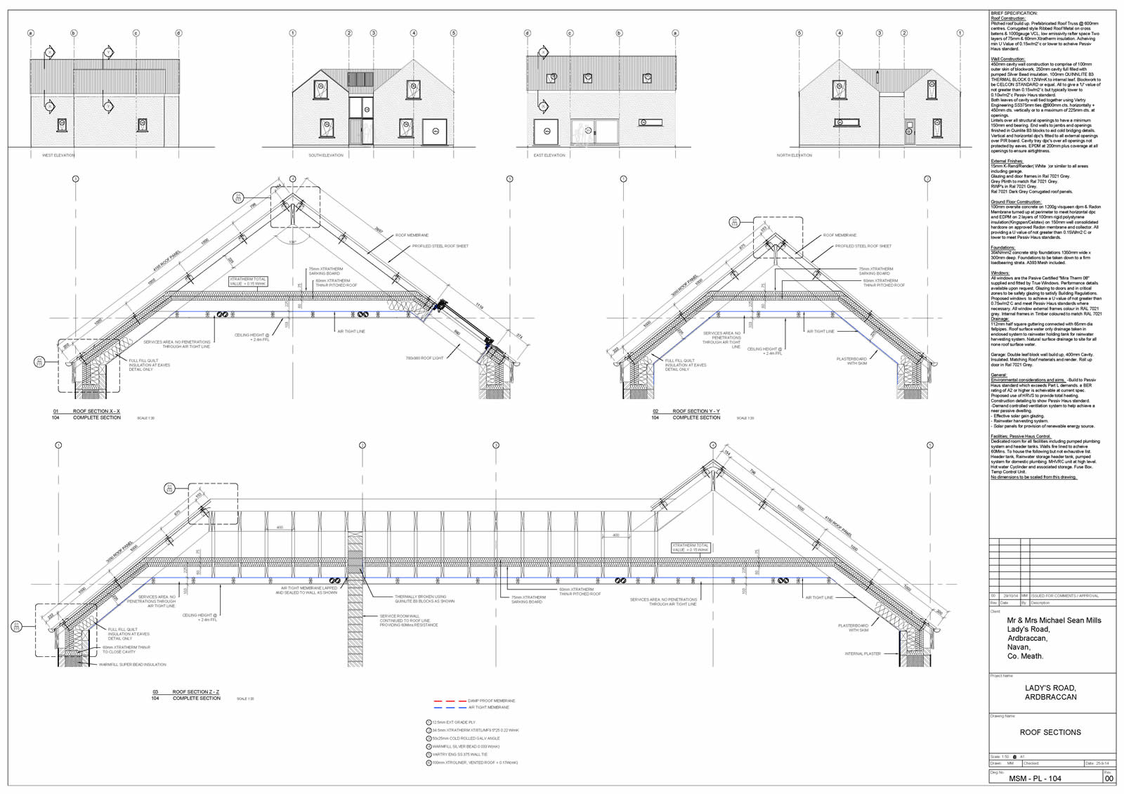 Thermal bridging: Quinn Lite B3 thermal blocks to slab edge, wide cavity with SS wall ties. Bespoke reveal/opening thermal bridge detail. Bespoke steel corner to corner windows, Xtratherm warm roof build up. Pre design for entire building and its components to work within the airtight/warm line