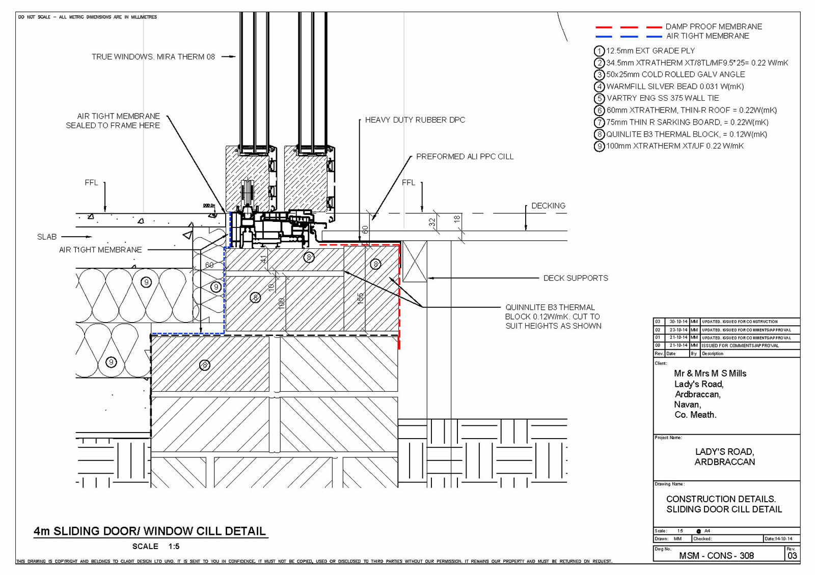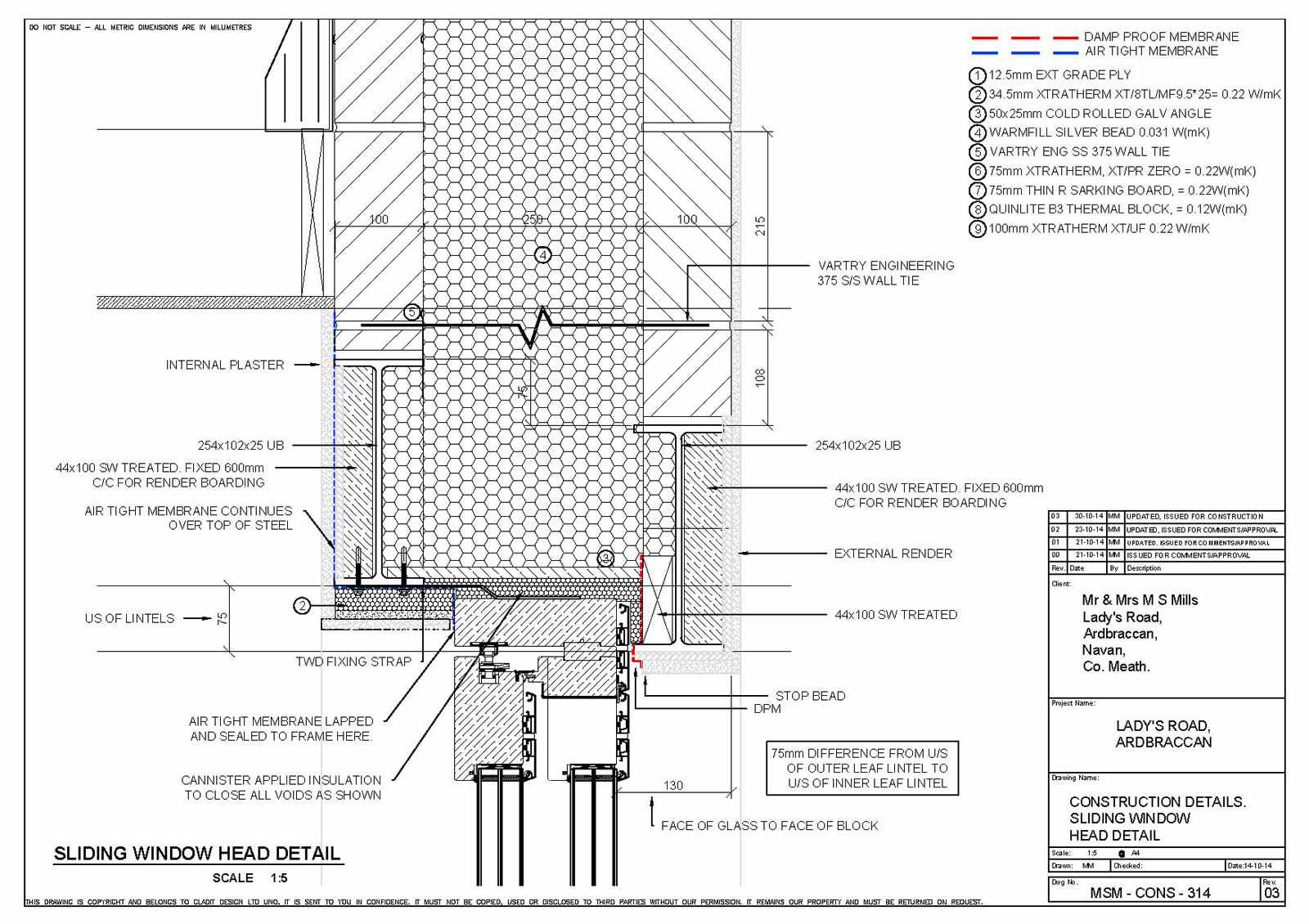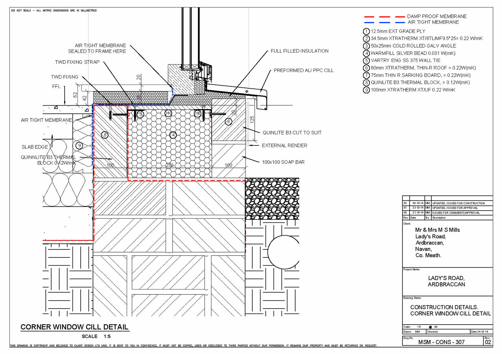 Thermal bridging: Quinn Lite B3 thermal blocks to slab edge, wide cavity with SS wall ties. Bespoke reveal/opening thermal bridge detail. Bespoke steel corner to corner windows, Xtratherm warm roof build up. Pre design for entire building and its components to work within the airtight/warm line