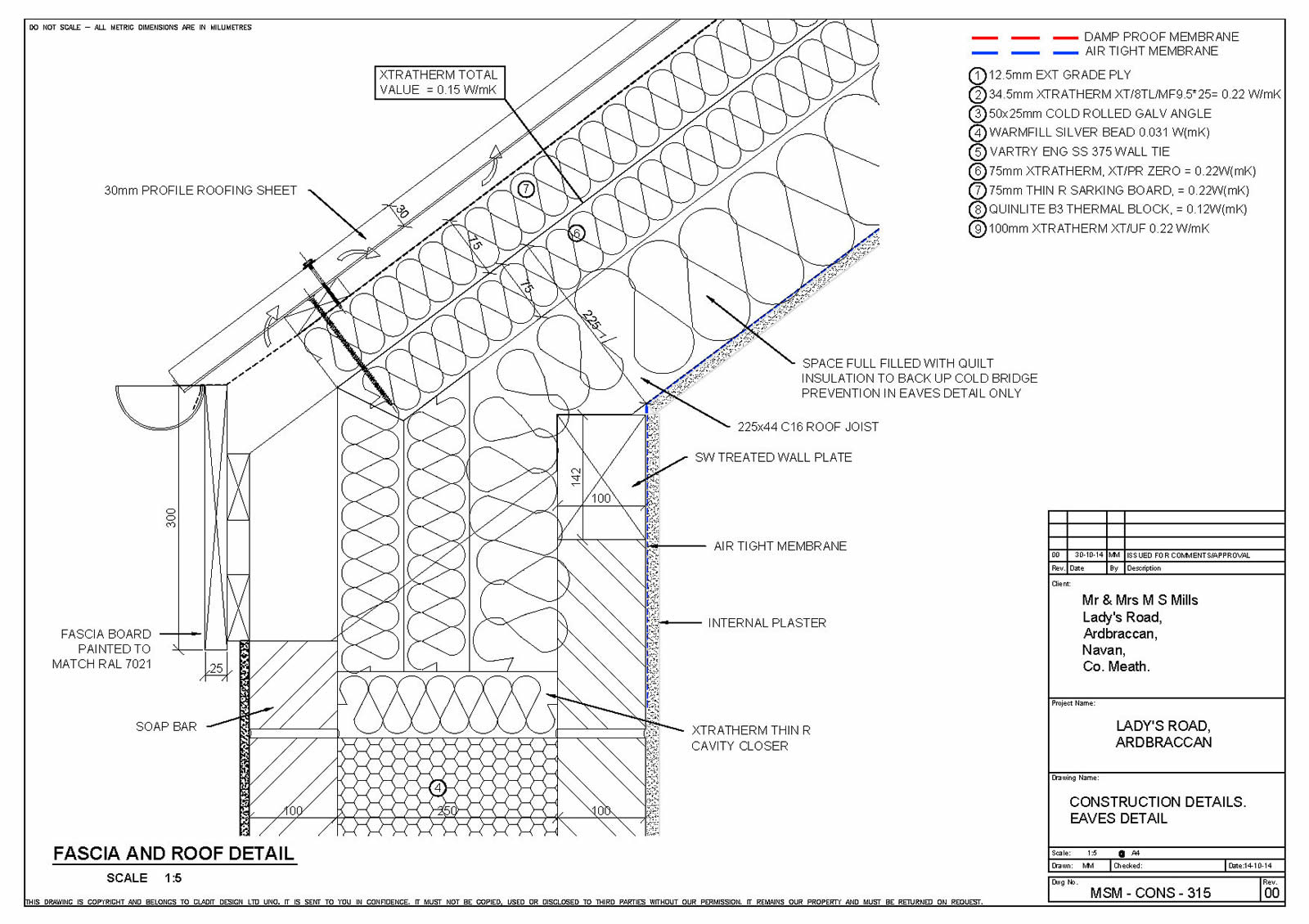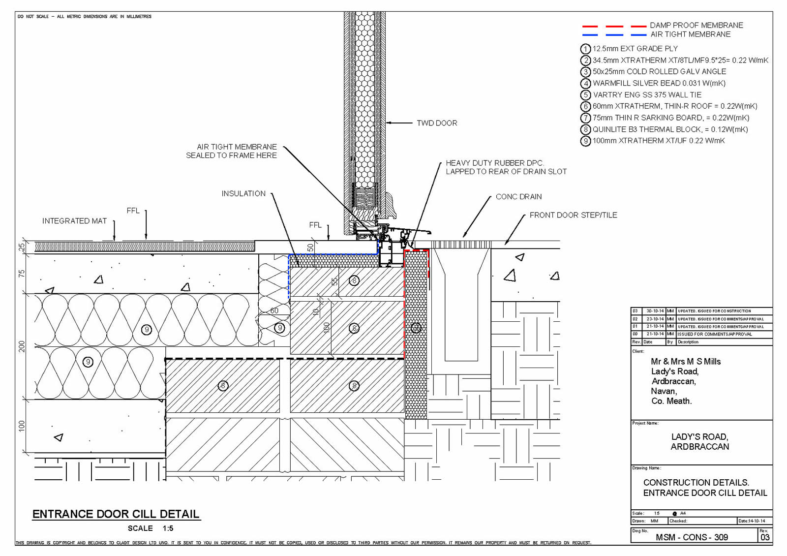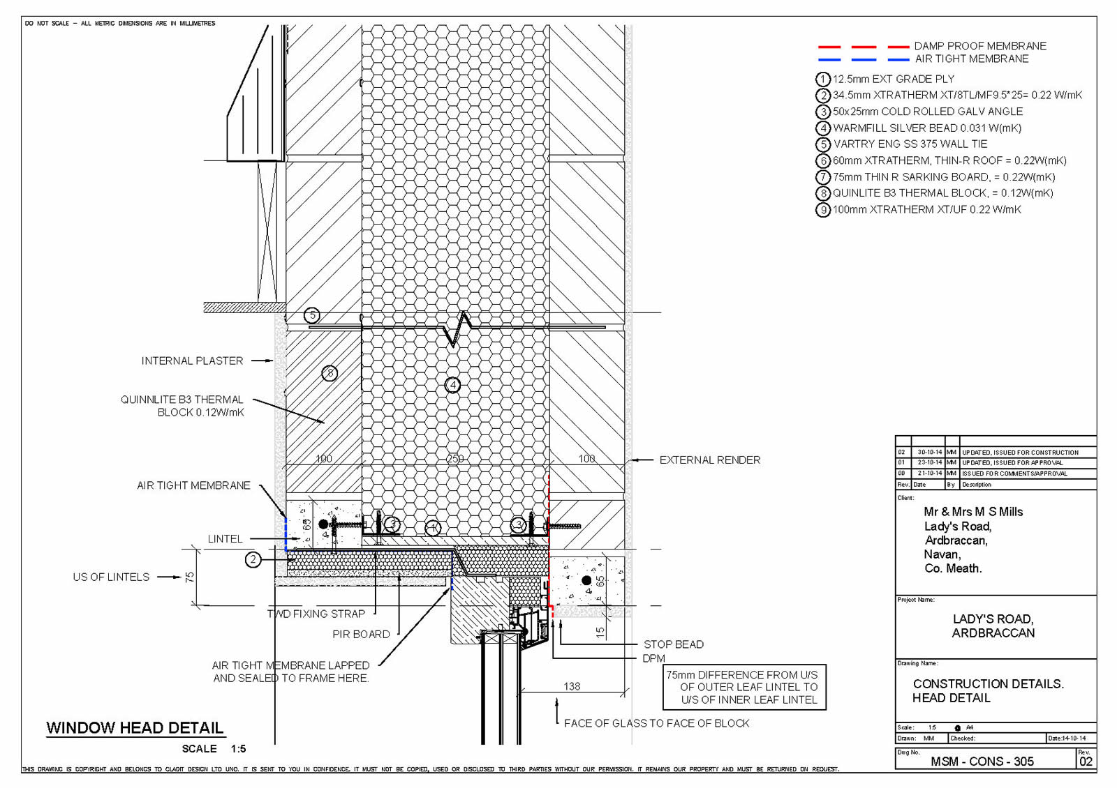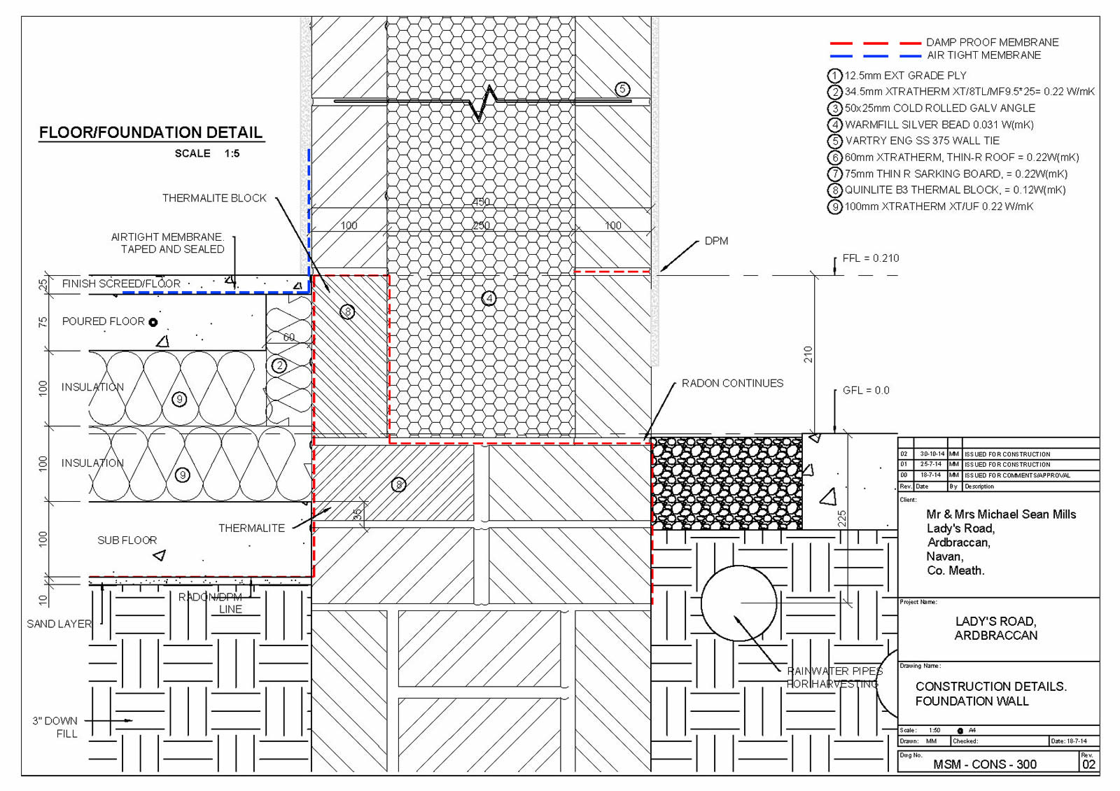 . Ground floor: Wide strip foundation, 100mm concrete, 200mm Xtratherm XT/UF Quinn Lite double block course to perimeter. 88mm traditional screed. U-value: 0.09W/m2K
