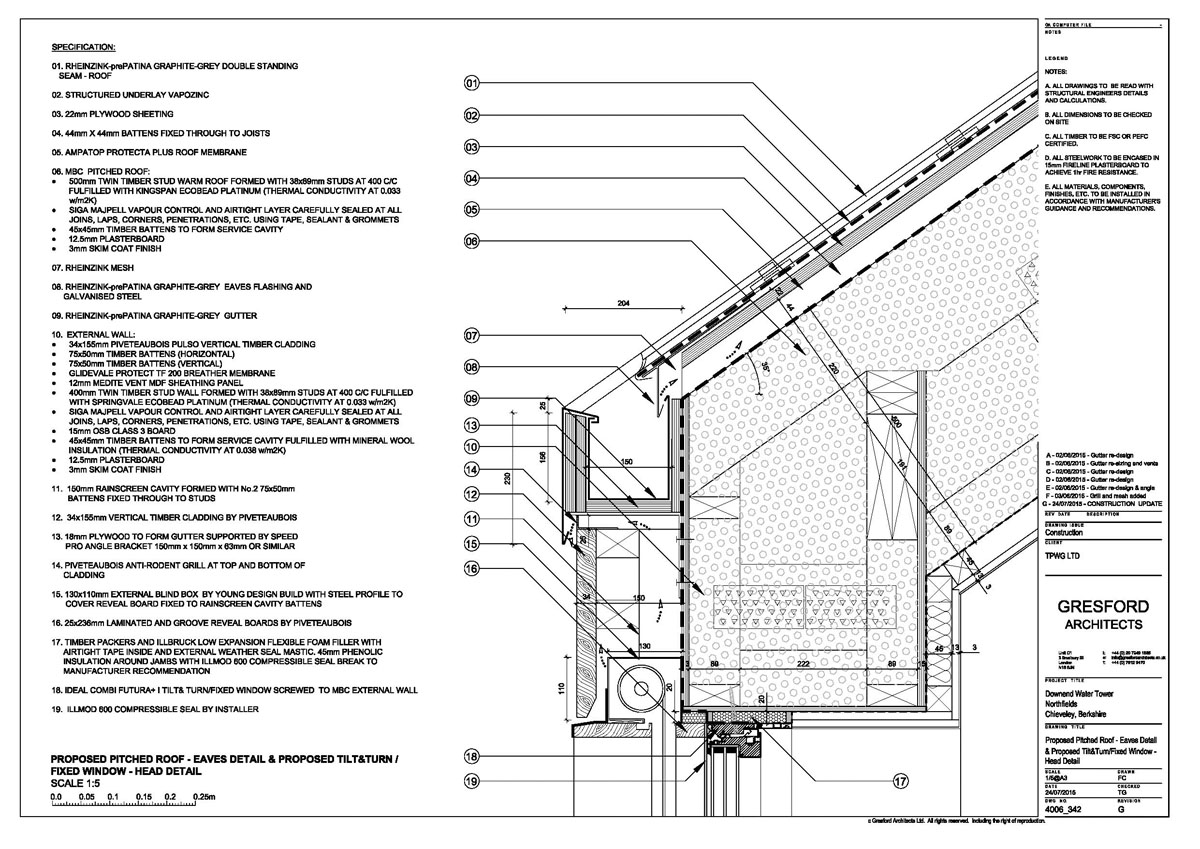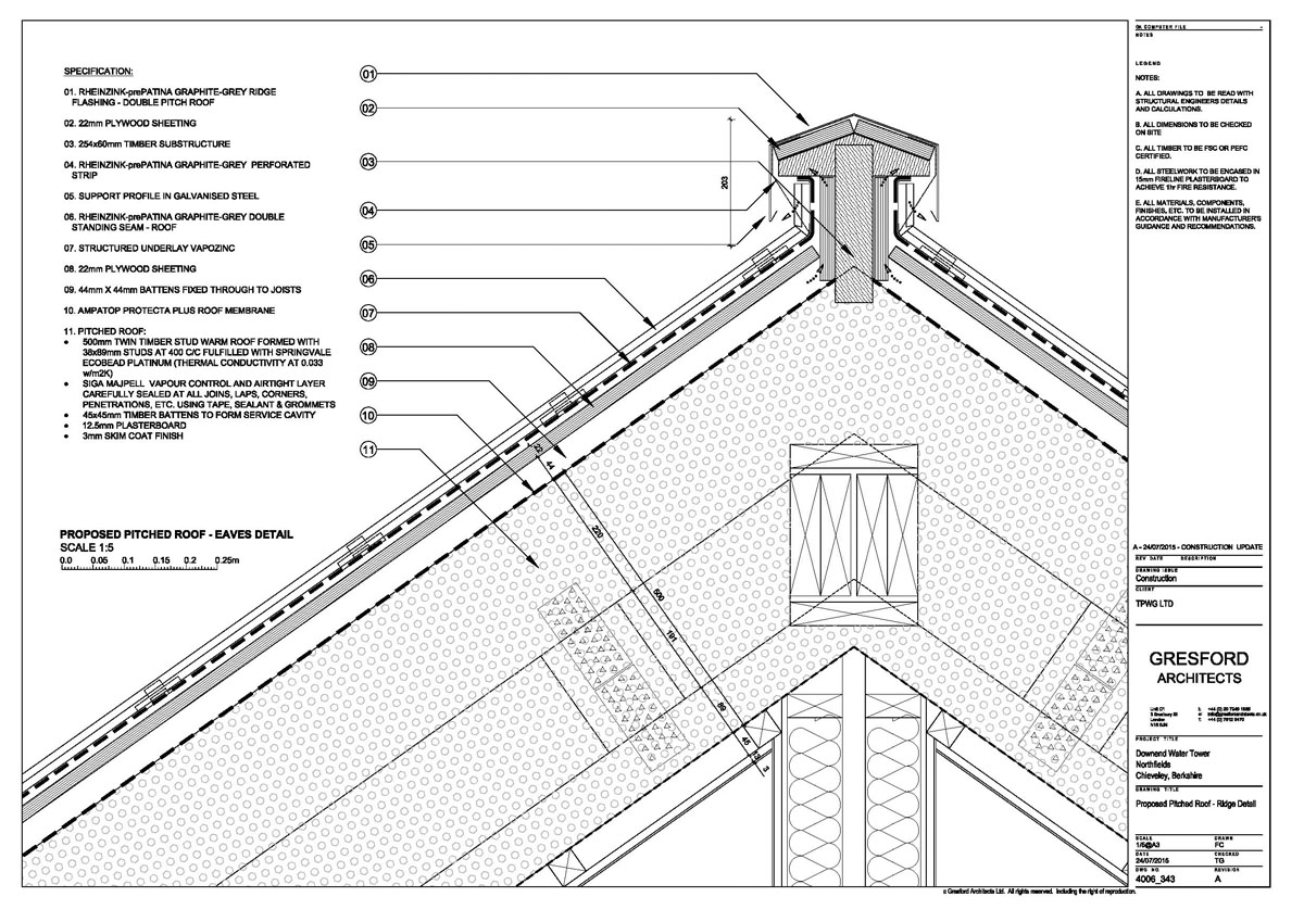 Roof: Rheinzink Prepatina graphite grey double standing seam onto 22mm plywood sheeting, on 44mm battens fixed through to joists, on Ampatop Protecta plus roof membrane, on 500mm twin timber stud warm roof fulfilled with Springvale Ecobead Platinum insulation, on Siga Majpell vapour control and airtight layer, on 15mm OSB class 3 board, on 45mm service cavity fulfilled with mineral wool insulation, on 12.5mm plasterboard with 3mm skim coat finish