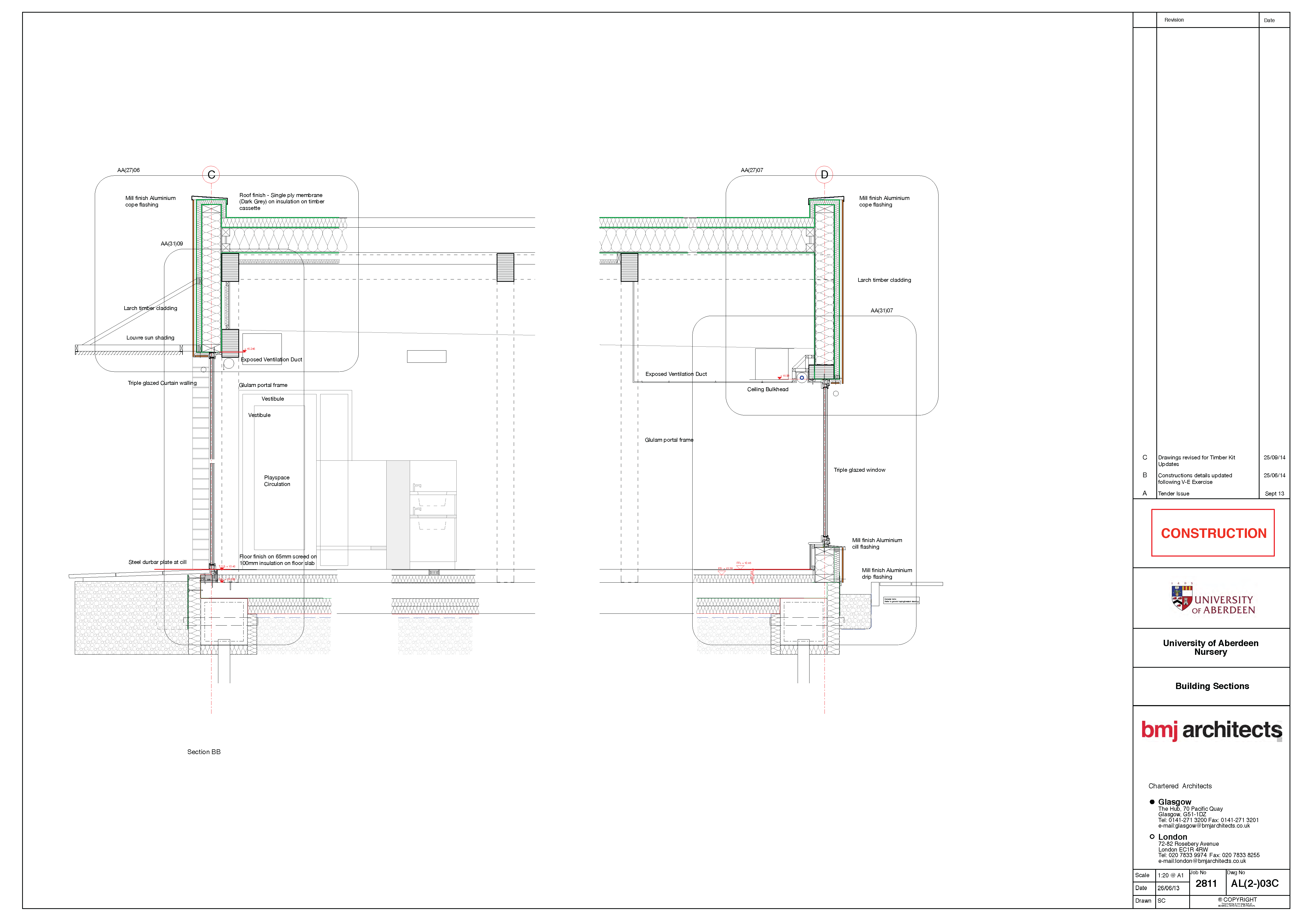 Roof: Sarnafil single ply membrane on 120mm PIR insulation, on Sarnavap sealed vapour barrier, on 300mm deep timber cassette panels with 10mm OSB board each side & insulated with PU foam derived from vegetable oil, on Glulam structure. 100 x 50mm framing between Glulam structure with 100 x 50mm timber framing and Ecophon Advantage E ceiling. U-value: 0.074 W/m2K