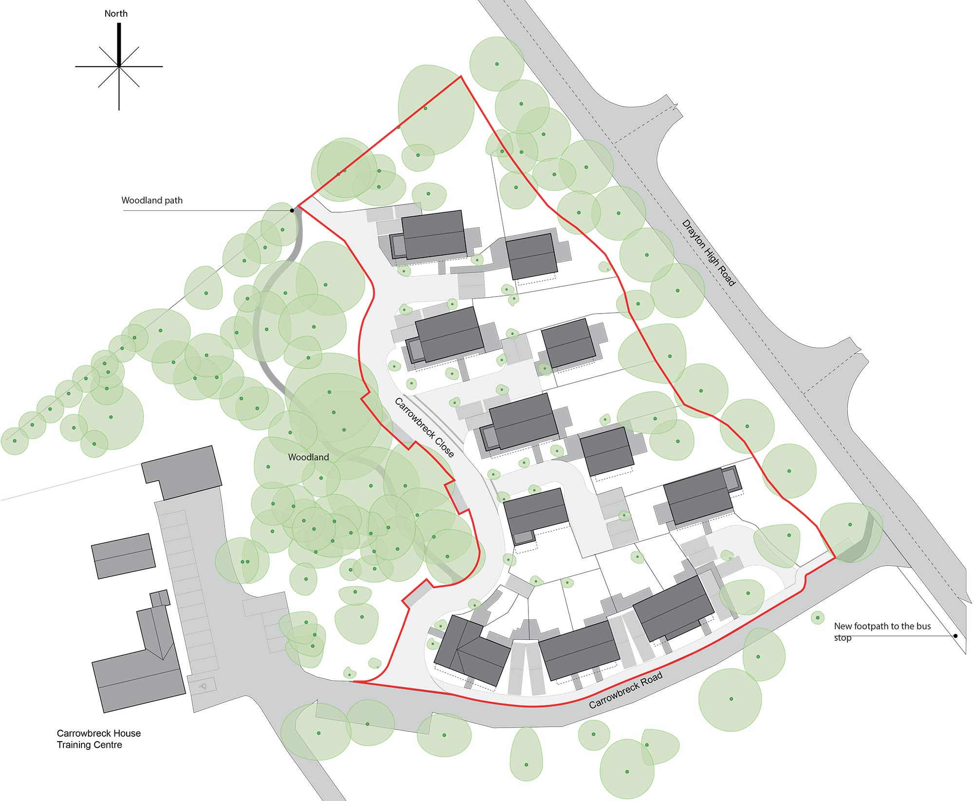The sustainability ambitions at Carrowbreck permeate the project at every level, from the overprovision of affordable homes to the new woodland path and animal haven, through to the choice of natural and low carbon materials across the site.
