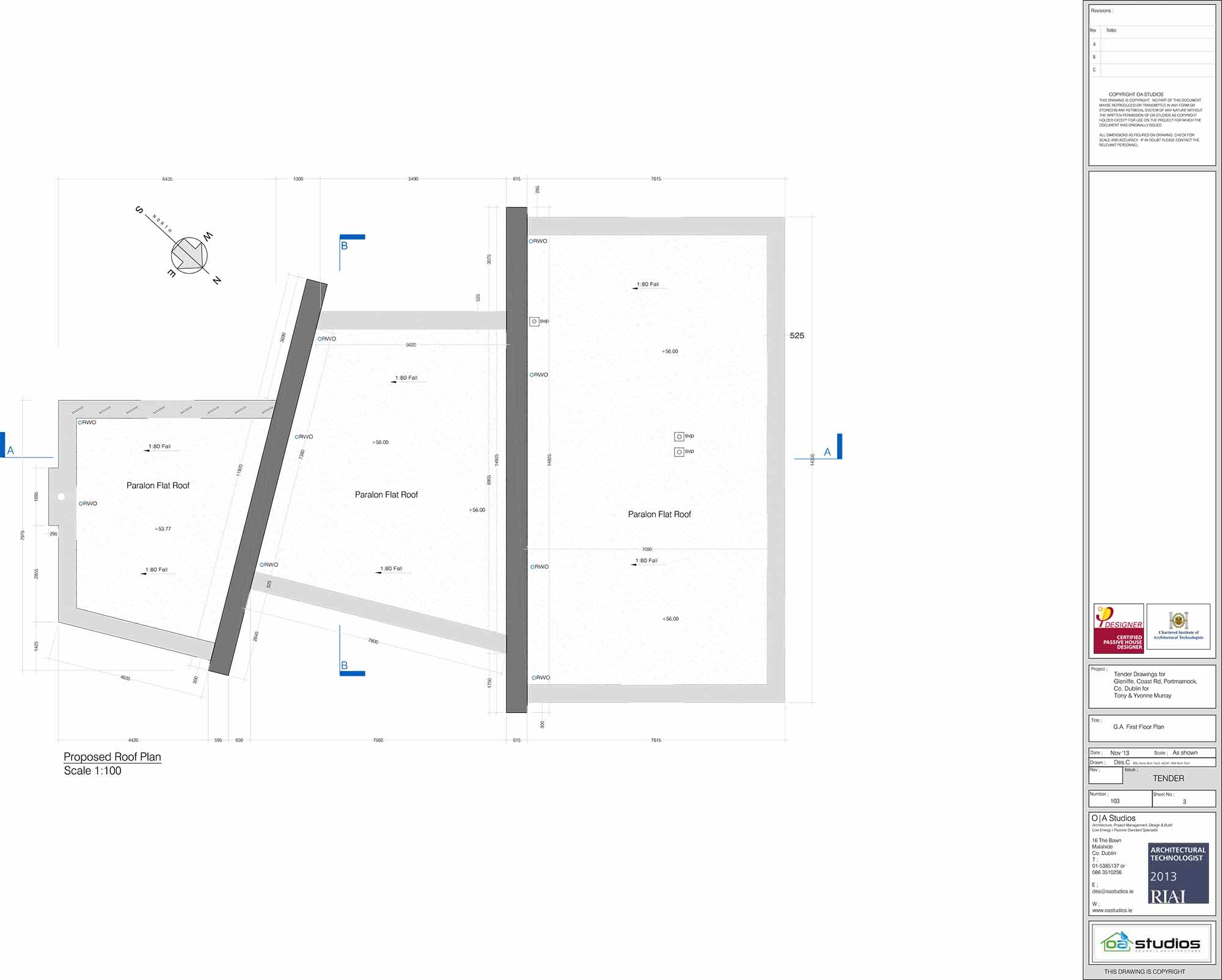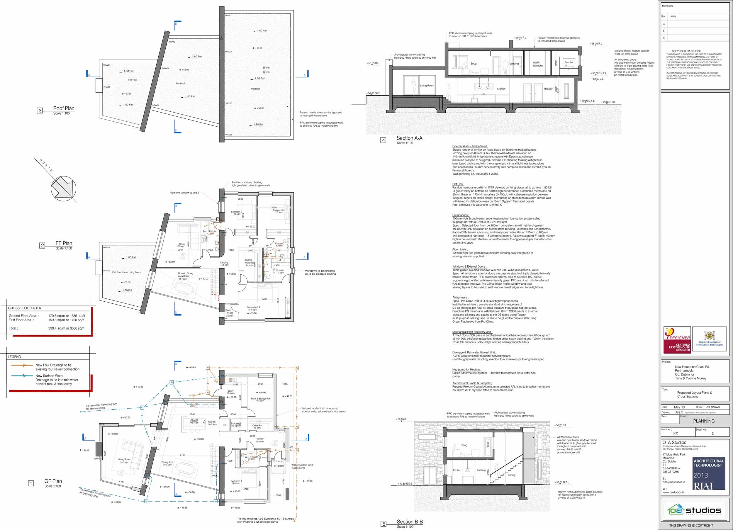 Roof: Paralon membrane externally to manufacturers spec on 22mm WBP plywood, on firring pieces installed to achieve 1:80 fall to gutter valley on Solitex / Tyvex breathable membrane, on 100mm Xtratherm Thin-R slab insulation, on 225x44mm rafters at 400c/c with 300mm thick Earthwool insulation between rafters, on pro clima Intello airtight membrane, on 35x50mm battens to form 50mm service void with 12.5mm Gyproc Fireline 30 minute board. U-value: 0.18 W/m2K