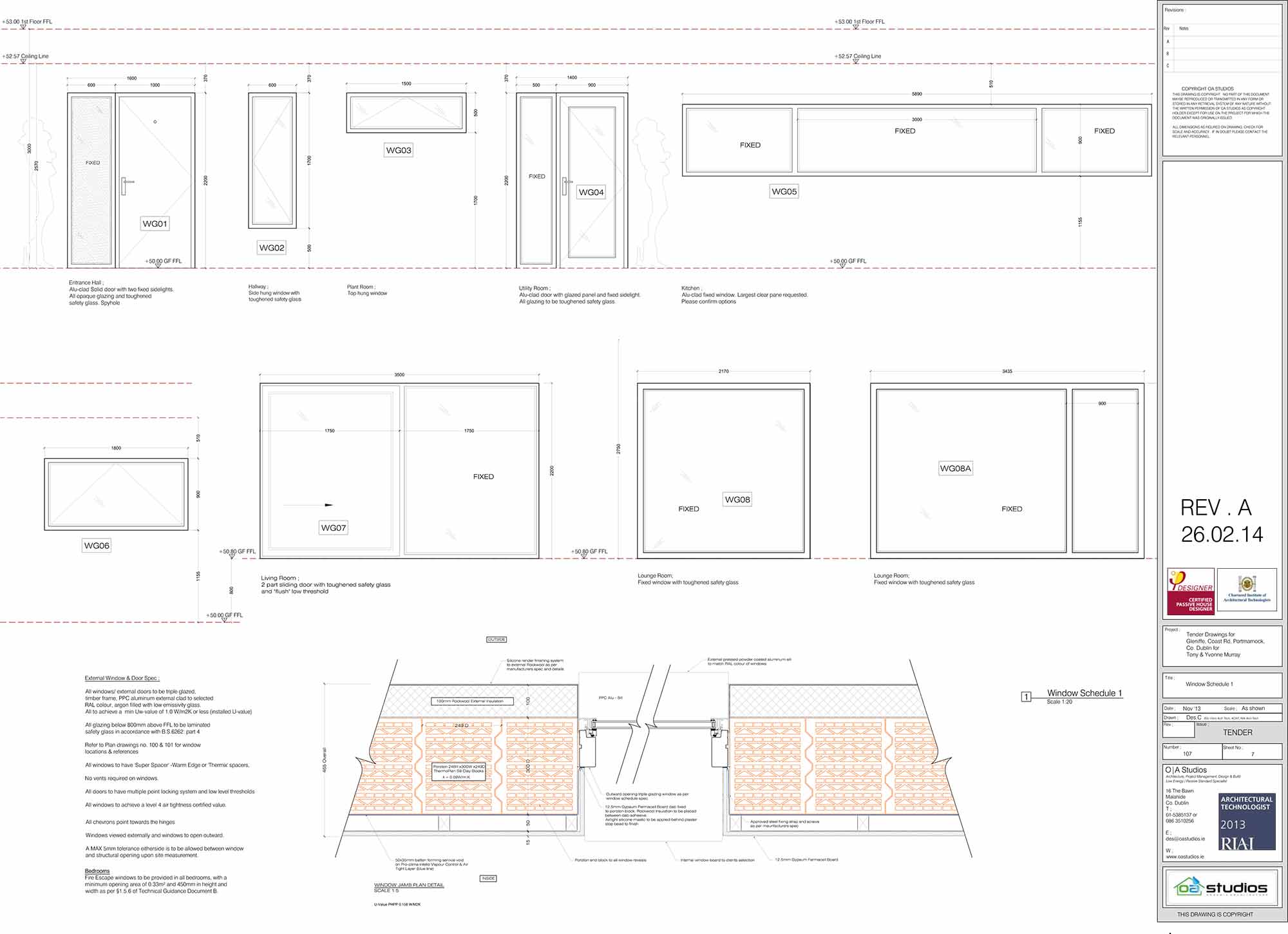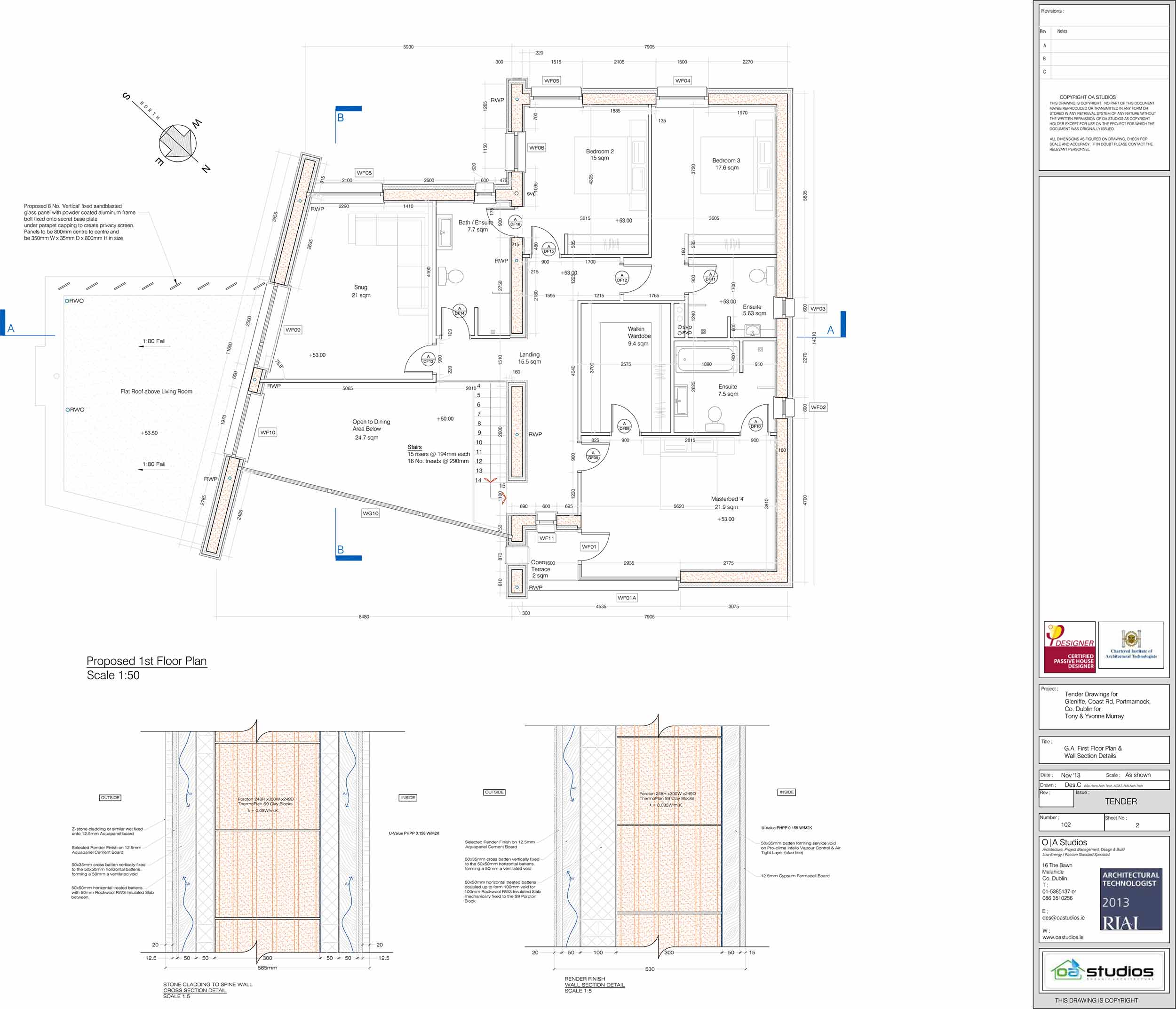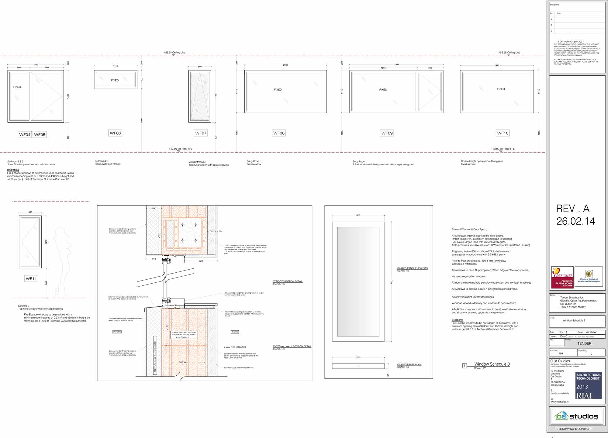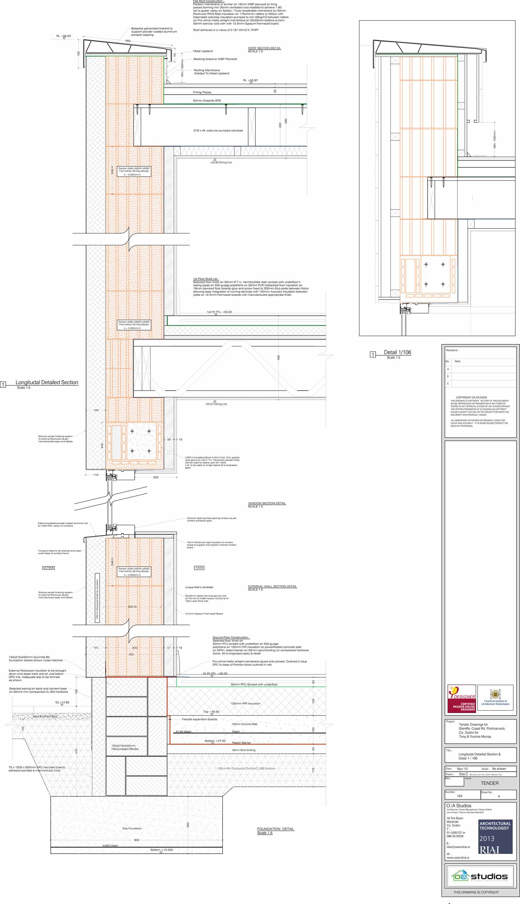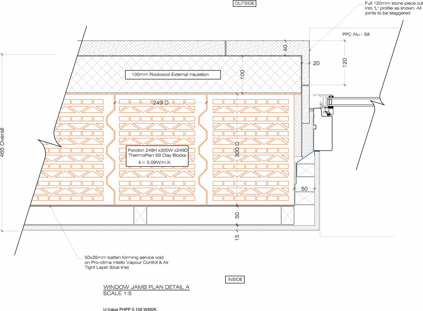 Walls: Silicone lime-based render on 100mm Webertherm XM Graphite EPS slab Insulation, on 300mm Juwo Thermoplan S9 poroton blocks with pro clima Intello airtight membrane forming airtight layer fitted internally, secured with 35x50mm battens forming service void with 12.5mm gypsum board. U-value: 0.158 W/m2K