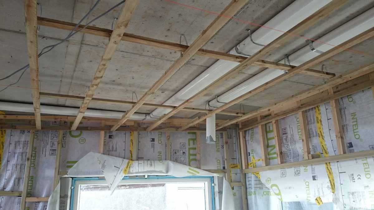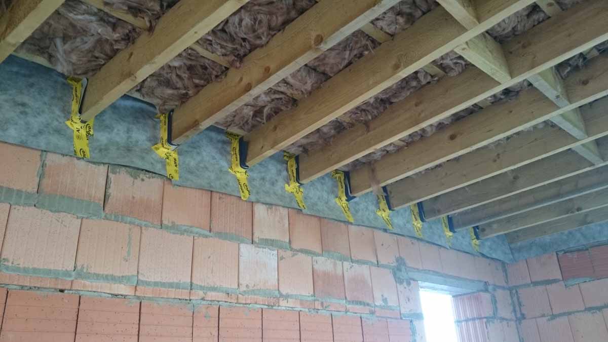 Rigid ductwork for the ProAir heat recovery ventilation system seen here in the ceiling service void, with the Intello vapour control and airtightness membrane visible on the inside of the wall build-up