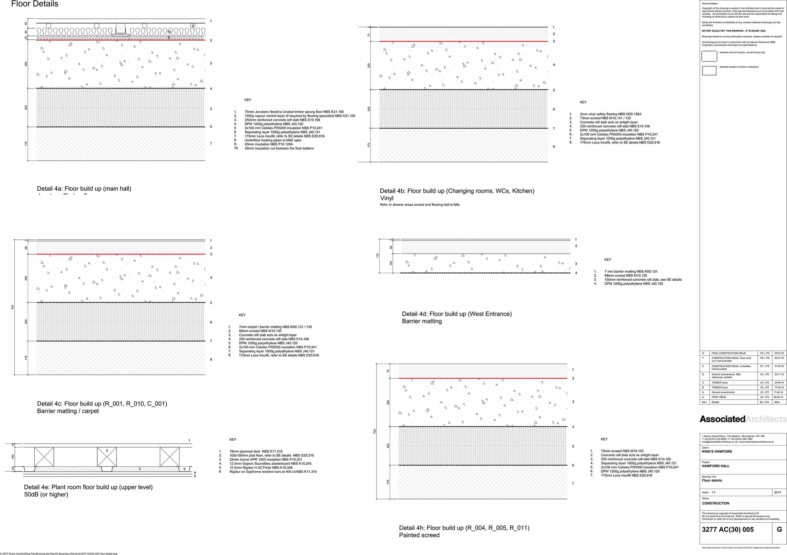 Thermal bridging: Measures taken to reduce thermal bridging via detailed close scale construction drawings, and thermal bridge analysis (carried out by the PHPP consultant) at each critical junction: wall-roof connections detail, wall-slab connection detail, wall-roof connection plus window top detail, wall-wall connection (external corner), wall-slab connection and threshold, window connections, wall-roof connections: door tops and thresholds, fixed roof light connections, openable rooflight connections. All analysis was carried out to achieve thermal bridging Ψ value not exceed 0.01 W/mK. Airtightness champion on site to ensure the quality of airtightness but also to ensure thermal bridging details correctly constructed. Ground floor: 175mm Leca Insufil expanded clay insulation and fill, followed above by 2 x 100mm Celotex FR5000 insulation, 1200g polyethylene DPM, a 250mm thick in-situ concrete raft slab, pumped hot water underfloor heating system, spreader plate, sitting between battens of 75mm Junckers NewEra Unibat timber sprung floor system. U-value: 0.074 W/m2K