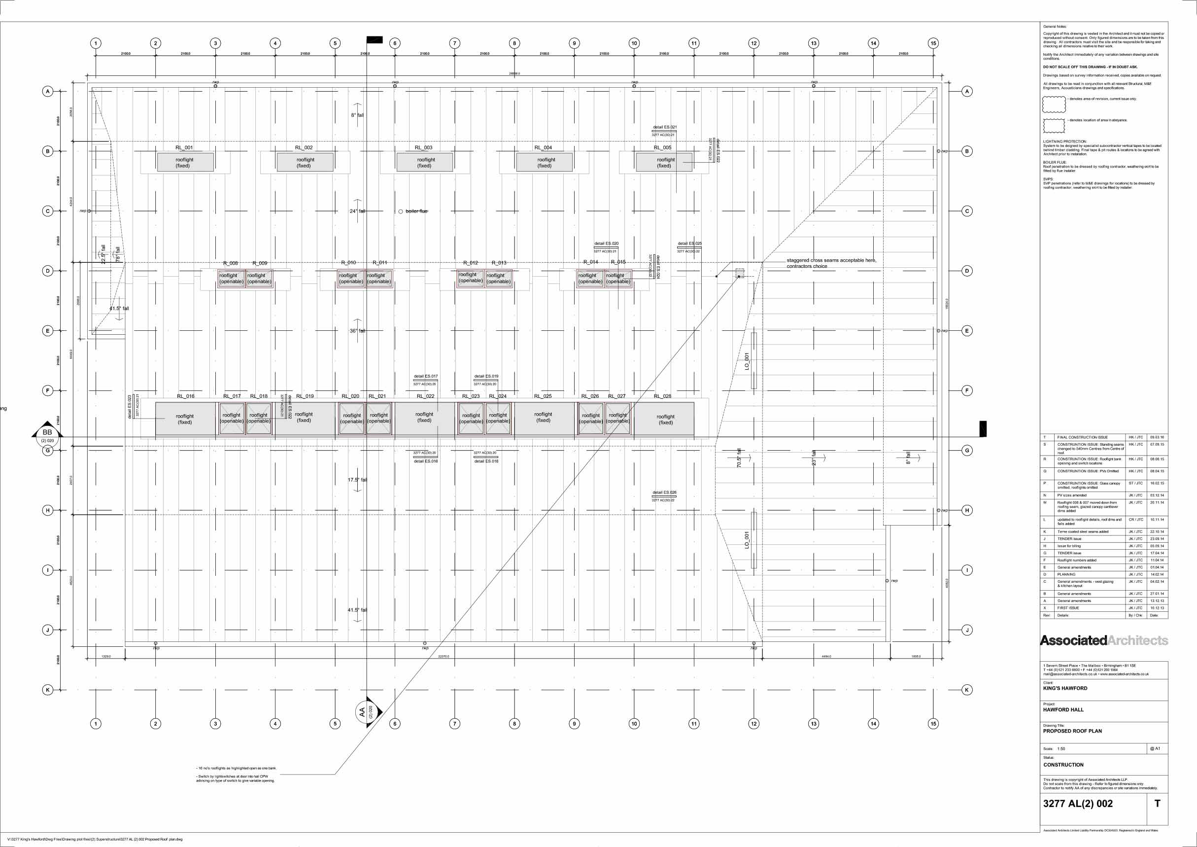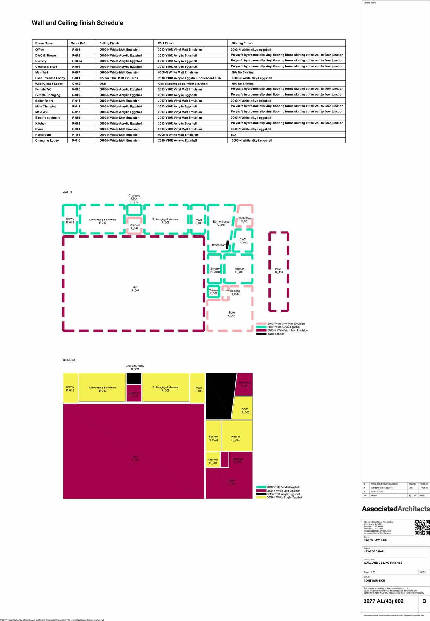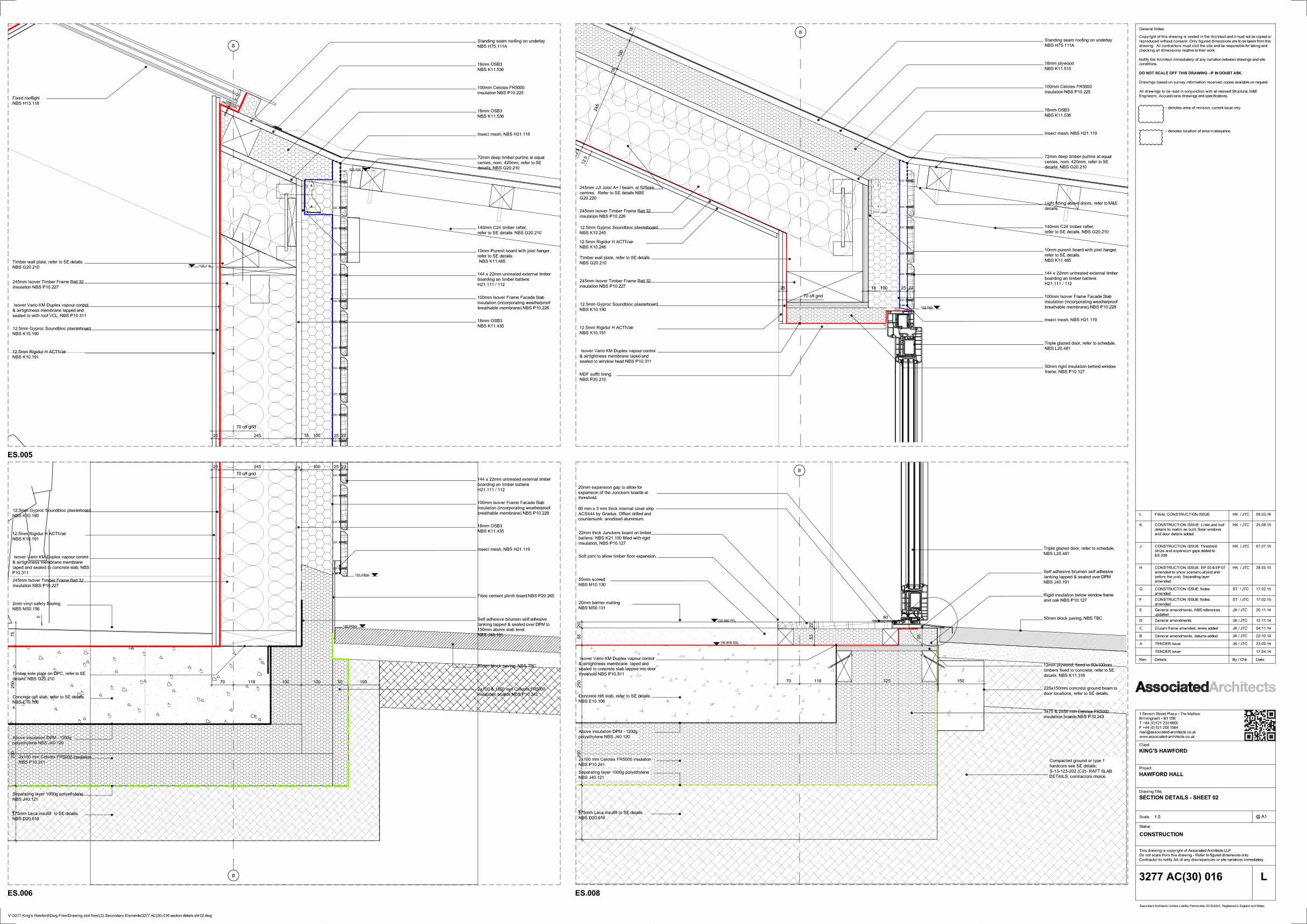 Roof: Follansbee KlassicKolors Standing Seam roofing system on Geotextile underlay, on 18mm OSB3 board, on 100mm Celotex FR5000 Insulation, on 18mm OSB3 Board, on 245mm JJI Joist A+ I-beam at 525mm centres. 245mm Isover Timber Frame Batt 32 insulation and Isover Vario KM Duplex vapour control and airtightness membrane, (in the sports hall only, glulam portal truss, set partially into the I-beam zone). Internal lining: 18mm OSB3 board with 40mm thick Ecophon Master SQ XL acoustic panels fixed direct to OSB. U-value: 0.081 W/m2K